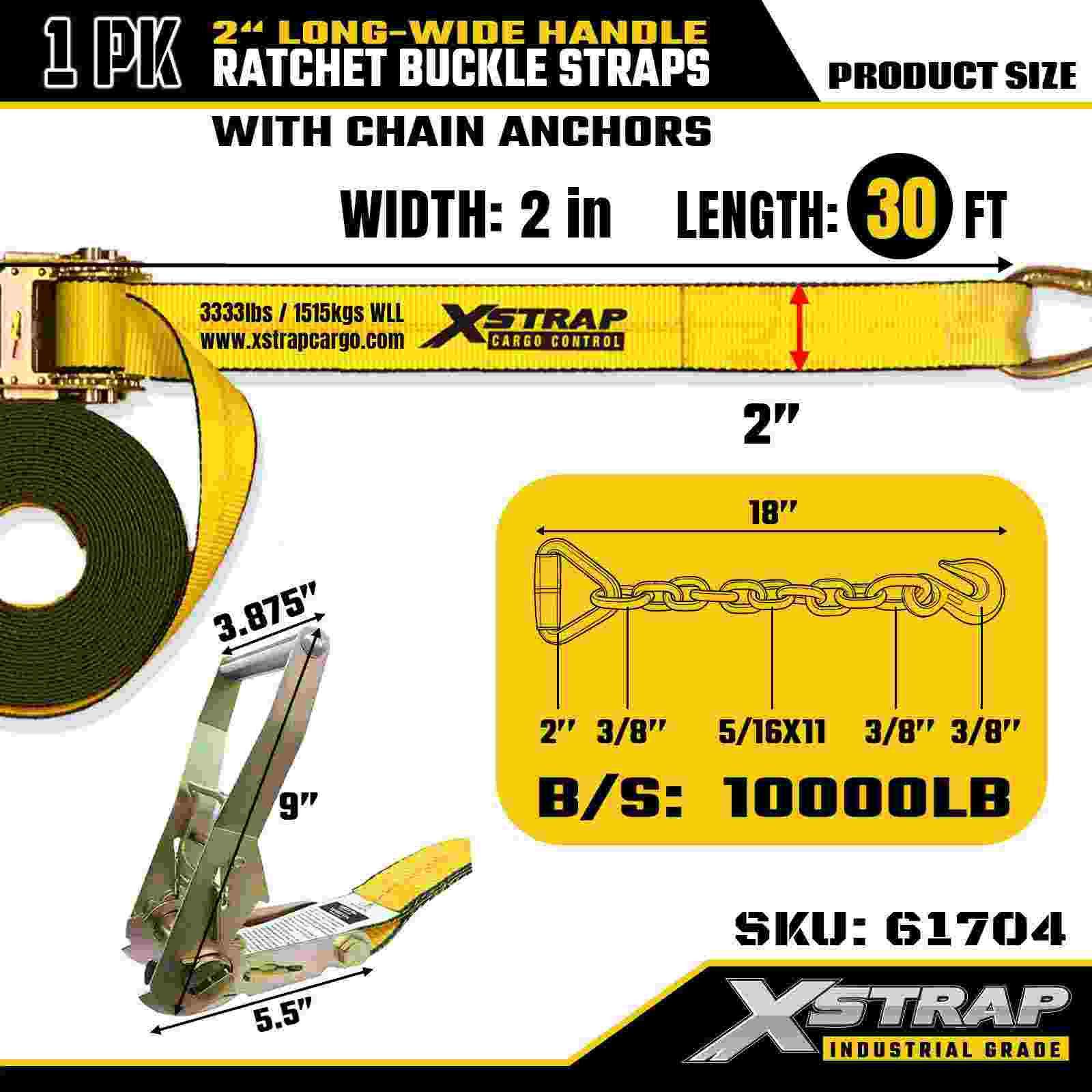 Xstrap 61704 Correias de fivela de catraca com alça longa e larga de 2" x 30 pés (1 pacote) - Ganchos de corrente, resistência à ruptura de 10.000 libras, cinta de amarração resistente para transporte de carga e equipamentos