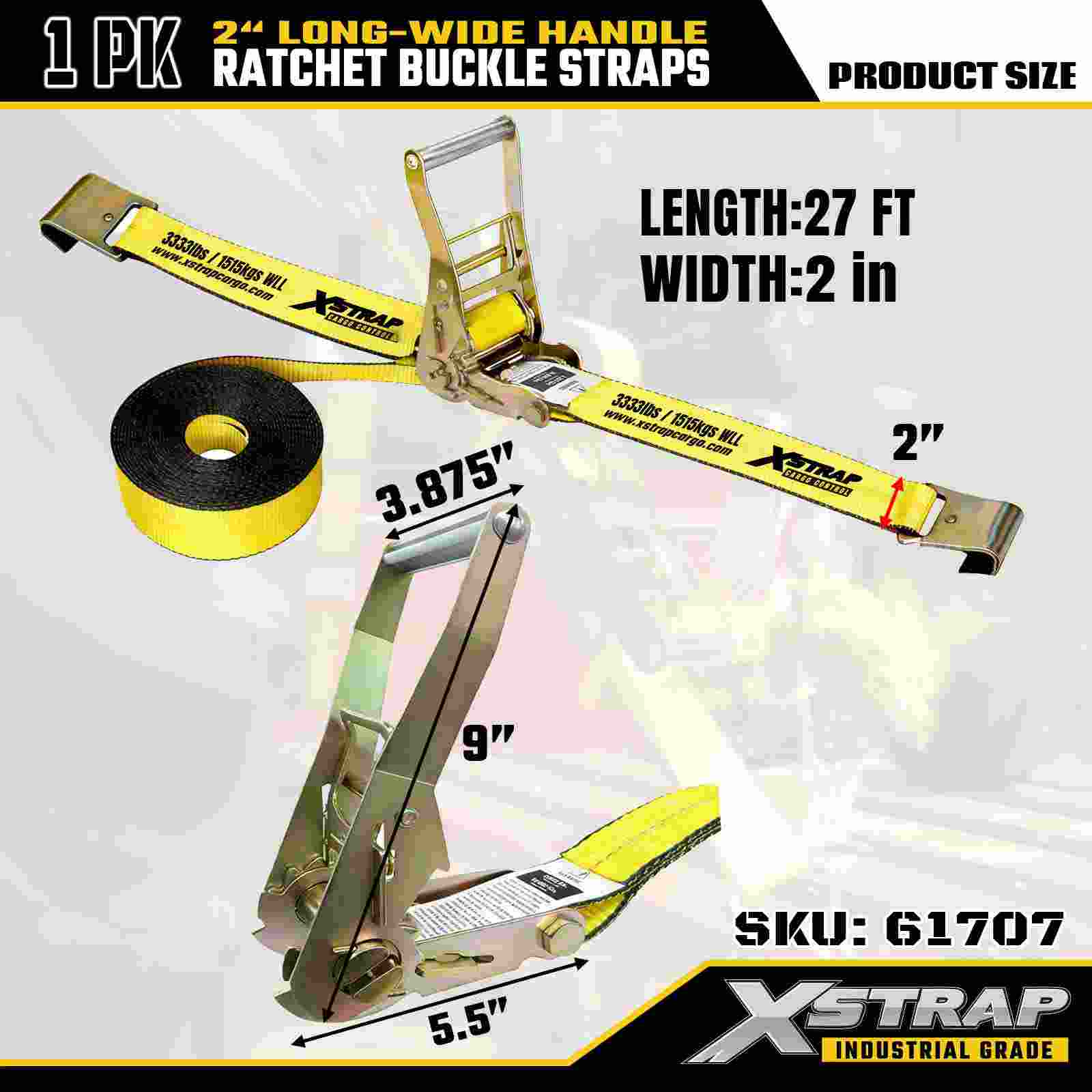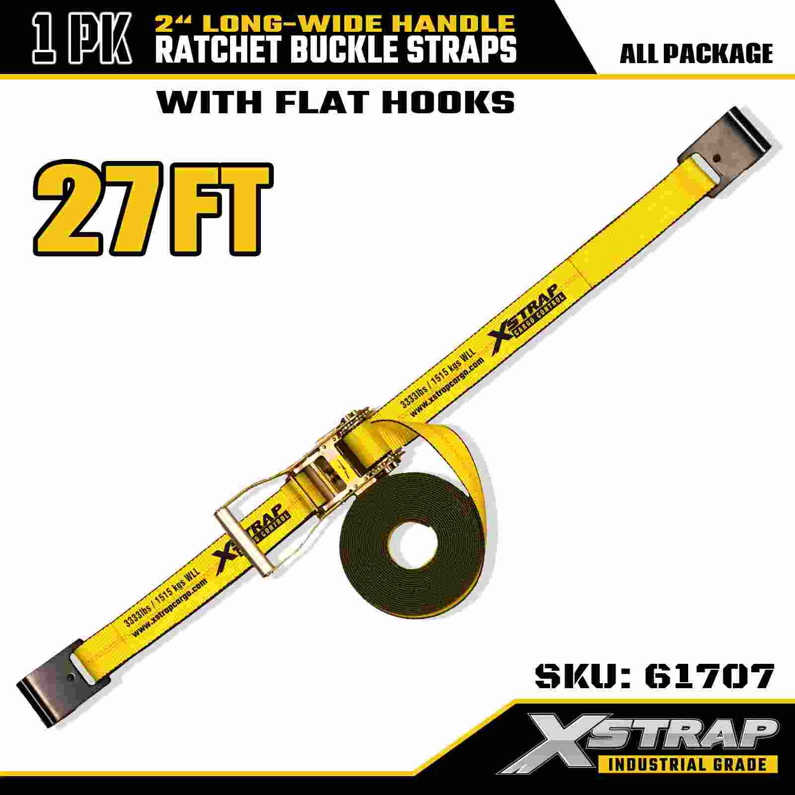 Correia X 61707 Correias de catraca com alça longa e larga de 2" x 27 pés (1 pacote) – Ganchos planos, resistência à ruptura de 10.000 libras, alça de amarração resistente para transporte seguro