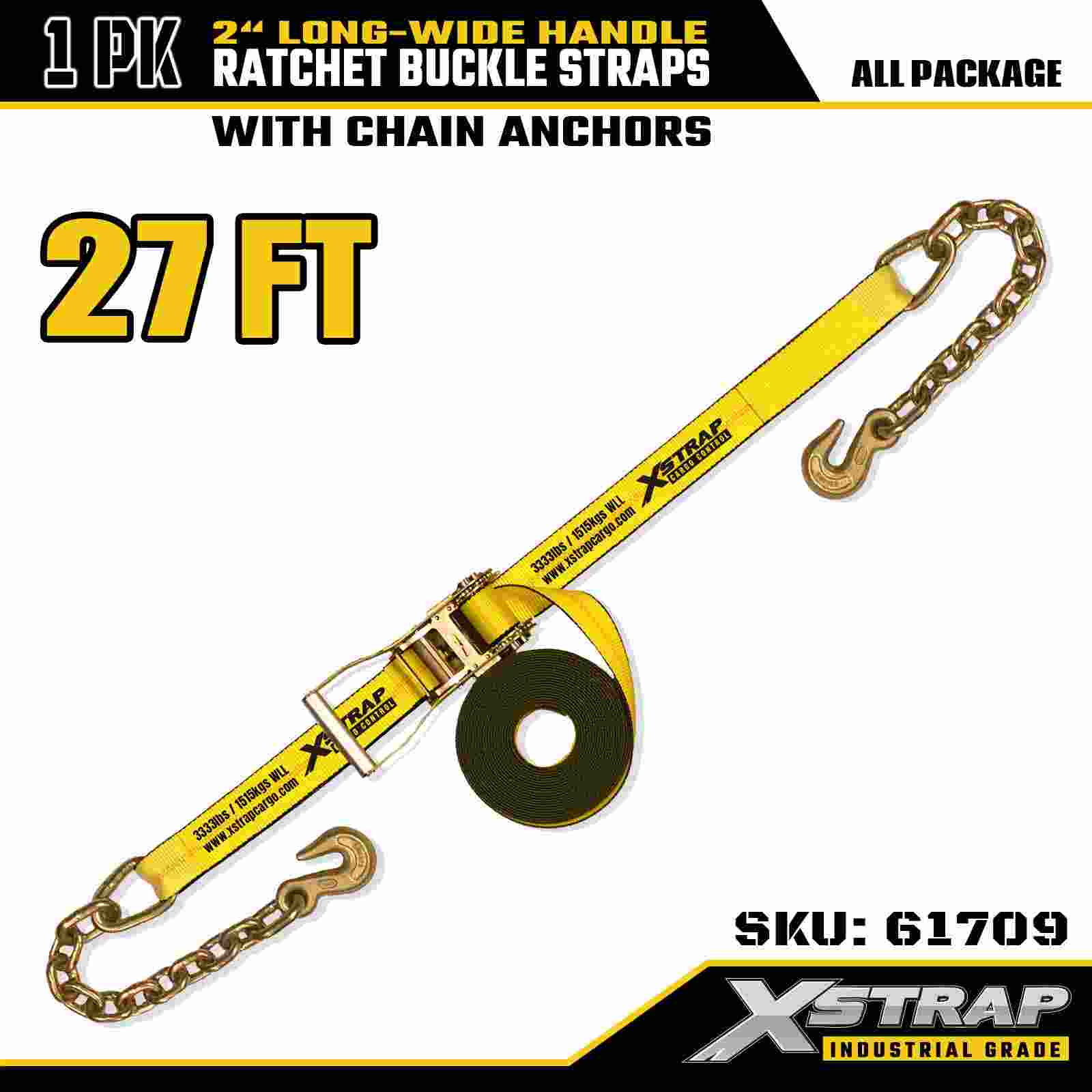 Xstrap 61709 Correias de fivela de catraca com alça longa e larga de 2" x 27 pés (1 pacote) com Ganchos de corrente, resistência à ruptura de 10.000 libras, alça de amarração resistente para transporte seguro