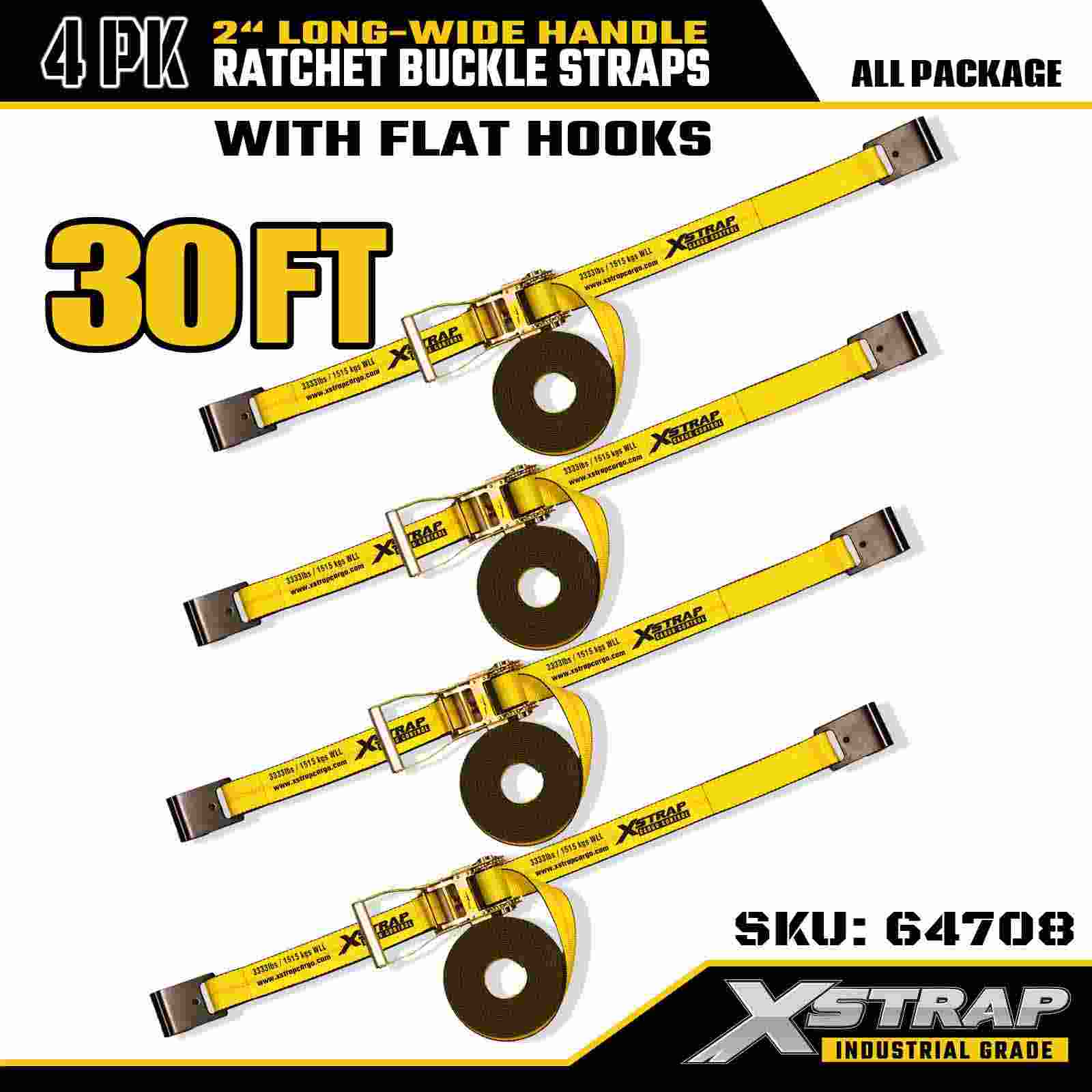 Xstrap 64708 Correias de fivela de catraca com alça estendida de 2" x 30 pés (pacote com 4) - Ganchos planos, resistência nominal de 10.000 libras, solução de controle de carga industrial