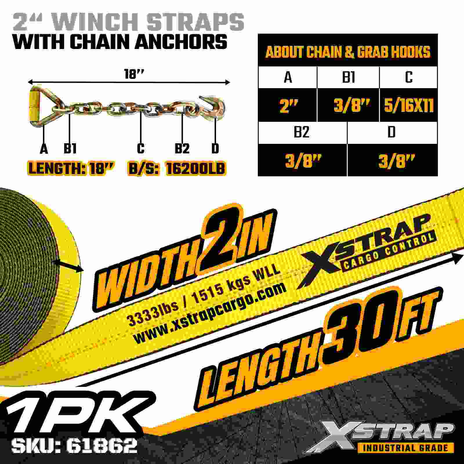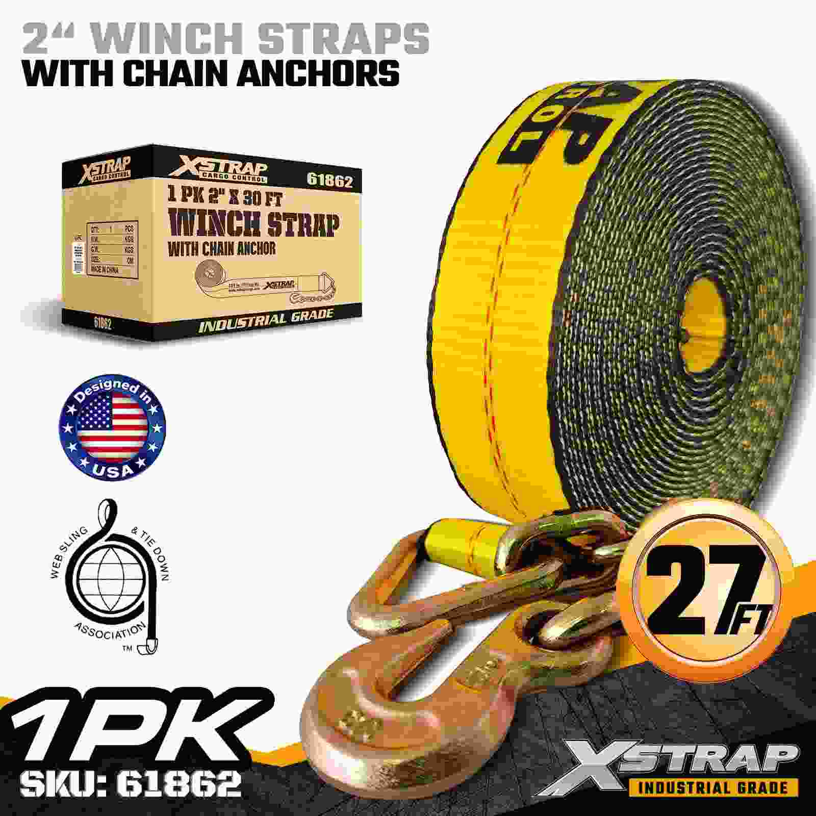 A cinta de guincho padrão Xstrap 61862 de 2" x 30 pés foi construída para fixação confiável de carga plana, apresentando âncoras de corrente duráveis e correias de poliéster de alta resistência. Com um limite de carga de trabalho de 3.333 libras e resistência à ruptura de 10.000 libras, ela fornece desempenho confiável para transporte diário de carga, cargas de paletes, madeira serrada, tubos e aplicações de logística geral.