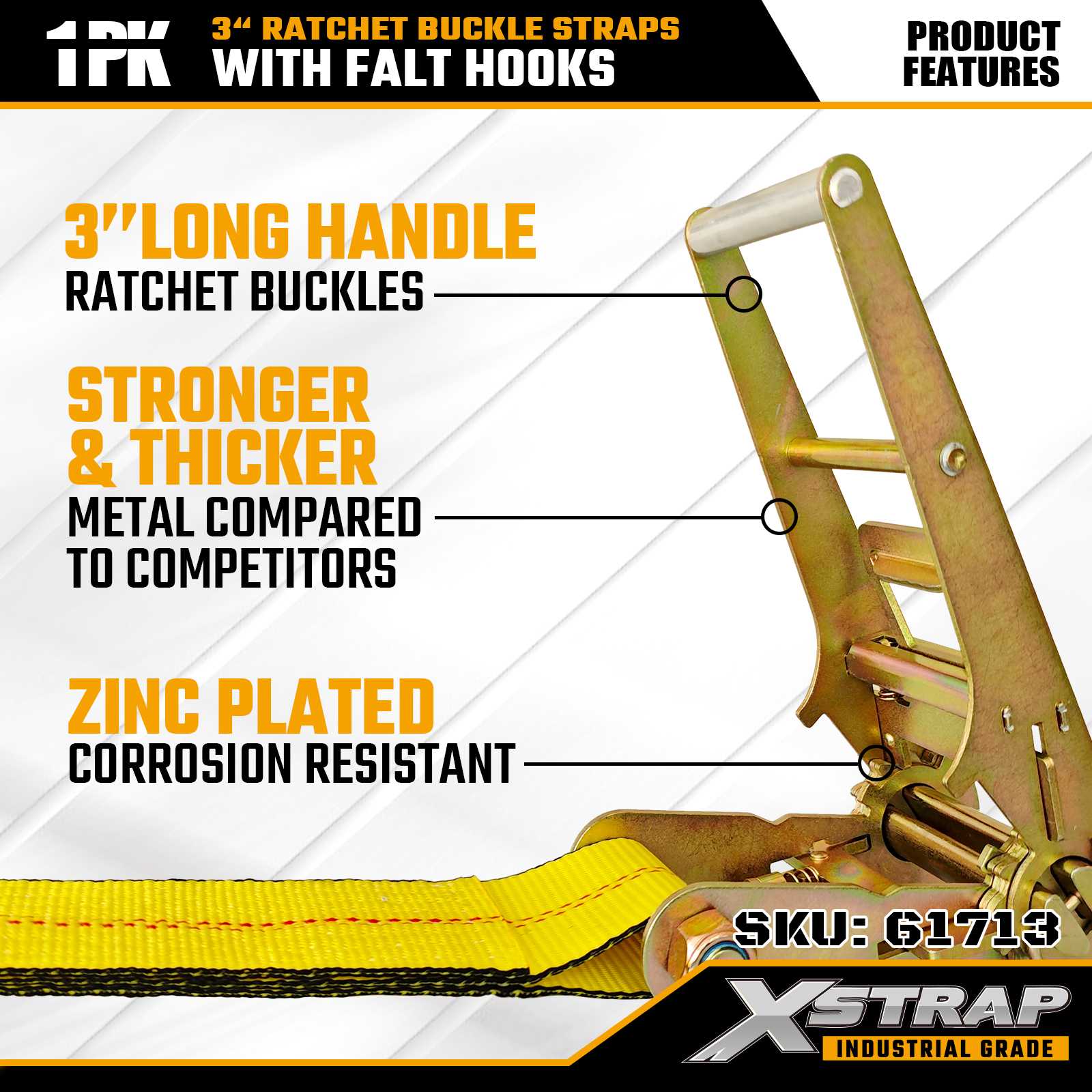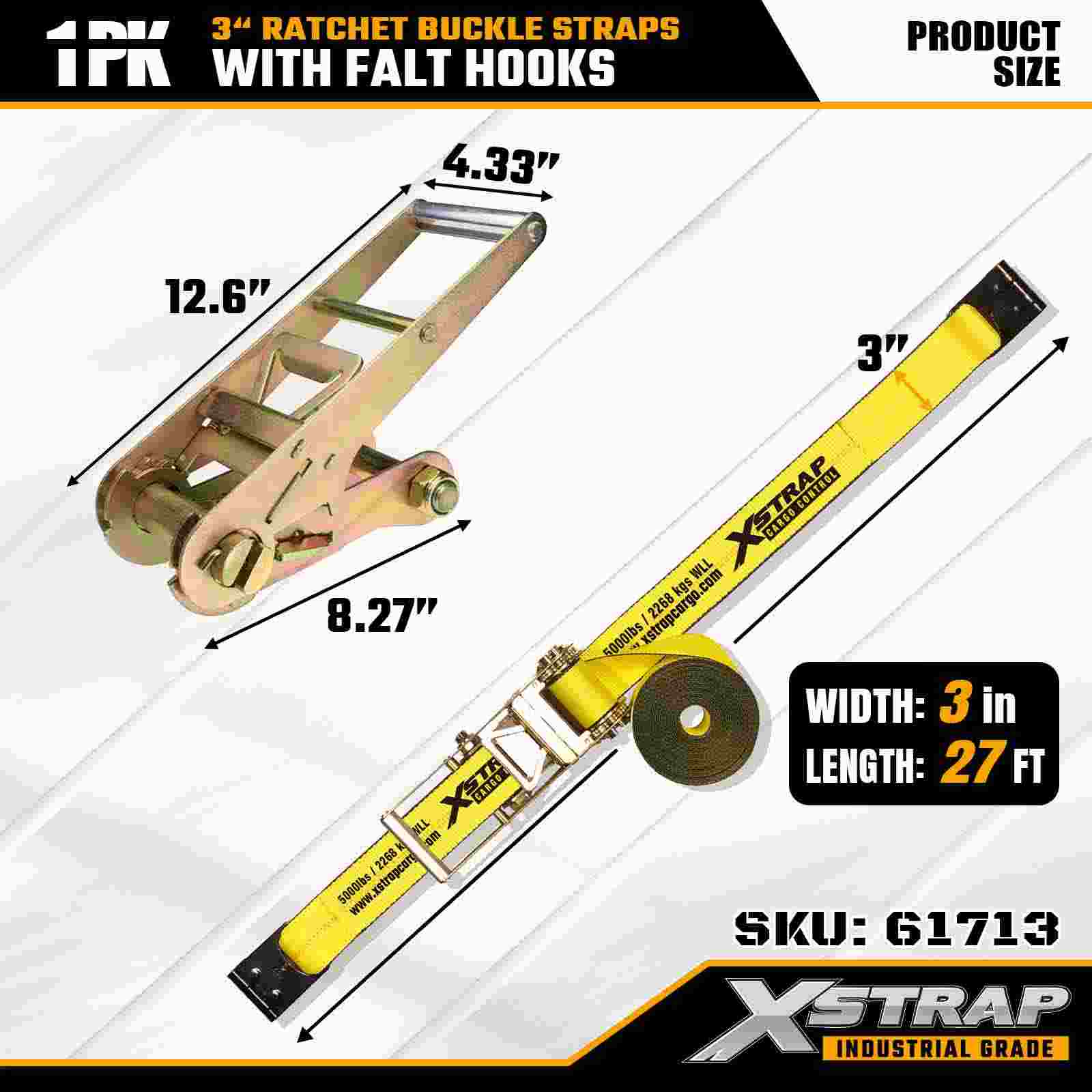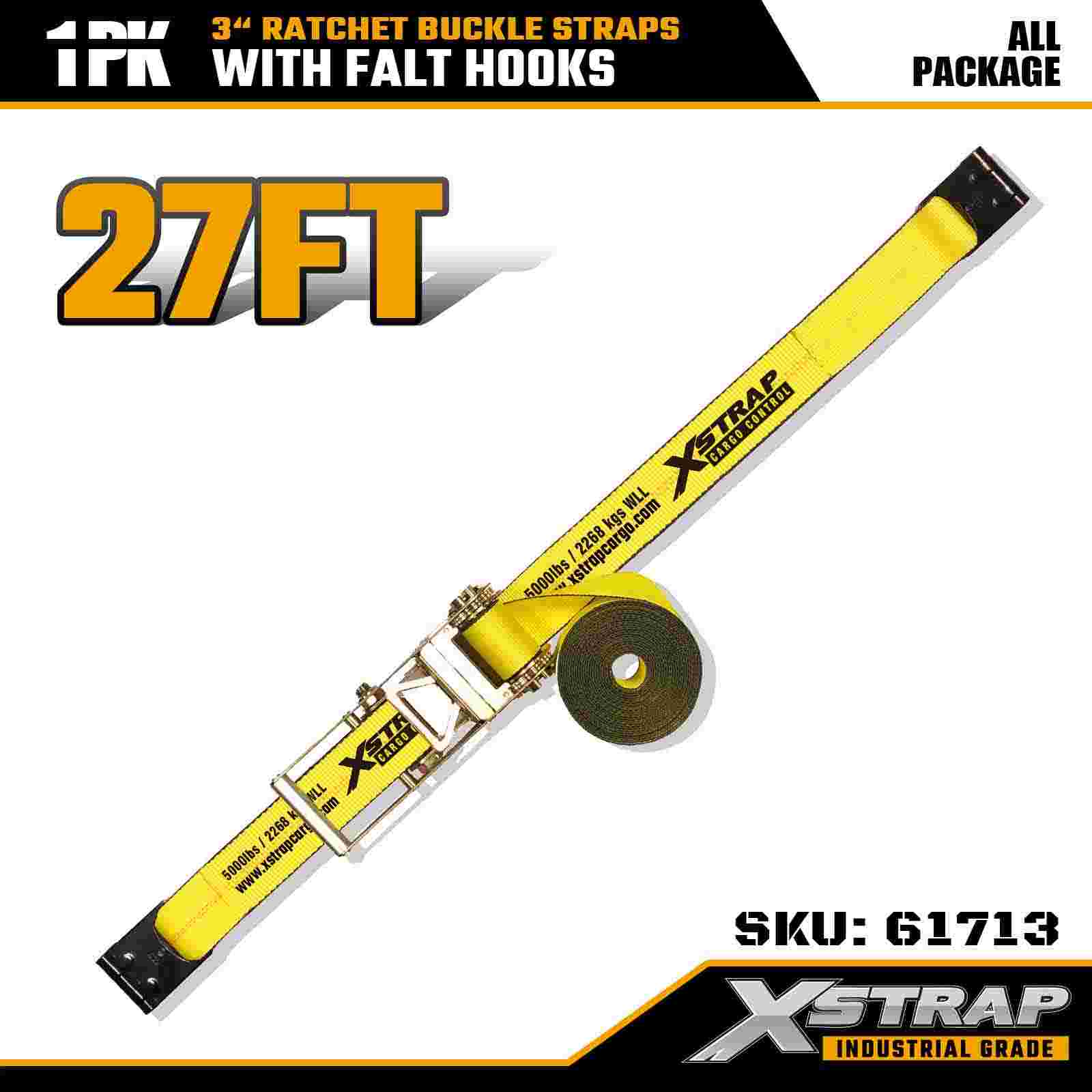 Xstrap 61713 Correias de fivela de catraca de 3" x 27 pés (1 pacote) Ganchos planos, capacidade de carga de 5.000 libras, resistência à ruptura de 15.000 libras, amarração resistente para caminhões, reboques e transporte de carga industrial.