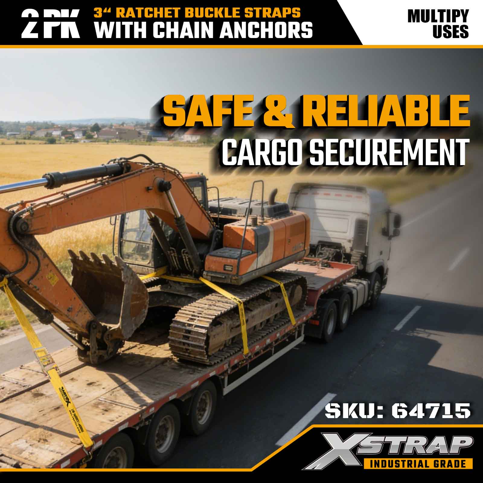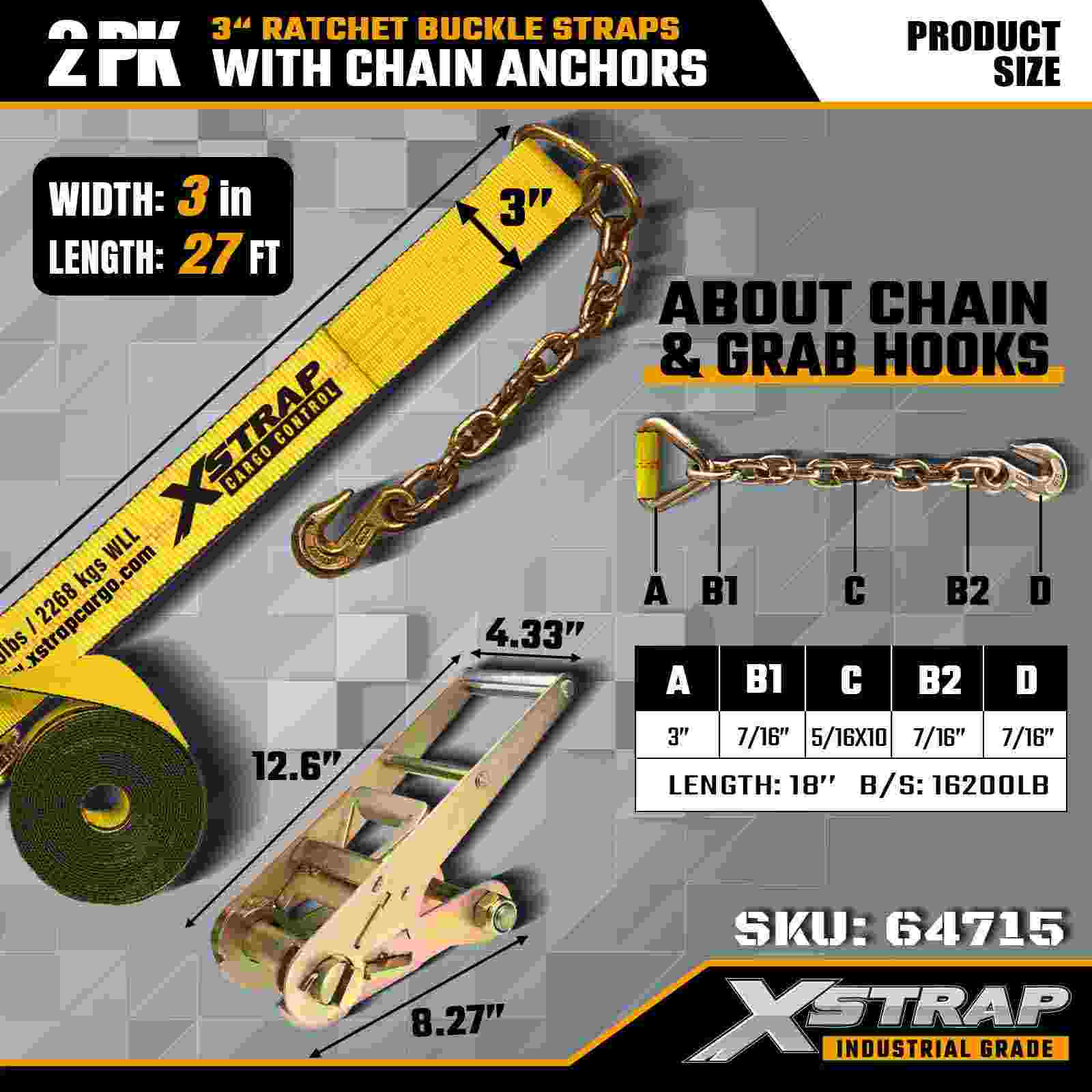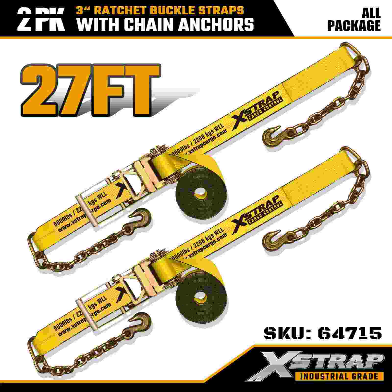 Xstrap 64715 Correias de fivela de catraca de 3" × 27 pés (pacote com 2) - equipadas com âncoras de corrente para serviços pesados, projetadas para ambientes de carga exigentes. Com um limite de carga de trabalho de 5.000 libras e resistência à ruptura de 15.000 libras, essas correias oferecem desempenho de amarração seguro, estável e de nível profissional para mesas planas, transporte de máquinas e transporte industrial.