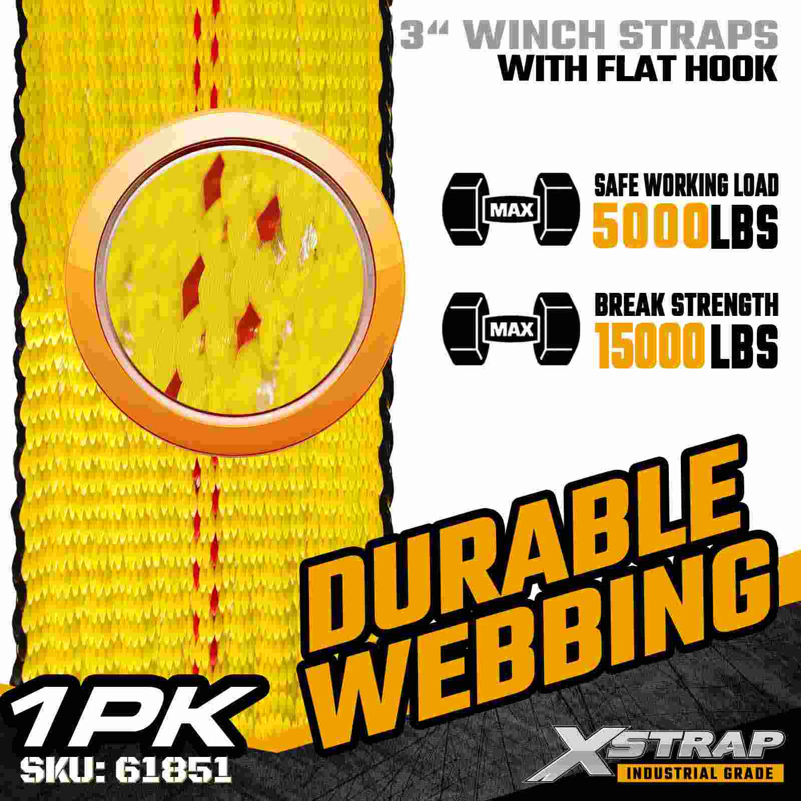 A cinta de guincho padrão Xstrap 61851 de 3" × 30 pés é uma cinta de fixação de carga resistente projetada para reboques planos e transporte de alta capacidade. Apresentando um gancho plano reforçado e uma cinta de poliéster extra larga de 3 polegadas, esta cinta de guincho de 3 polegadas oferece um limite de carga de trabalho de 5.000 libras e resistência à ruptura de 15.000 libras. É ideal para proteger madeira serrada, aço, máquinas e cargas industriais durante transporte exigente operações.