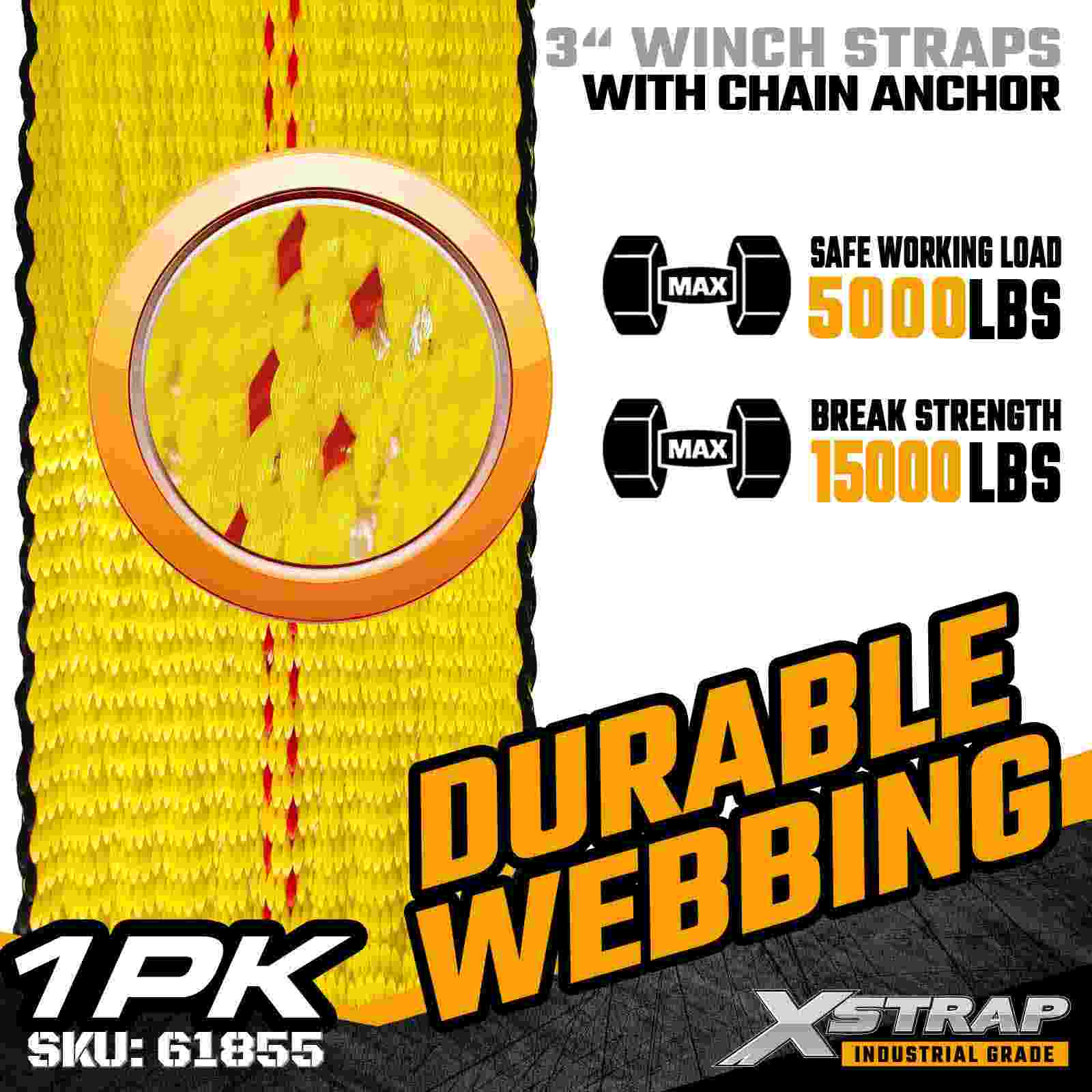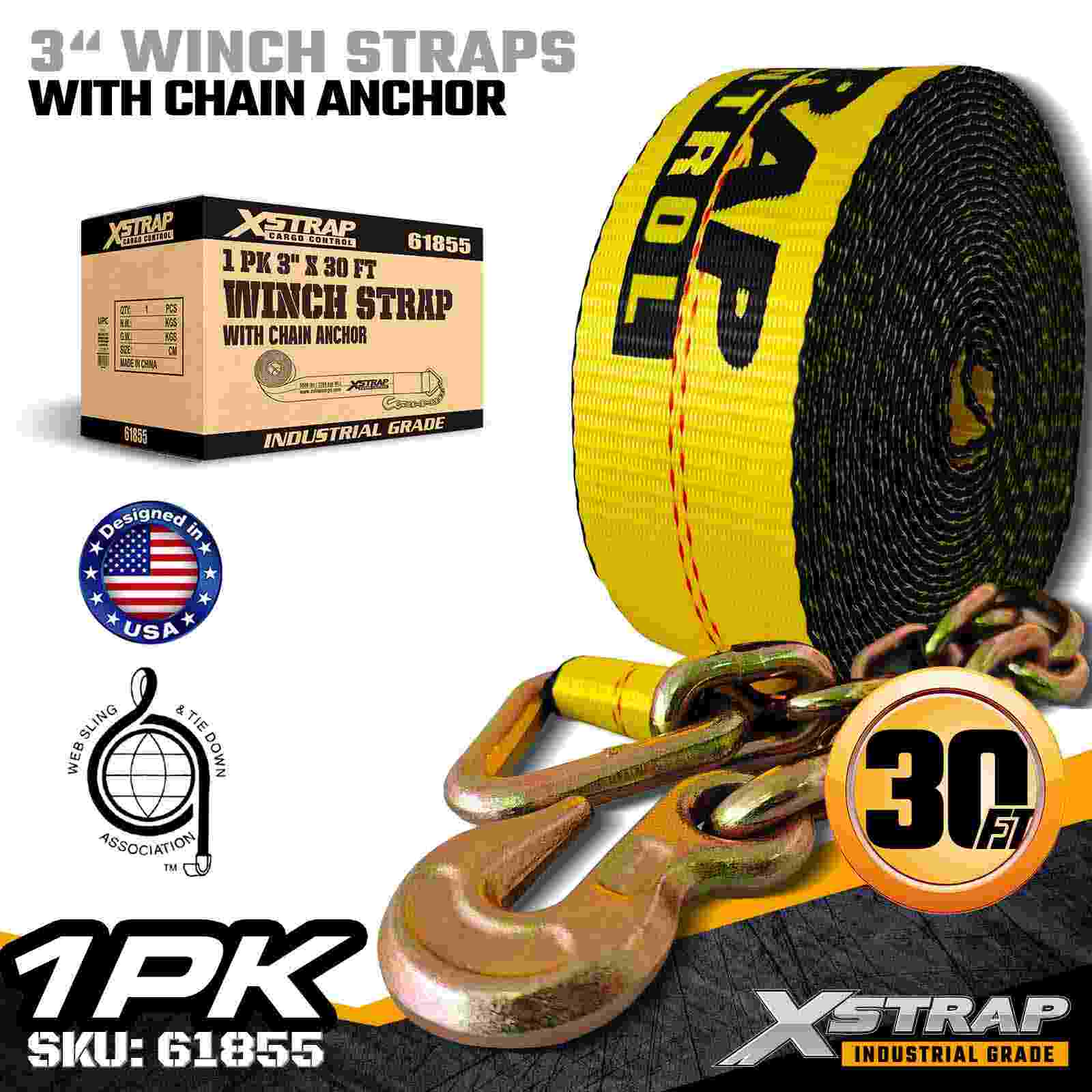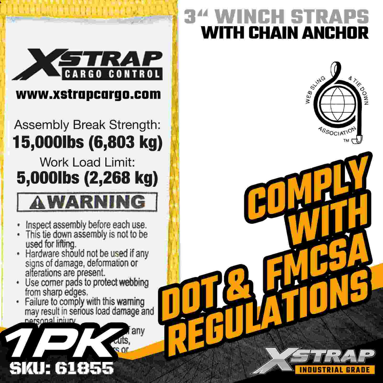 A cinta de guincho padrão Xstrap 61855 de 3" × 30 pés é uma cinta de fixação de carga industrial resistente projetada para reboques planos e cargas de grandes dimensões. Equipada com uma âncora de corrente forjada e uma cinta de poliéster extra larga de 3 polegadas, esta cinta de guincho de 3 polegadas oferece um limite de carga de trabalho de 5.000 libras e resistência à ruptura de 15.000 libras. O comprimento estendido de 30 pés a torna ideal para proteger mais larga, mais alta ou cargas de formato irregular que exigem alcance e estabilidade adicionais.