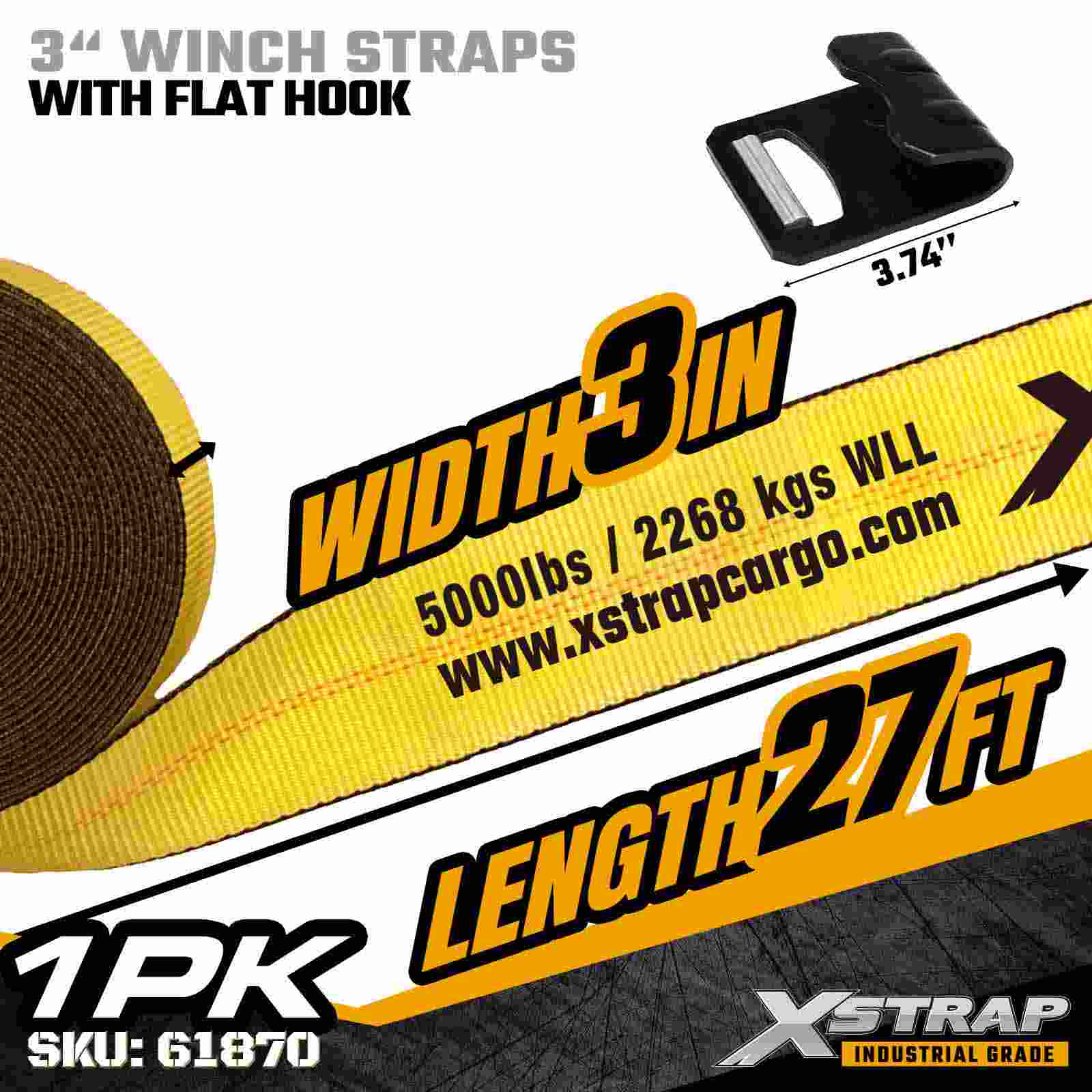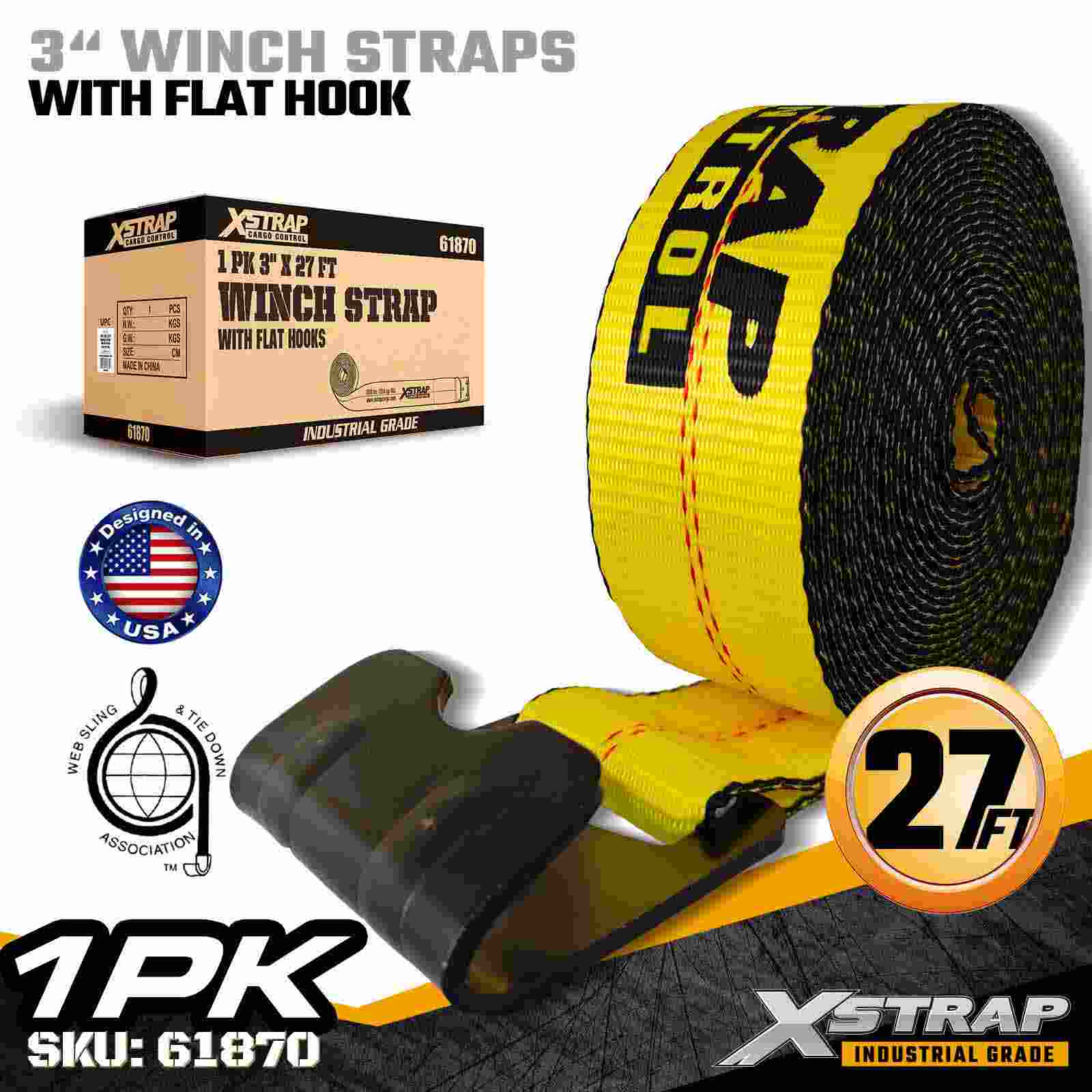 A cinta de guincho padrão Xstrap 61870 de 3" x 27 pés é uma cinta de fixação de carga resistente projetada para reboques planos e transporte de alta capacidade. Apresentando um gancho plano reforçado e uma cinta de poliéster extra larga de 3 polegadas, esta cinta de guincho de 3 polegadas oferece um limite de carga de trabalho de 5.000 libras e resistência à ruptura de 15.000 libras. É ideal para proteger madeira, aço, máquinas e cargas industriais durante transportes exigentes operações.