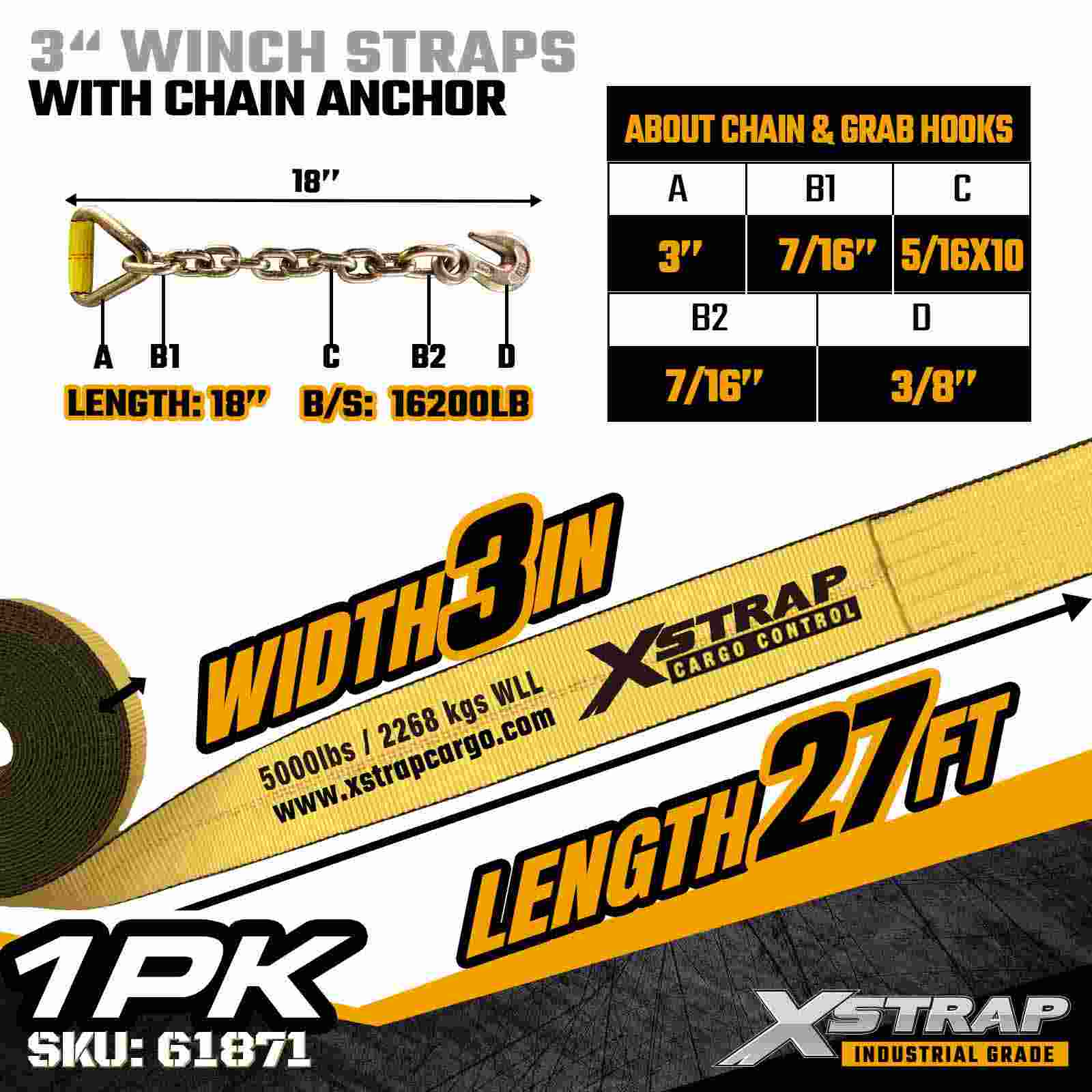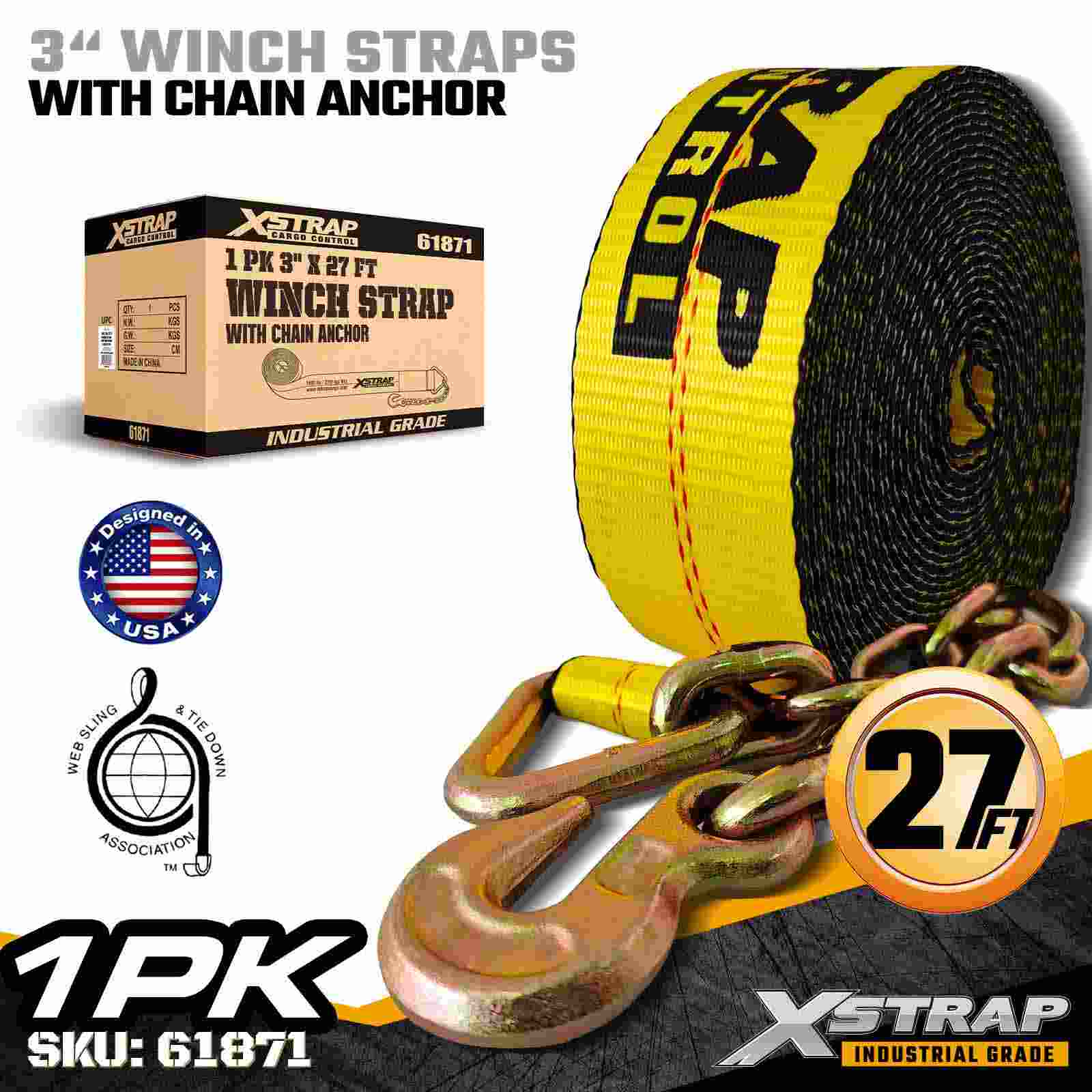 A cinta de guincho padrão Xstrap 61871 de 3" x 27 pés foi projetada para fixação de carga pesada em reboques planos. Apresentando uma âncora de corrente forjada e uma cinta de poliéster extra larga de 3 polegadas, esta cinta de guincho de 3 polegadas oferece um limite de carga de trabalho de 5.000 libras e resistência à ruptura de 15.000 libras. Ela foi projetada para aplicações industriais exigentes onde são necessárias força de retenção e estabilidade máximas.