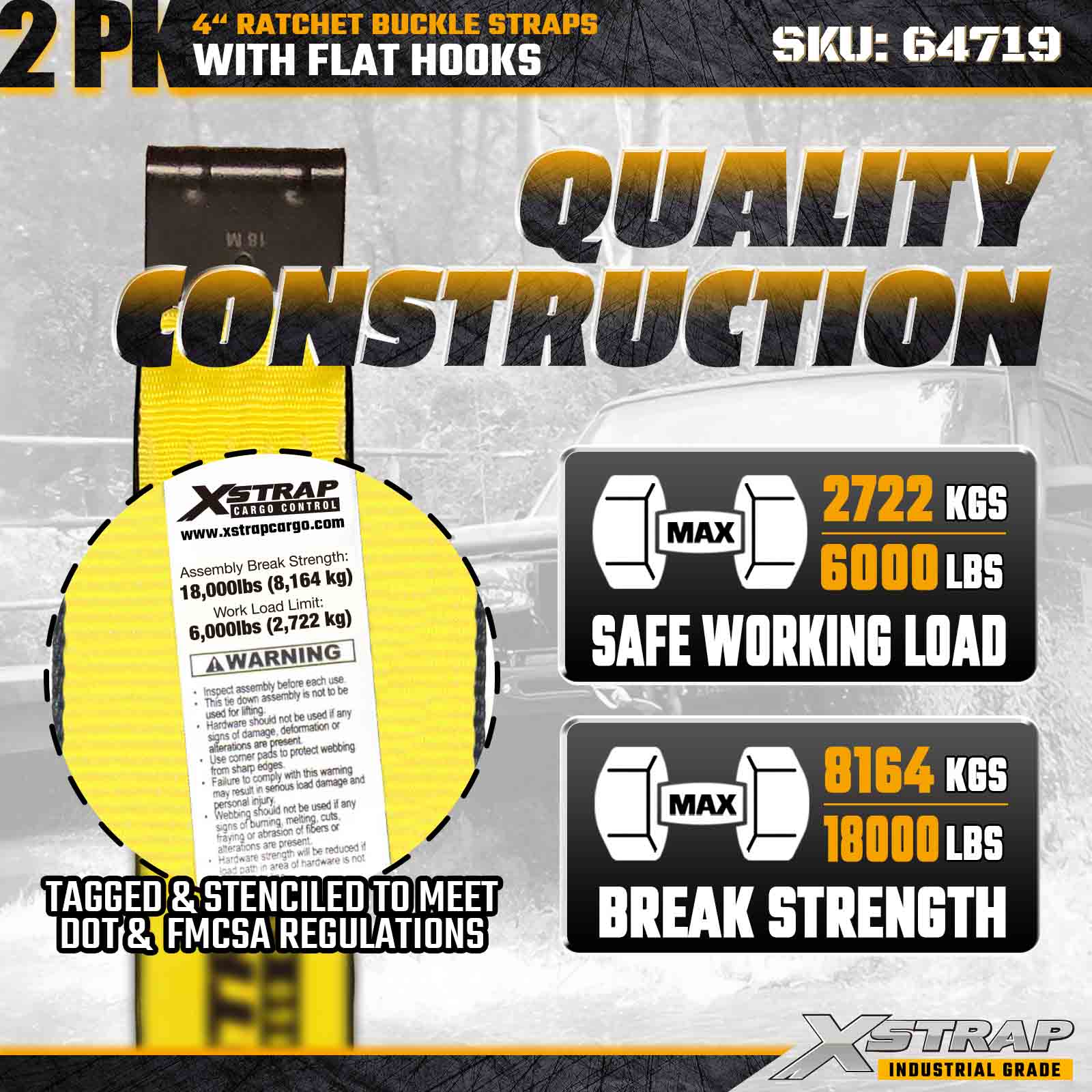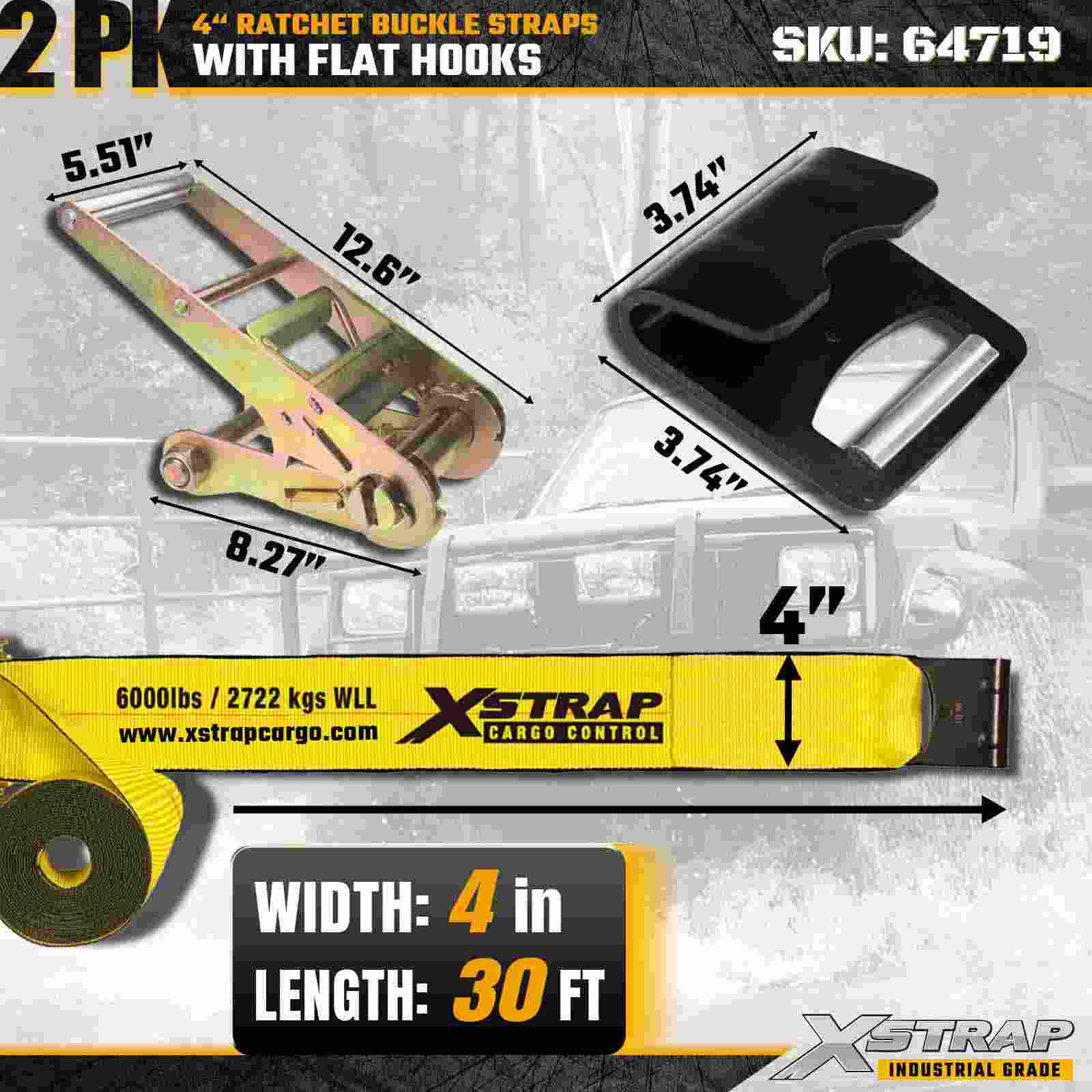 As correias de fivela de catraca Xstrap 64719 de 4" x 30 pés (pacote com 2) oferecem segurança de carga para serviços pesados com ganchos planos reforçados e um mecanismo de catraca durável. Avaliadas em 6.000 libras de WLL e 18.000 libras de resistência à ruptura, elas são ideais para transporte de plataforma, transporte de máquinas e aplicações de carga industrial.
