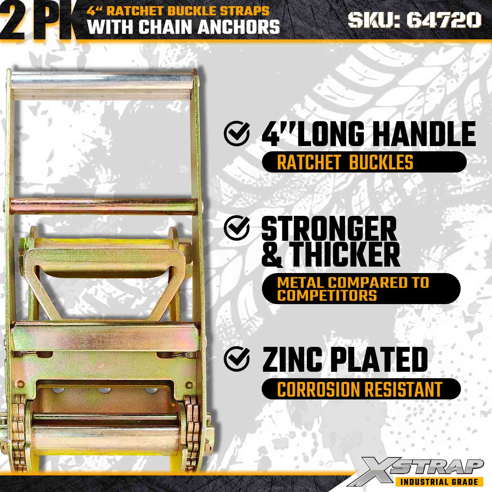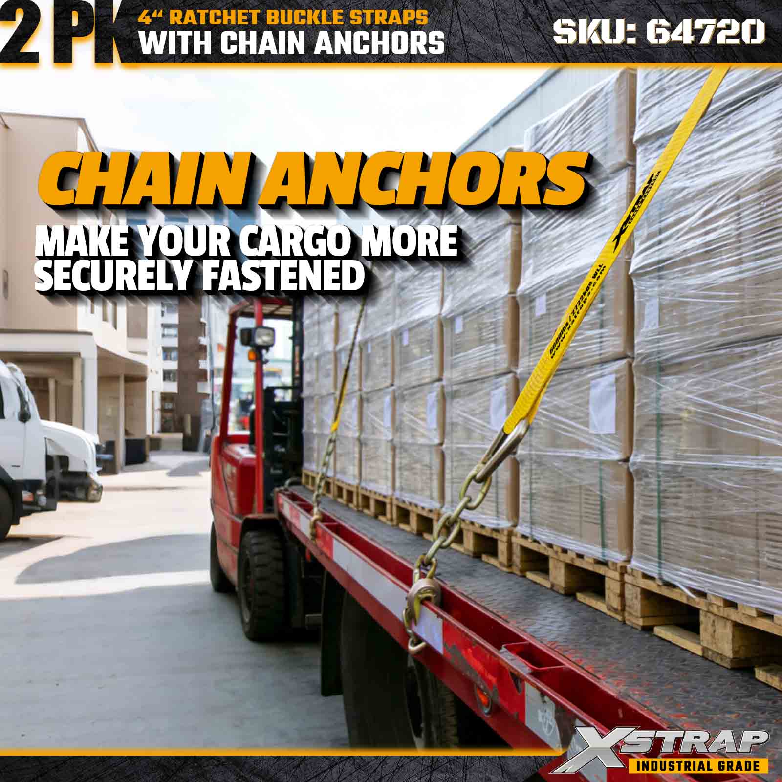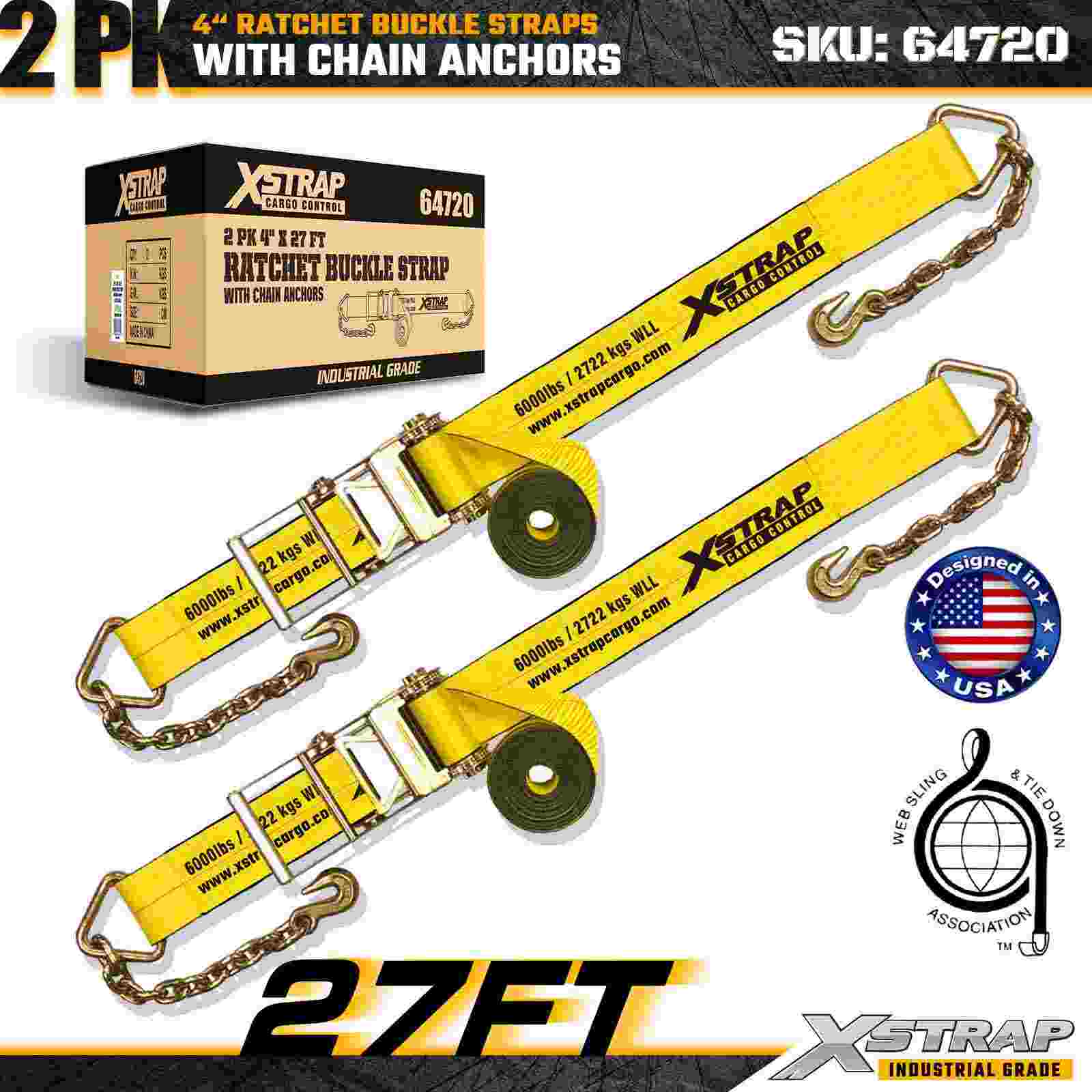 As tiras de fivela de catraca Xstrap 64720 de 4" x 27 pés (pacote com 2) são projetadas para fixação de carga pesada, apresentando âncoras de corrente robustas e um mecanismo de catraca reforçado. Com um limite de carga de trabalho de 6.000 libras e resistência à ruptura de 18.000 libras, essas tiras são ideais para transporte de mesa, transporte de máquinas, cargas de aço e aplicações de carga industrial que exigem máxima resistência e confiabilidade.