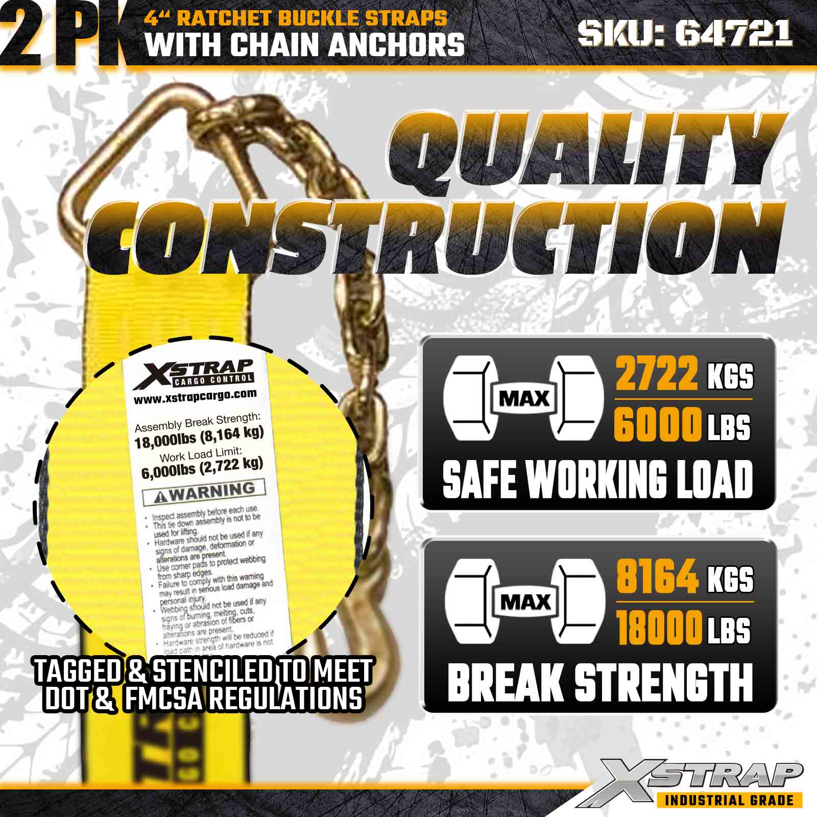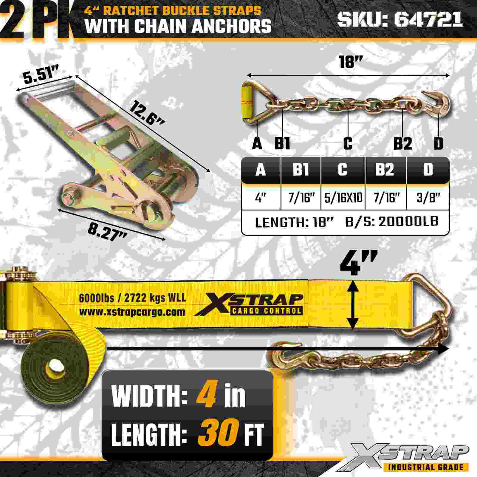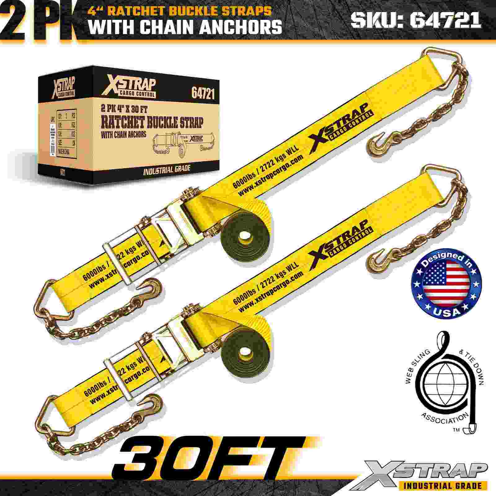 As tiras de fivela de catraca Xstrap 64721 de 4" x 30 pés (pacote com 2) são projetadas para fixação de carga pesada, apresentando âncoras de corrente robustas e um mecanismo de catraca reforçado. Com um limite de carga de trabalho de 6.000 libras e resistência à ruptura de 18.000 libras, essas tiras são ideais para transporte de mesa, transporte de máquinas, cargas de aço e aplicações de carga industrial que exigem máxima resistência e confiabilidade.