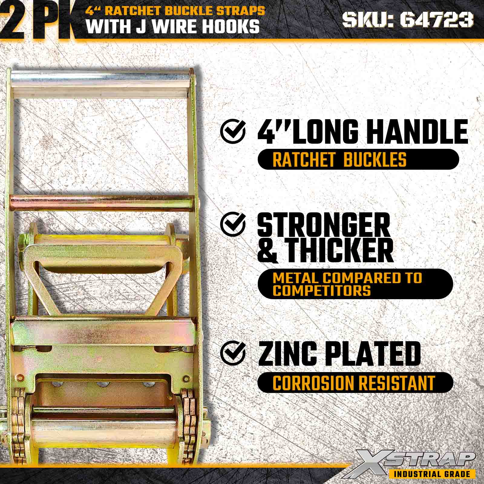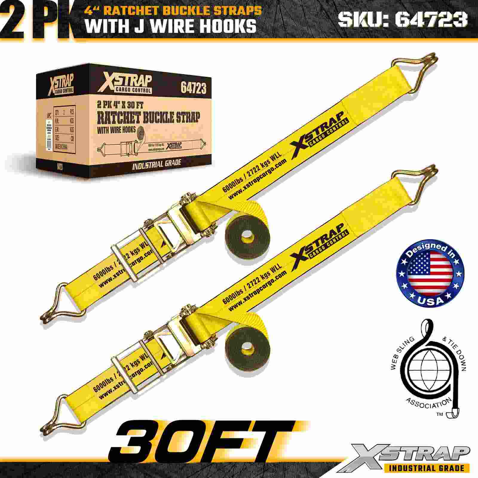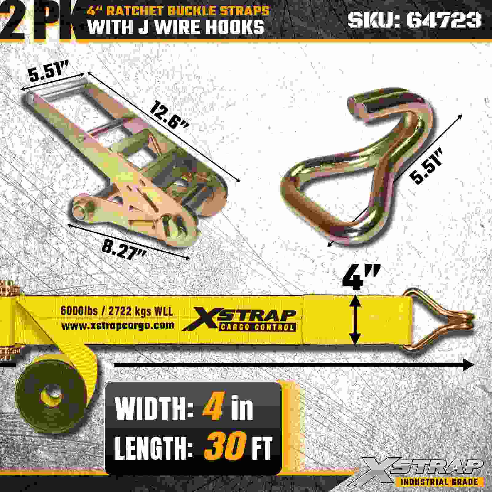 As tiras de fivela de catraca Xstrap 64723 de 4" x 30 pés (pacote com 2) são projetadas para fixação de carga pesada, com ganchos de arame reforçados e um mecanismo de catraca durável. Com um limite de carga de trabalho de 6.000 libras e resistência à ruptura de 18.000 libras, essas tiras são ideais para transporte de mesa, transporte de máquinas, madeira serrada, cargas de aço e aplicações de carga industrial.