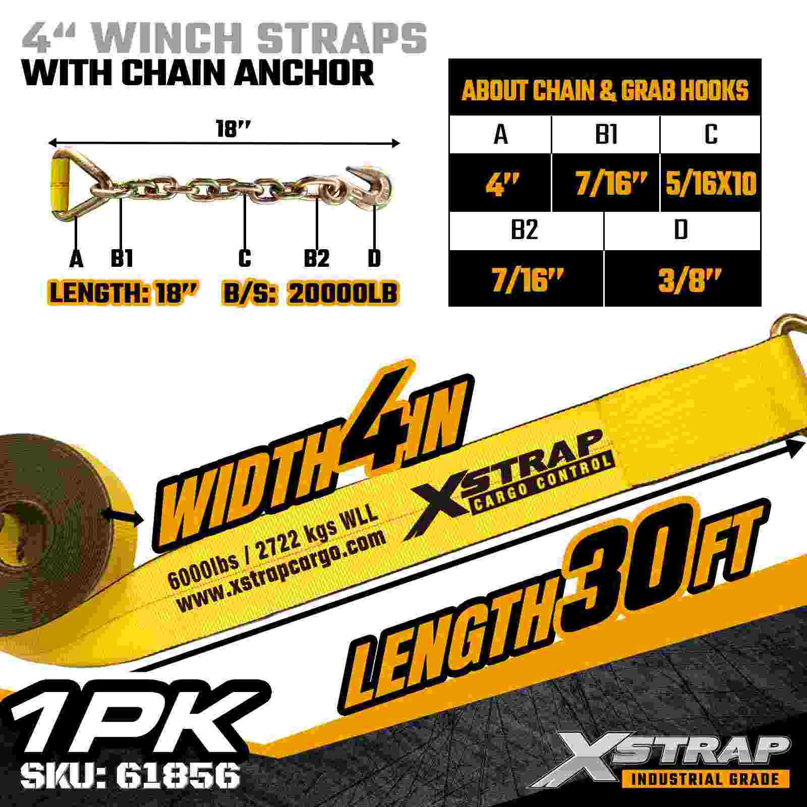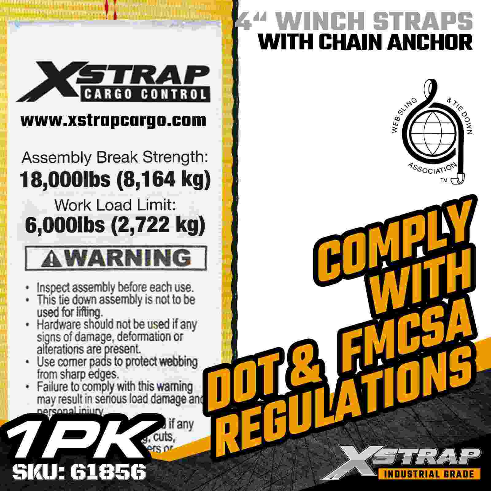 A cinta de guincho padrão Xstrap 61856 de 4" × 30 pés é uma cinta de segurança de carga de alta capacidade e alcance estendido projetada para reboques planos e carga industrial de grandes dimensões. Apresentando uma âncora de corrente forjada e uma cinta de poliéster ultralarga de 4 polegadas, esta cinta de guincho de 4 polegadas oferece um limite de carga de trabalho de 6.000 libras e resistência à ruptura de 18.000 libras. O comprimento estendido de 30 pés fornece alcance adicional para proteger largura, altura, ou cargas de formato irregular que exigem máxima resistência e estabilidade.