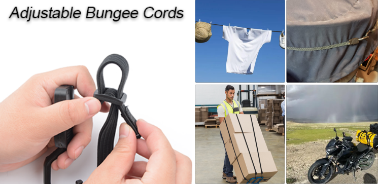 As cordas elásticas ajustáveis oferecem maior estabilidade e menor tendência de cavar nos itens. Eles são versáteis e adequados para uma ampla gama de aplicações, incluindo equipamentos, organização de armazenamento, amarração de bagagem ou lonas, equipamentos seguros para atividades ao ar livre, jardim, garagem ou aplicações de viagem.
