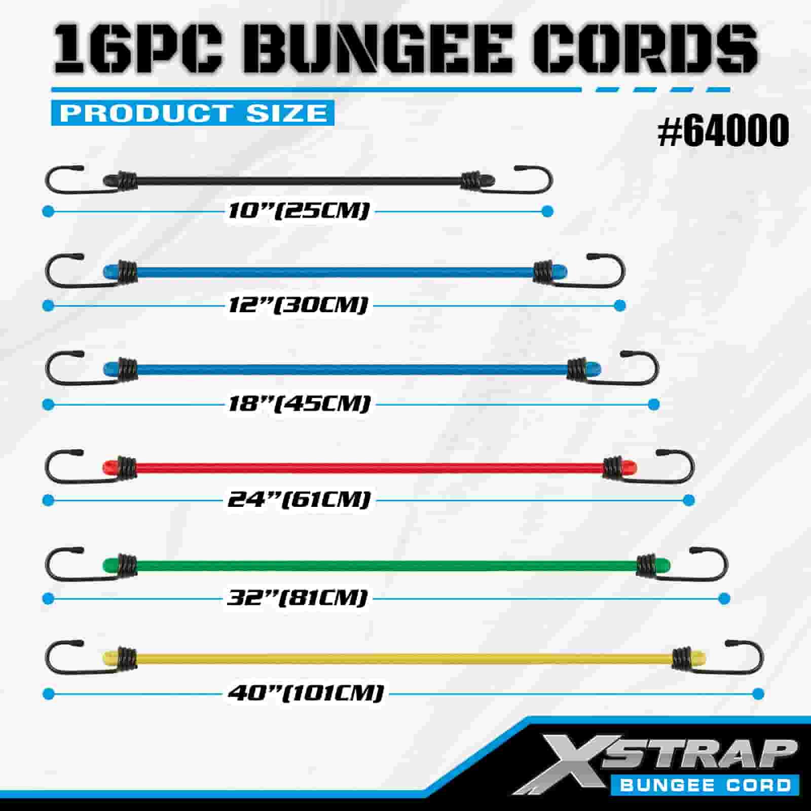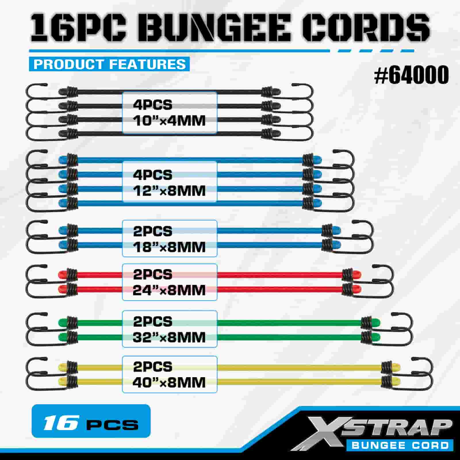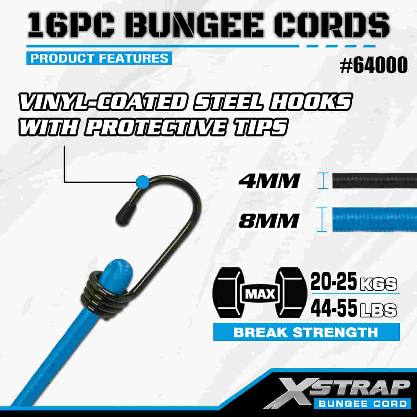 Conjunto de cordas elásticas Xstrap 16PK 16PK 8mm x 12"/18"/24"/ 32"/40"; 4mm x 10" MINI Bungee, resistência à ruptura de 44-55 libras com ganchos de aço revestidos de vinil com pontas protetoras e ganchos de mola padrão.