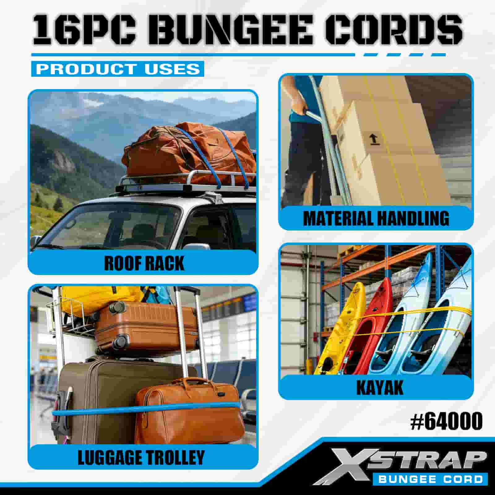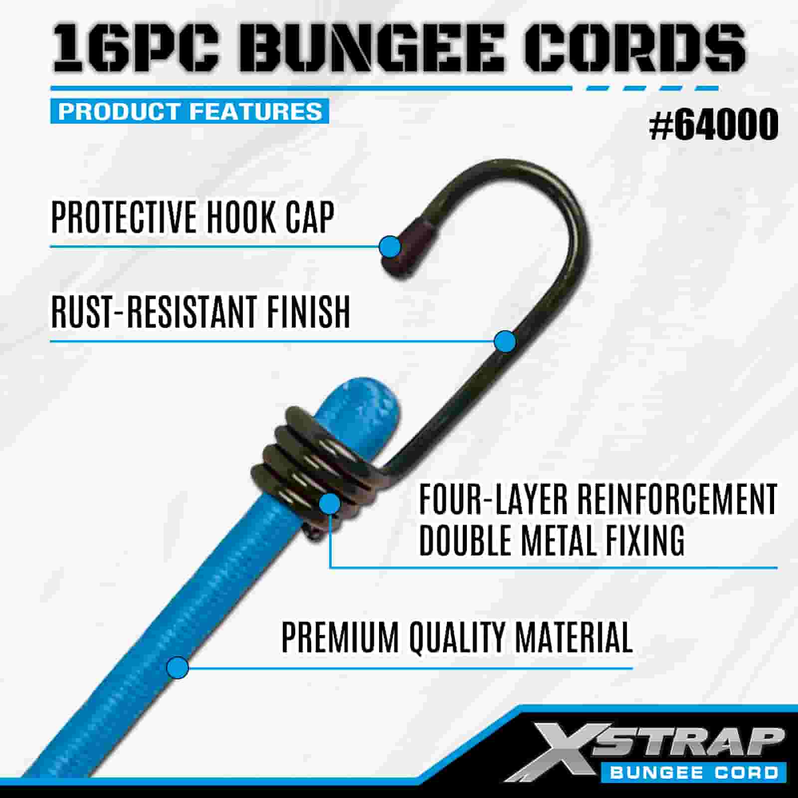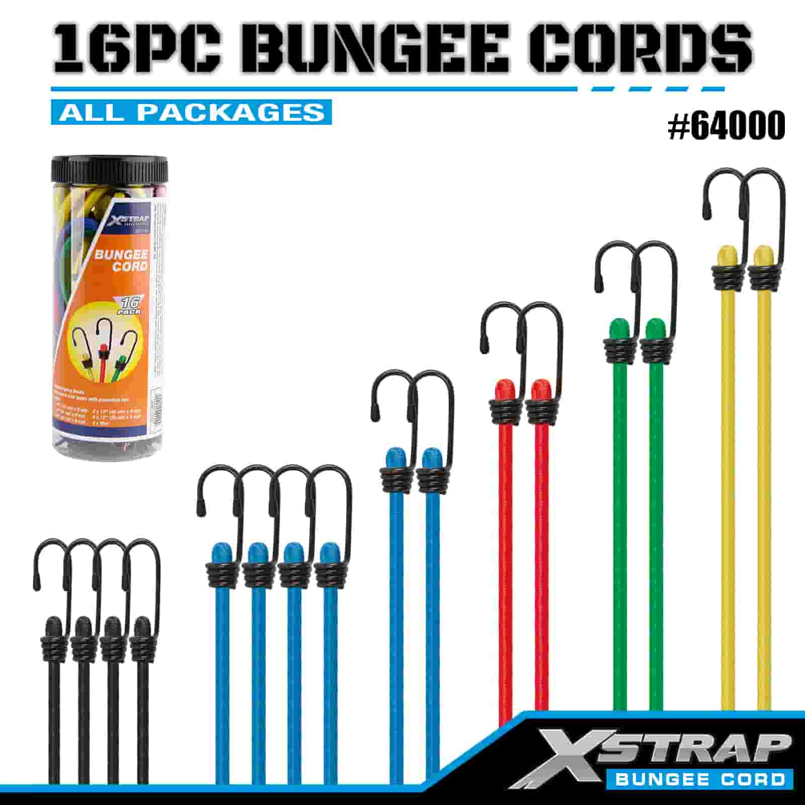 Conjunto de cordas elásticas Xstrap 16PK 16PK 8mm x 12"/18"/24"/ 32"/40"; 4mm x 10" MINI Bungee, resistência à ruptura de 44-55 libras com ganchos de aço revestidos de vinil com pontas protetoras e ganchos de mola padrão.
