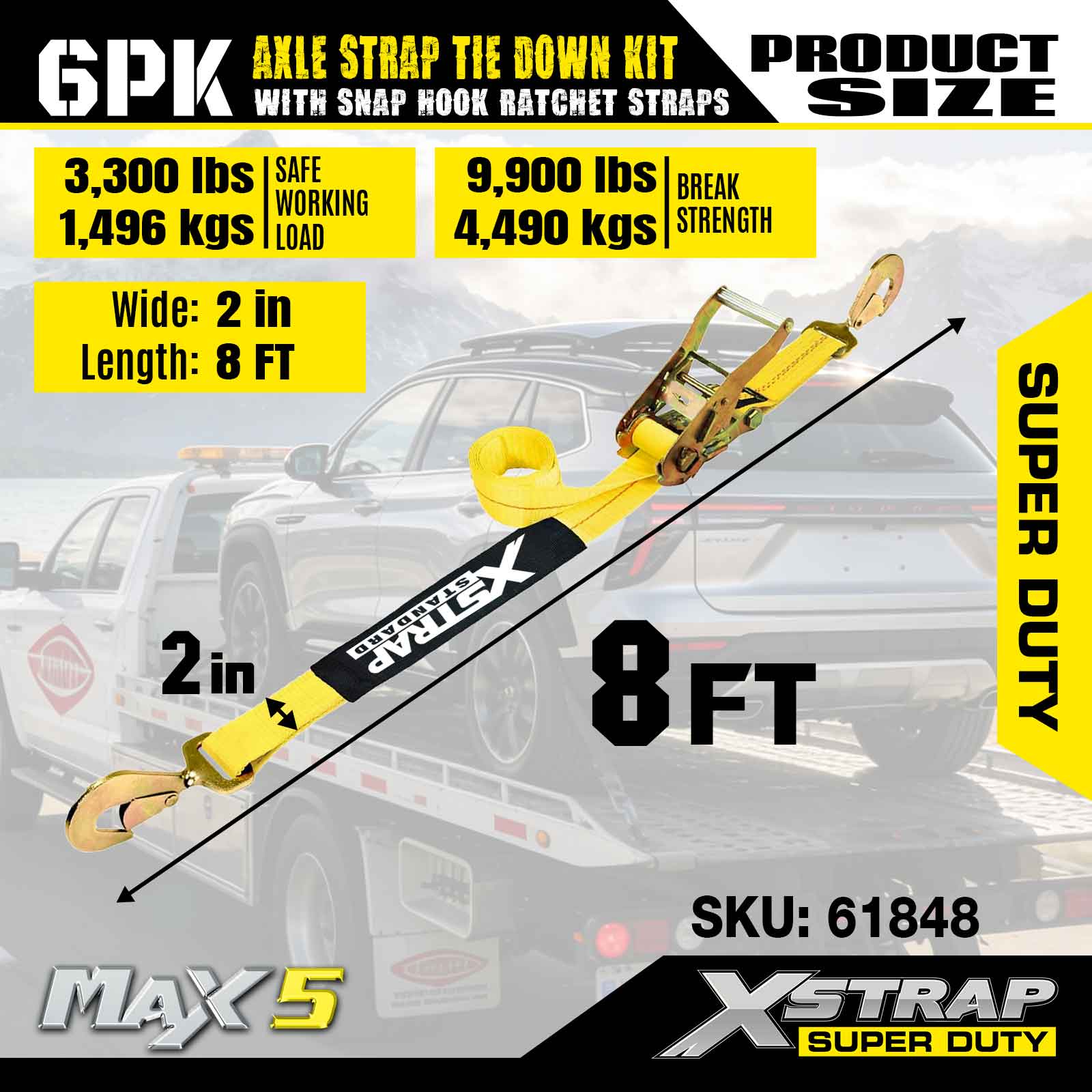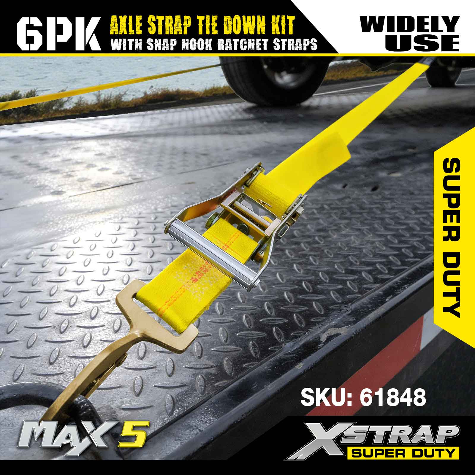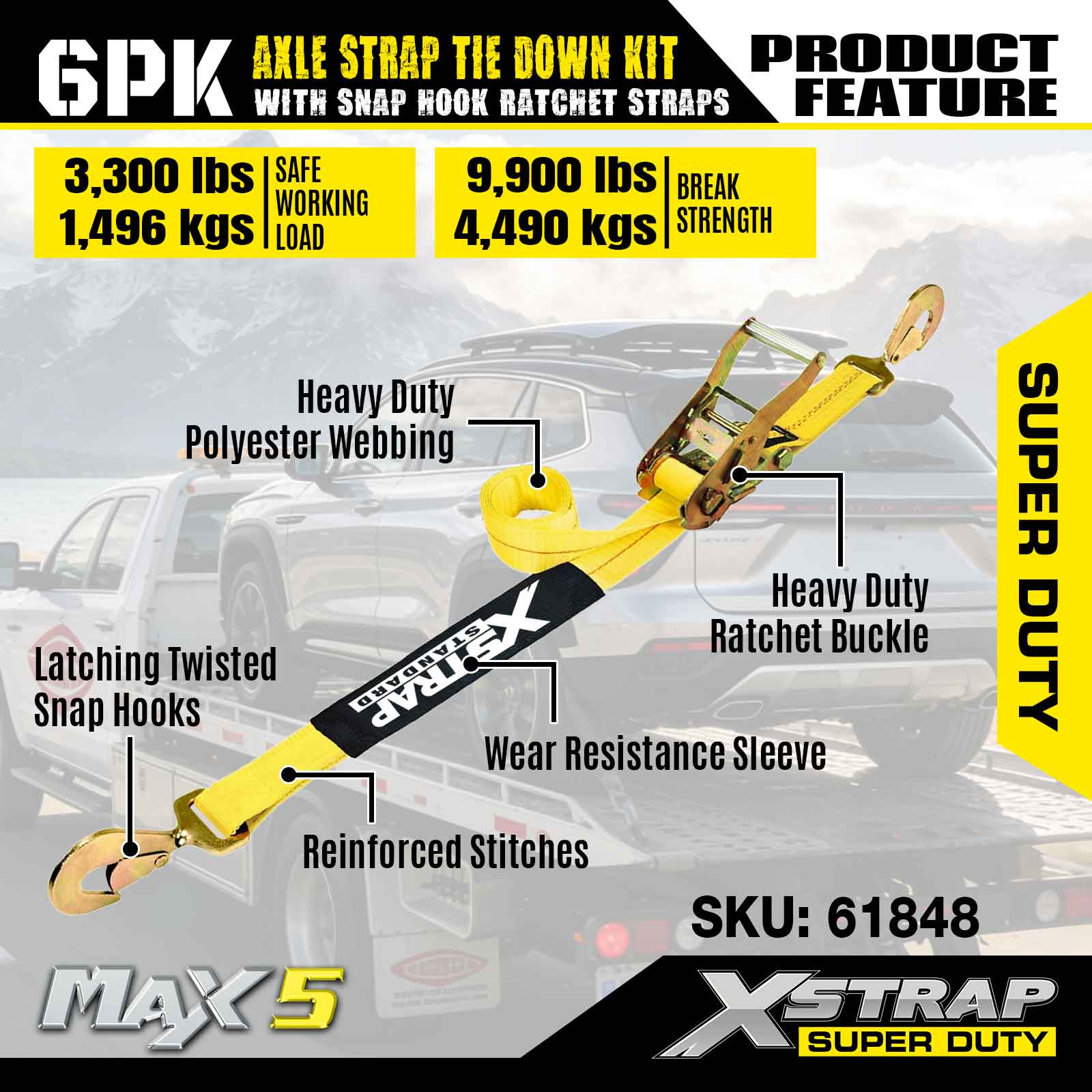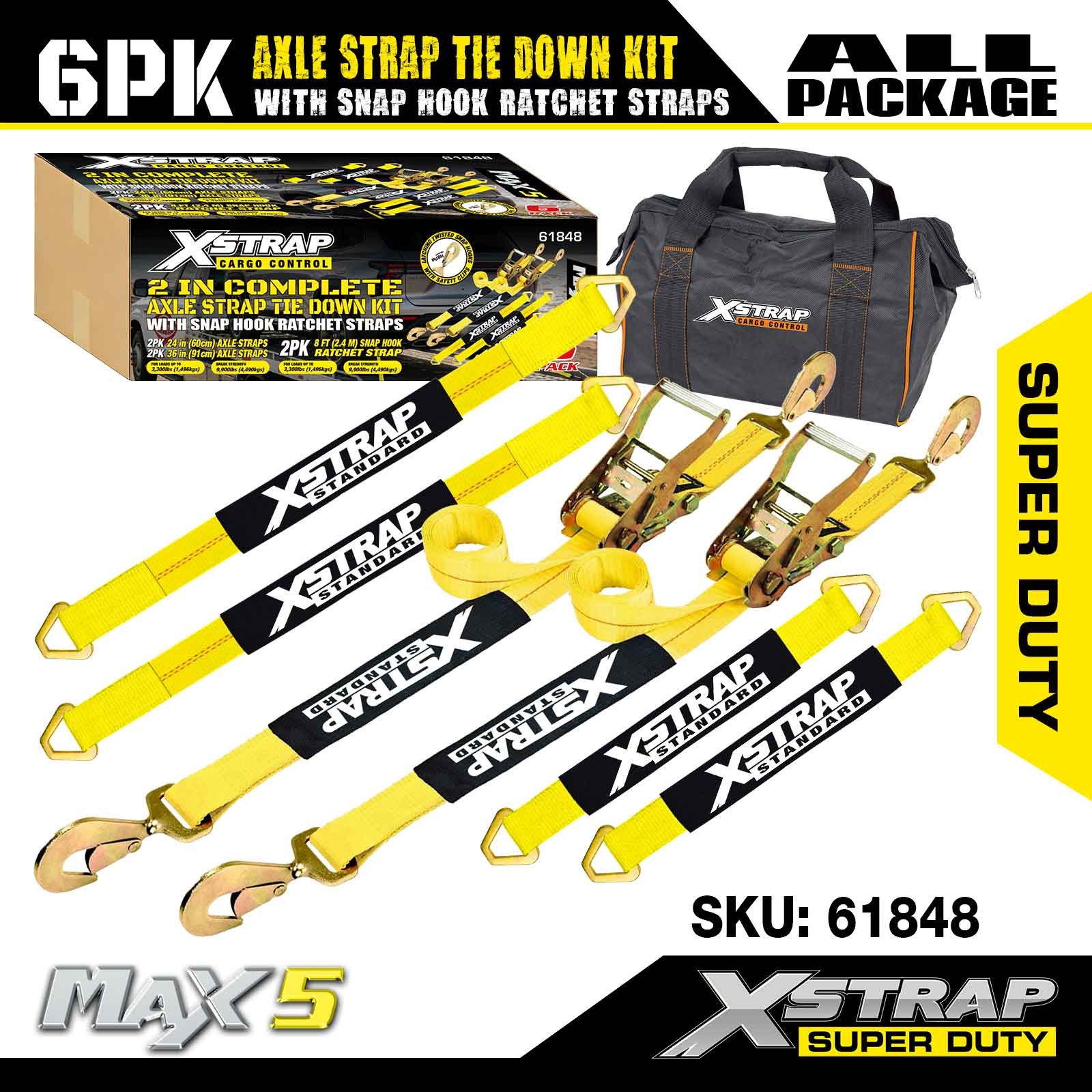 Kit de amarração da alça do eixo Xstrap 6PK (com tiras de catraca com gancho instantâneo) - Super Duty. Ele tem uma carga de trabalho segura de 3.300 libras (1.496 kg) e uma resistência à ruptura de 9.900 libras (4.490 kg).