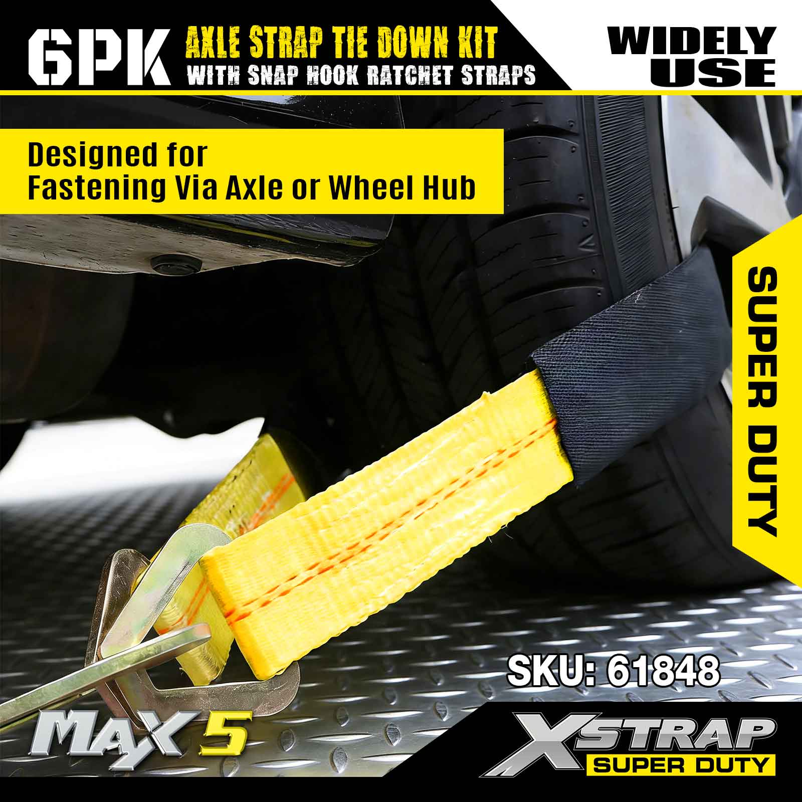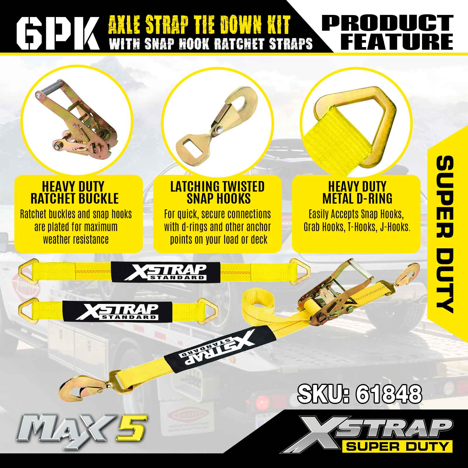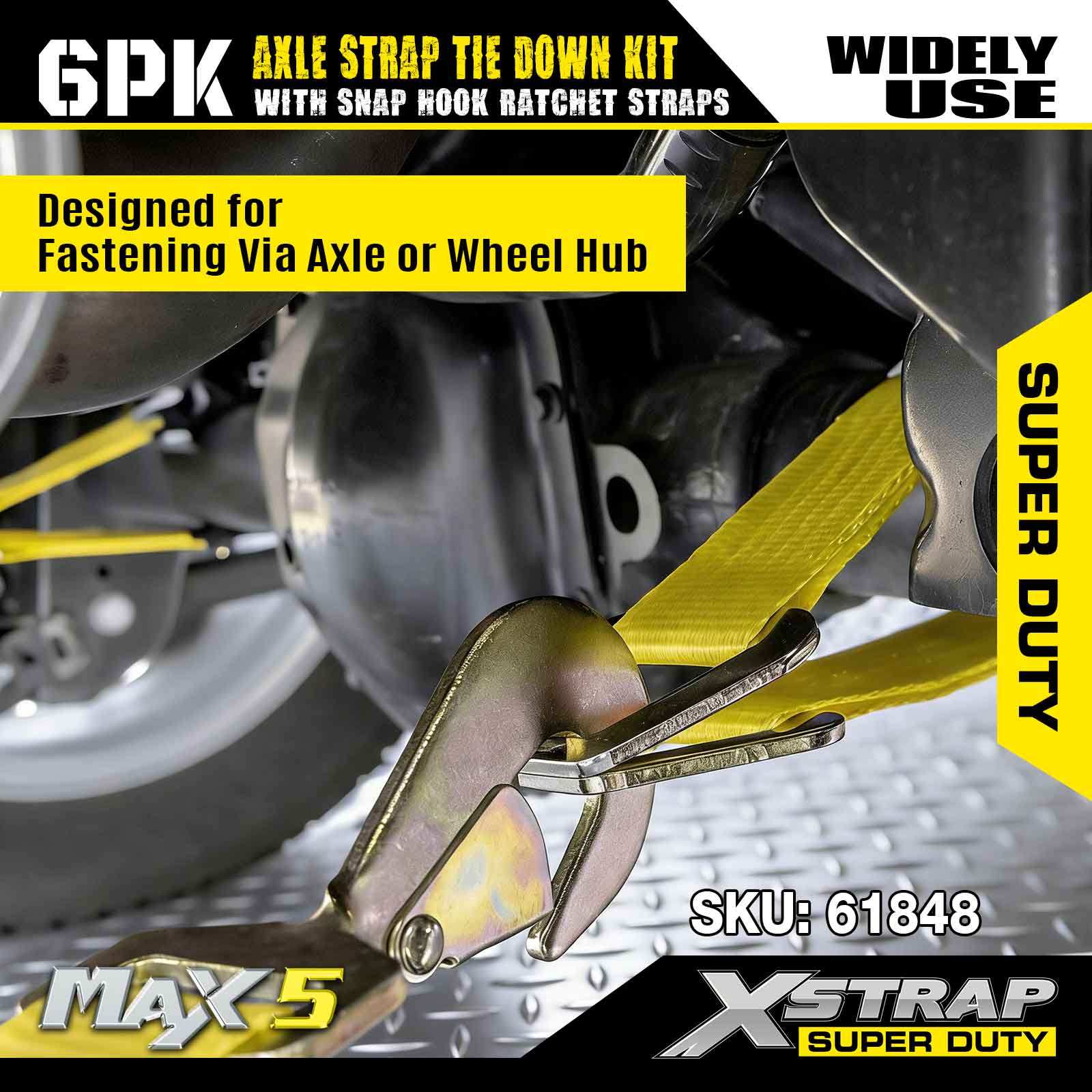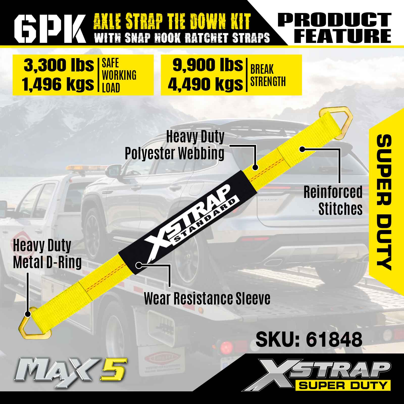 Kit de amarração da alça do eixo Xstrap 6PK (com tiras de catraca com gancho instantâneo) - Super Duty. Ele tem uma carga de trabalho segura de 3.300 libras (1.496 kg) e uma resistência à ruptura de 9.900 libras (4.490 kg).