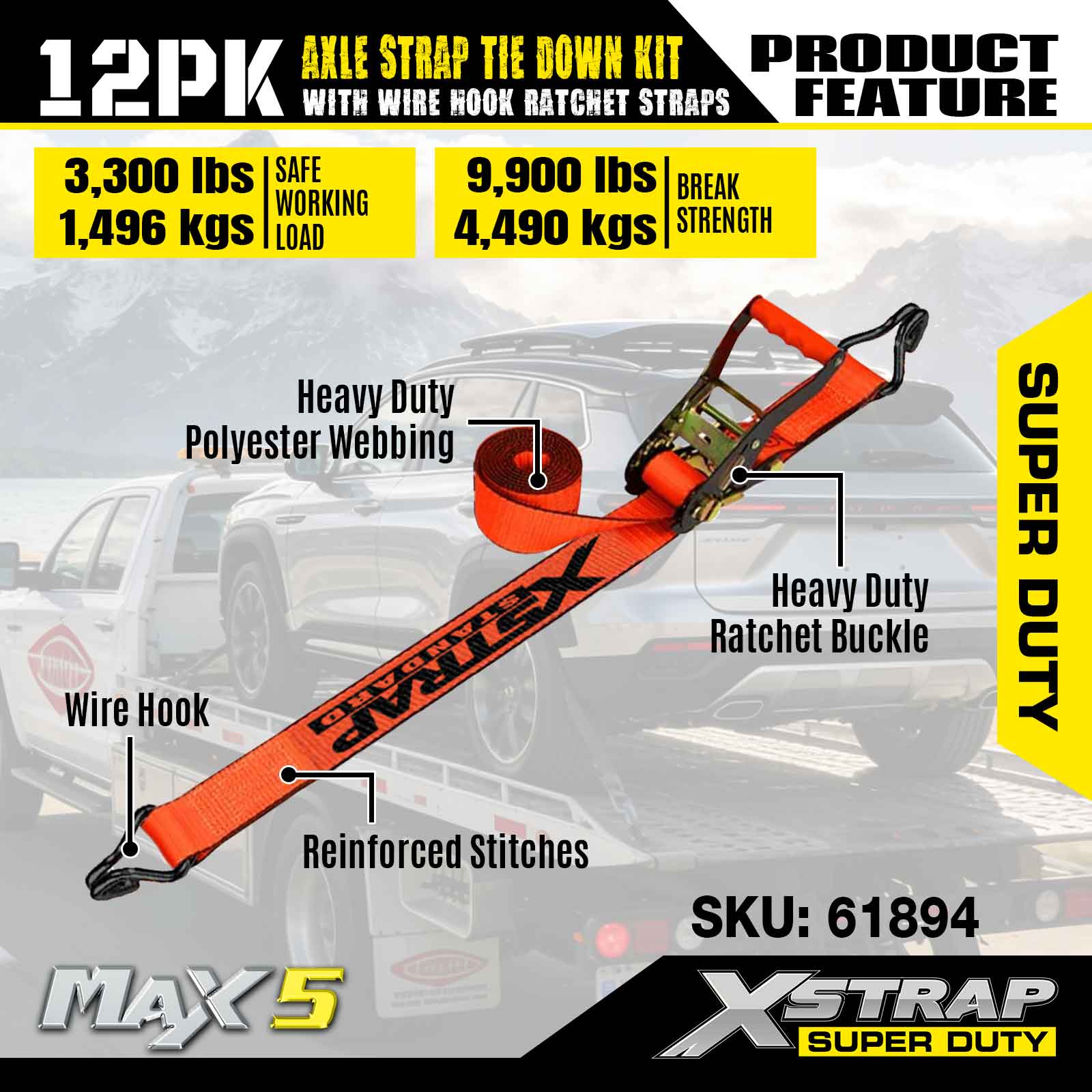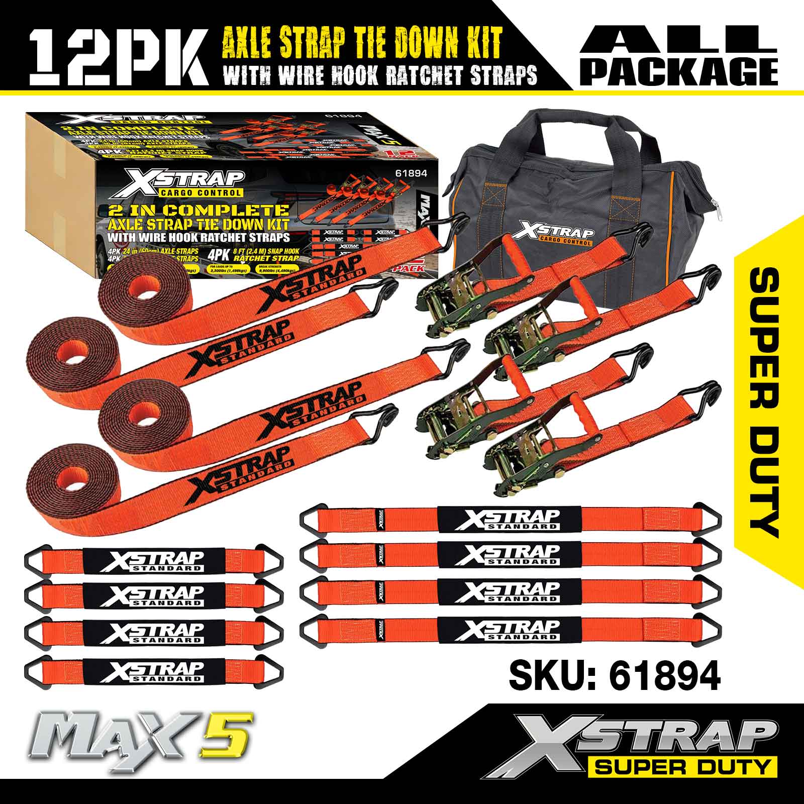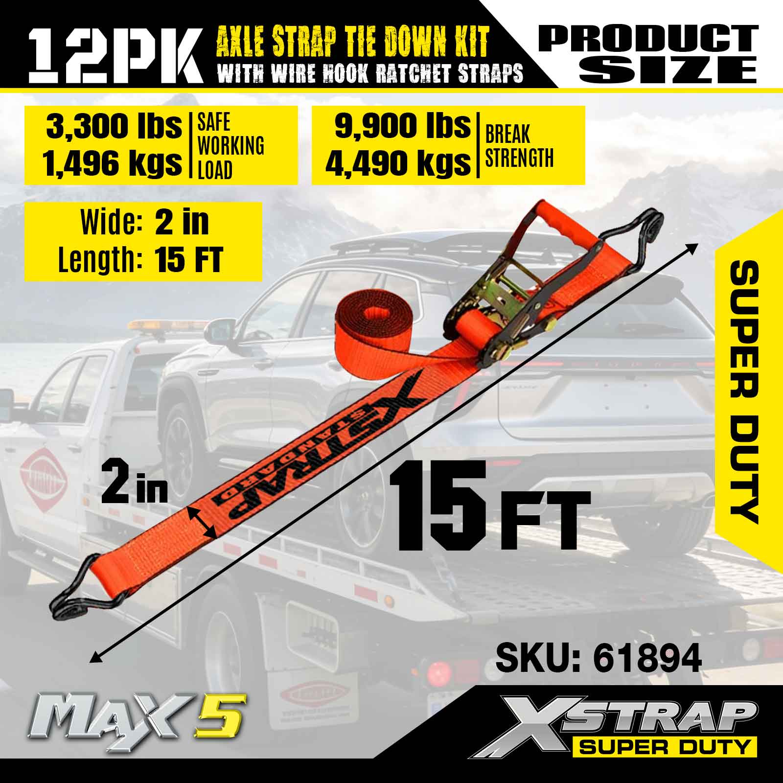 Kit de amarração da alça do eixo Xstrap 12PK (com tiras de catraca de gancho de arame) - Super Duty. Ele tem uma carga de trabalho segura de 3.300 libras (1.496 kg) e uma resistência à ruptura de 9.900 libras (4.490 kg).