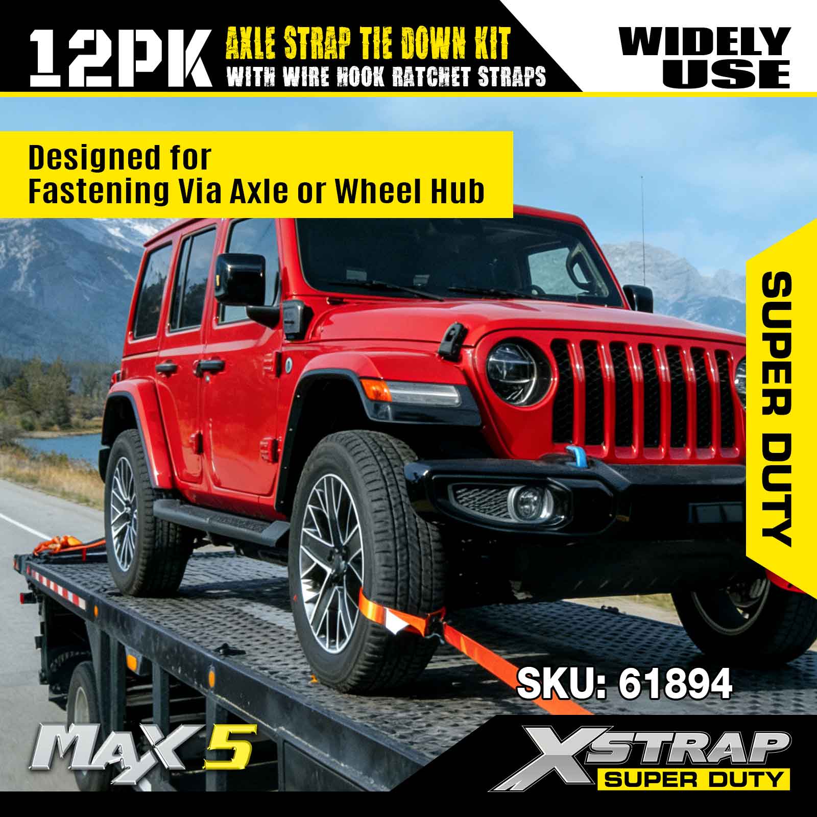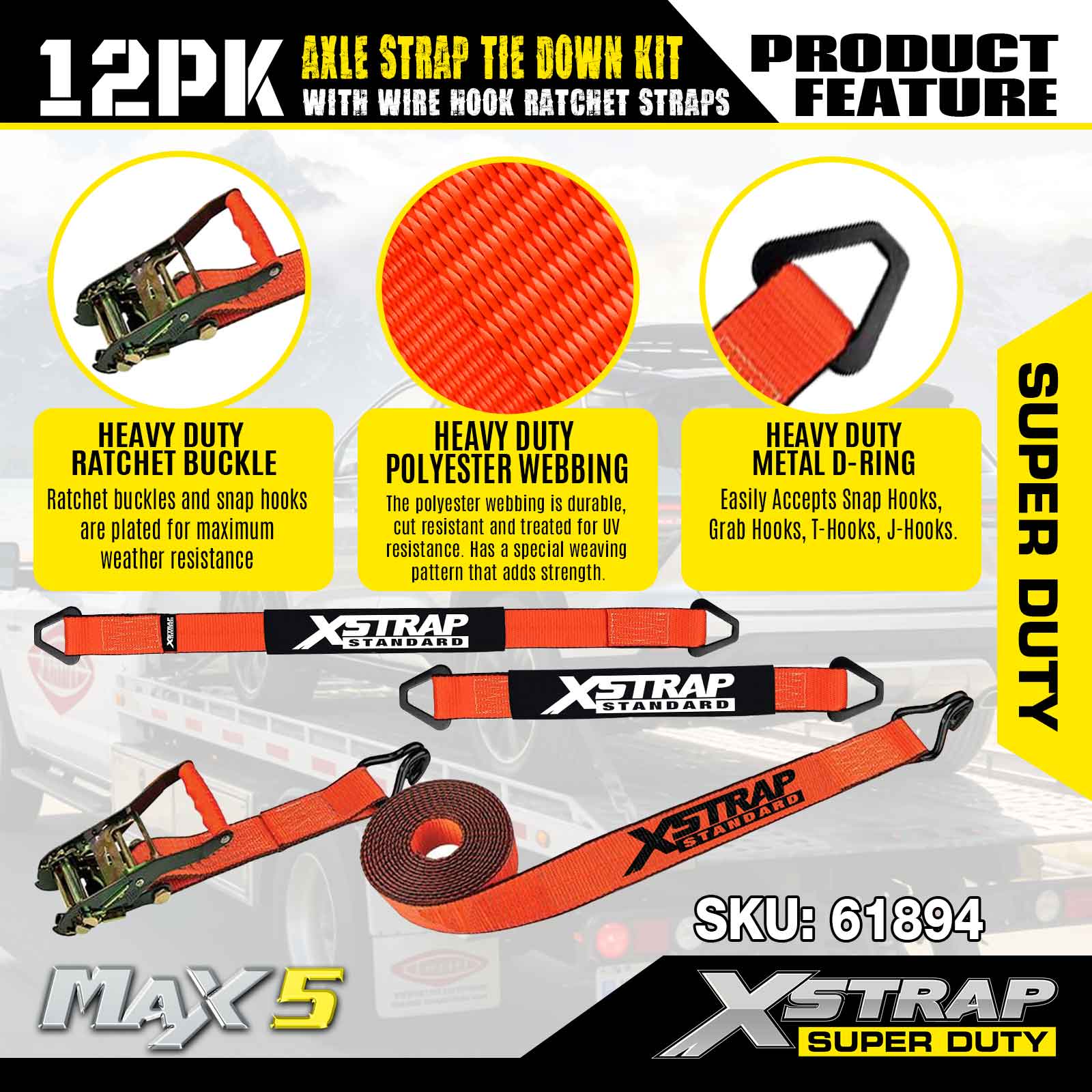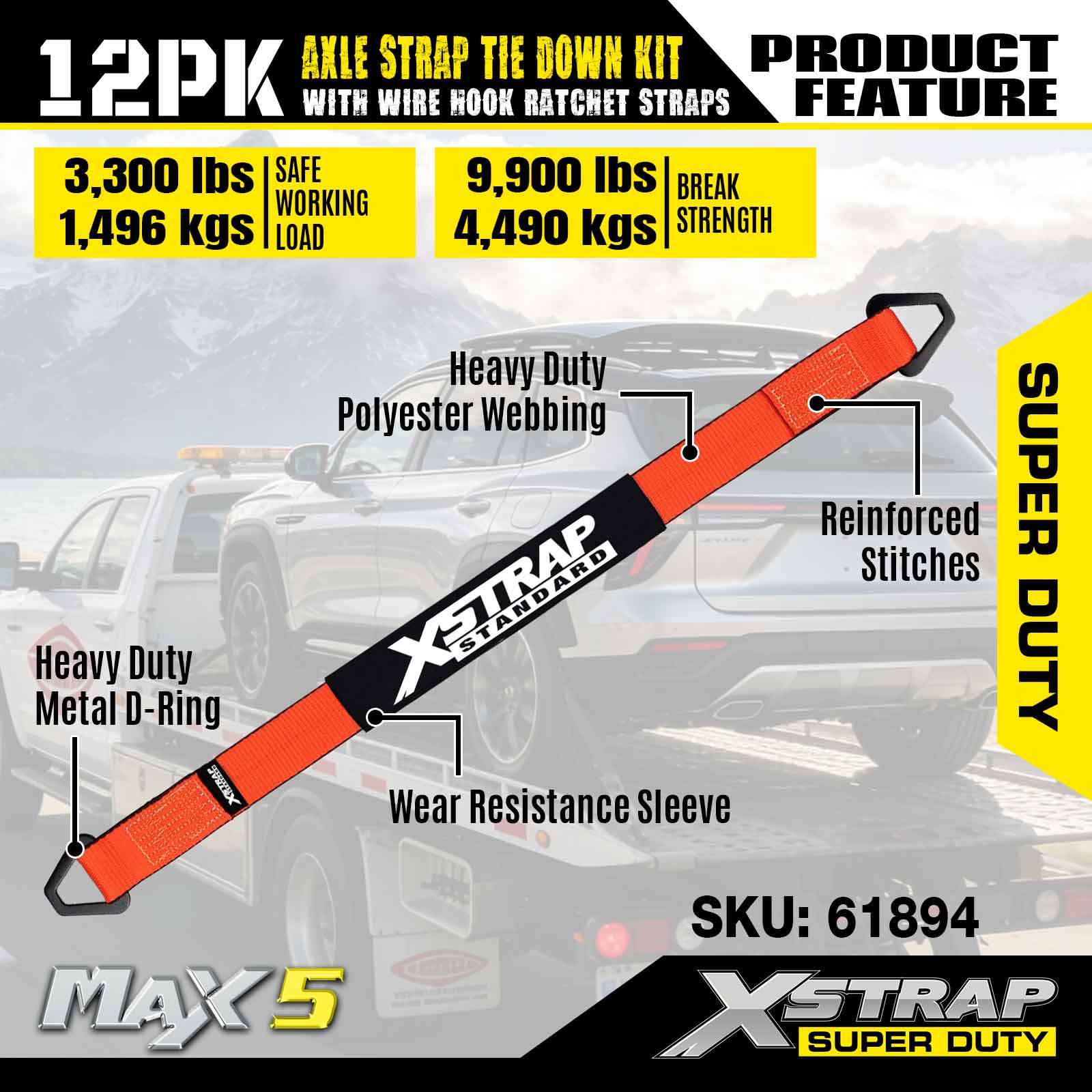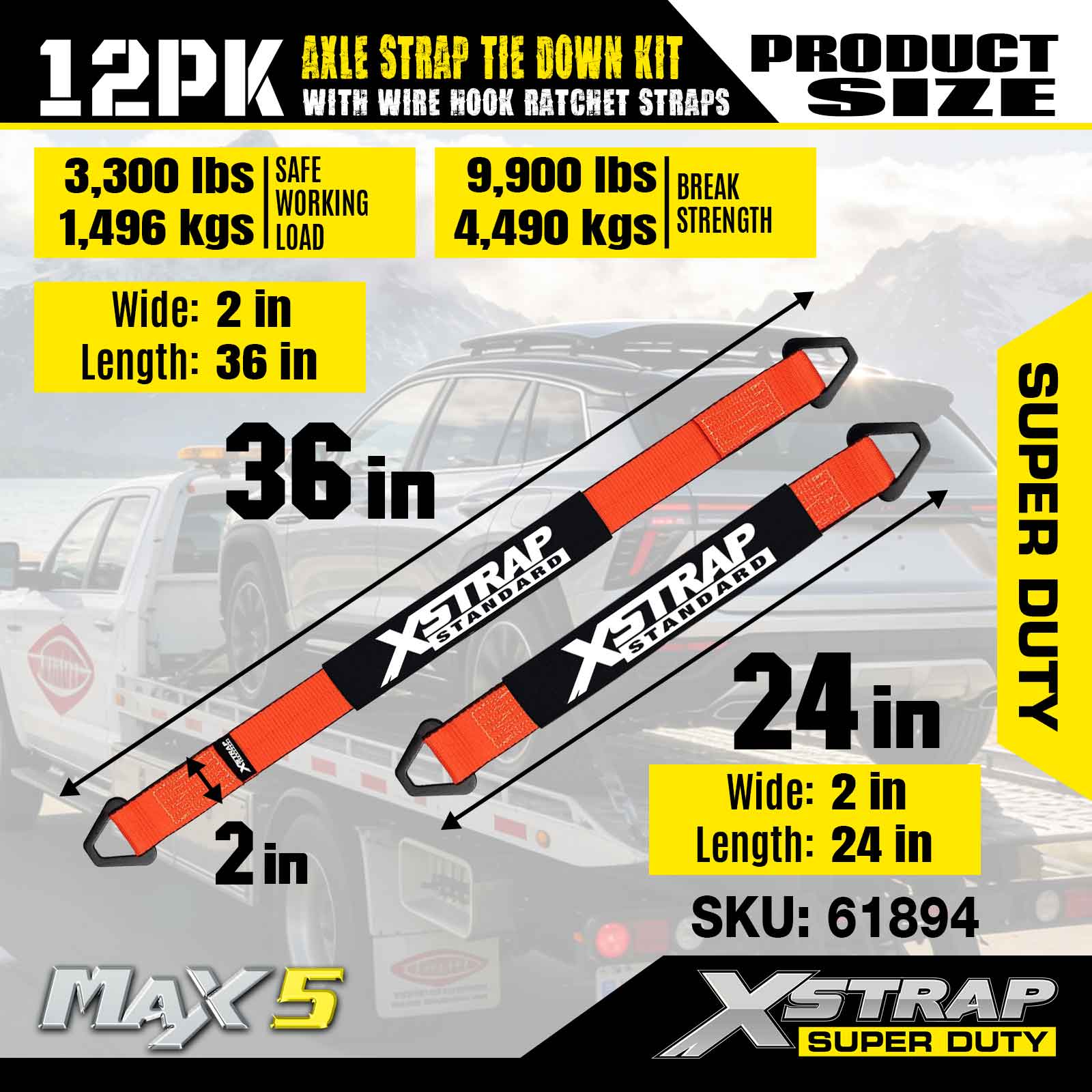 Kit de amarração da alça do eixo Xstrap 12PK (com tiras de catraca de gancho de arame) - Super Duty. Ele tem uma carga de trabalho segura de 3.300 libras (1.496 kg) e uma resistência à ruptura de 9.900 libras (4.490 kg).