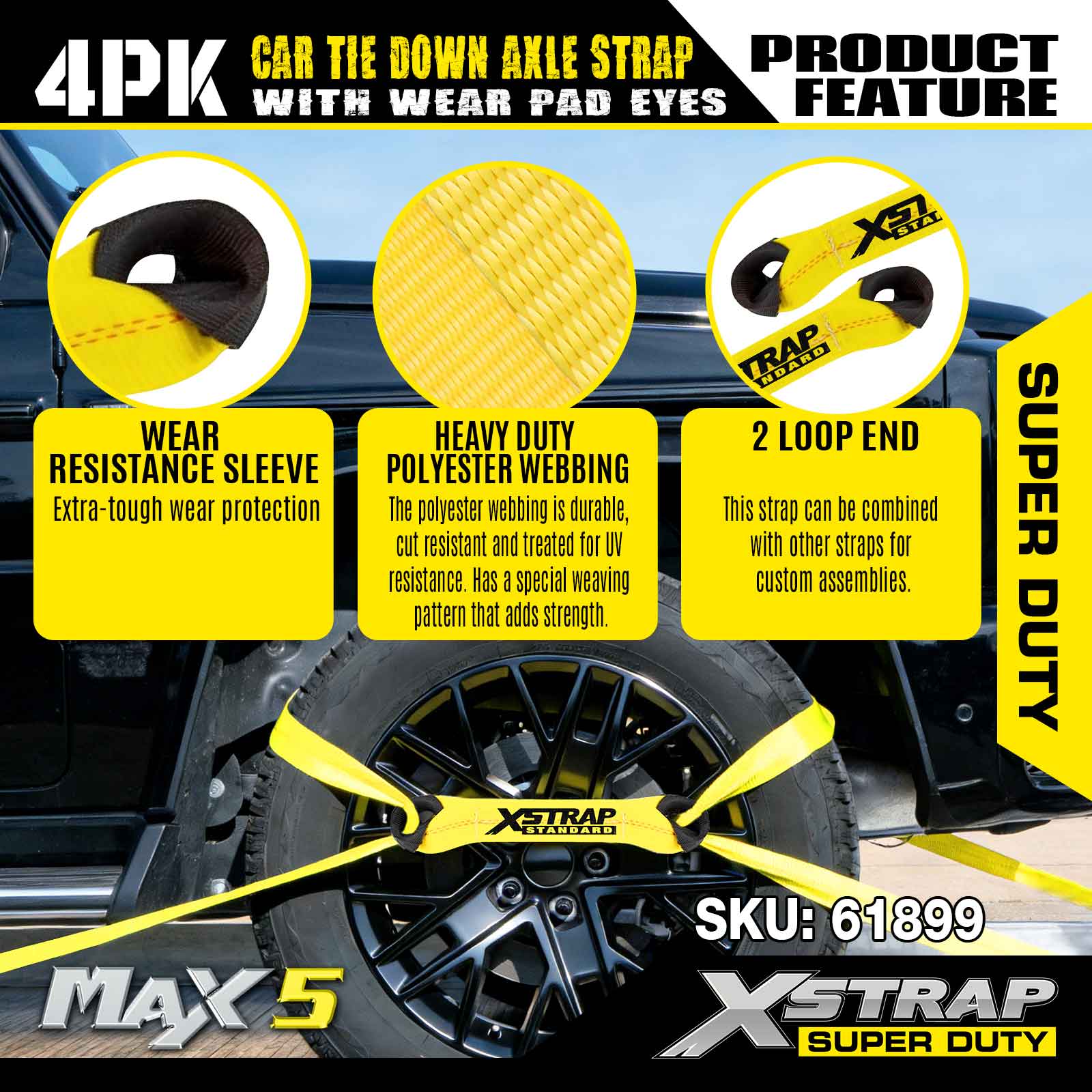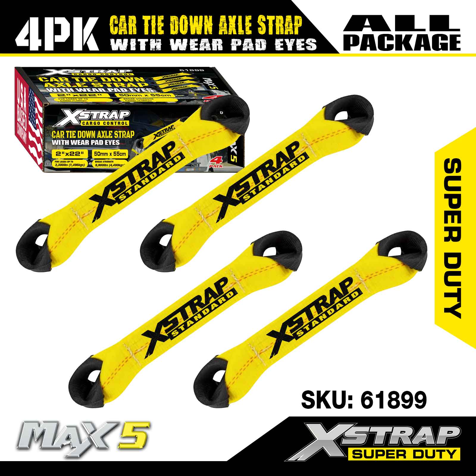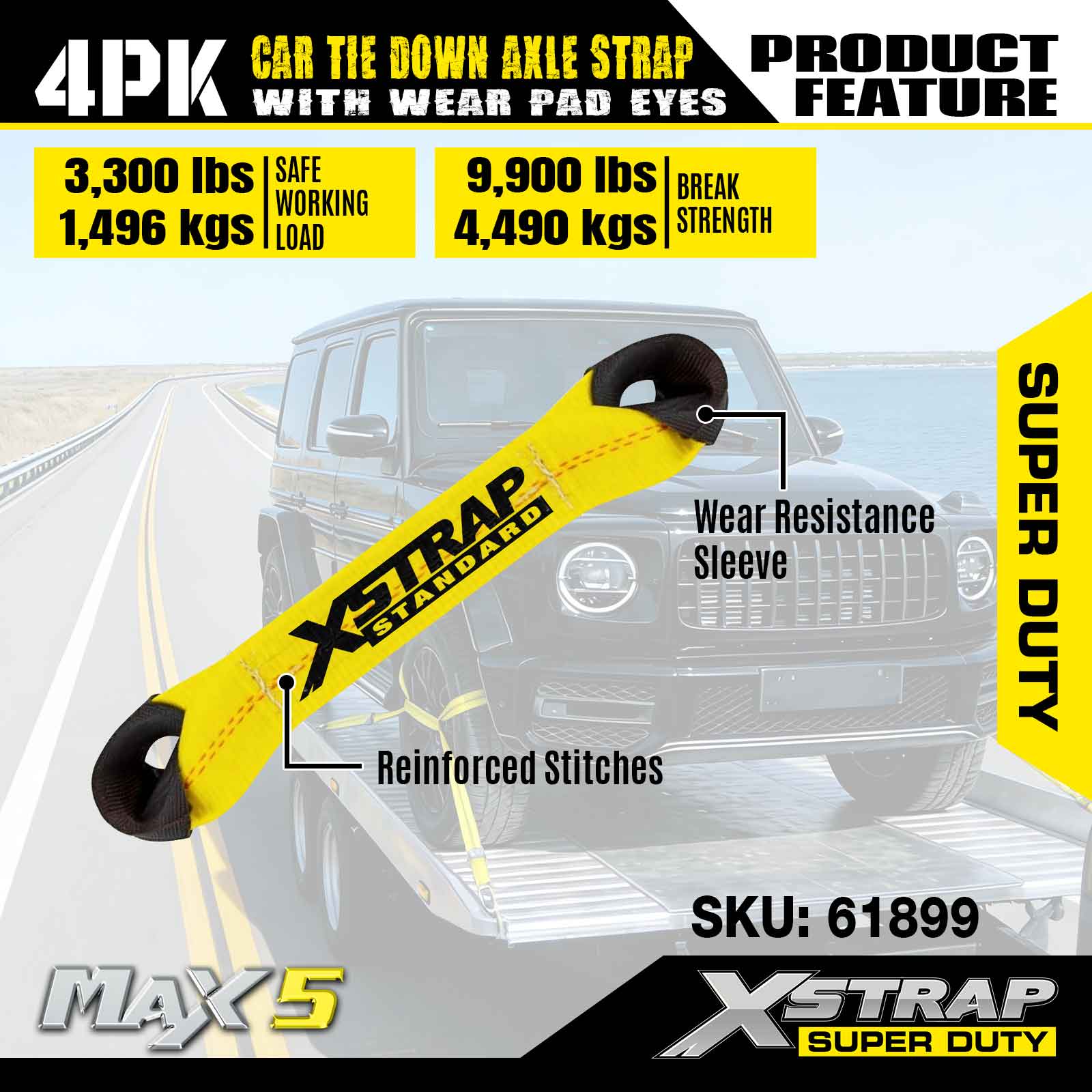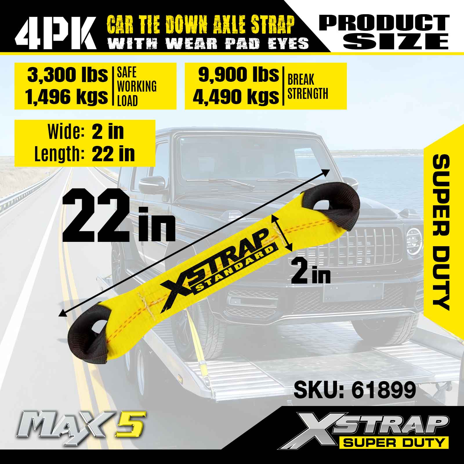 Correia de eixo de amarração para carro Xstrap 4PK (com olhais de proteção) - Super Duty. Ele tem uma carga de trabalho segura de 3.300 libras (1.496 kg) e uma resistência à ruptura de 9.900 libras (4.490 kg).