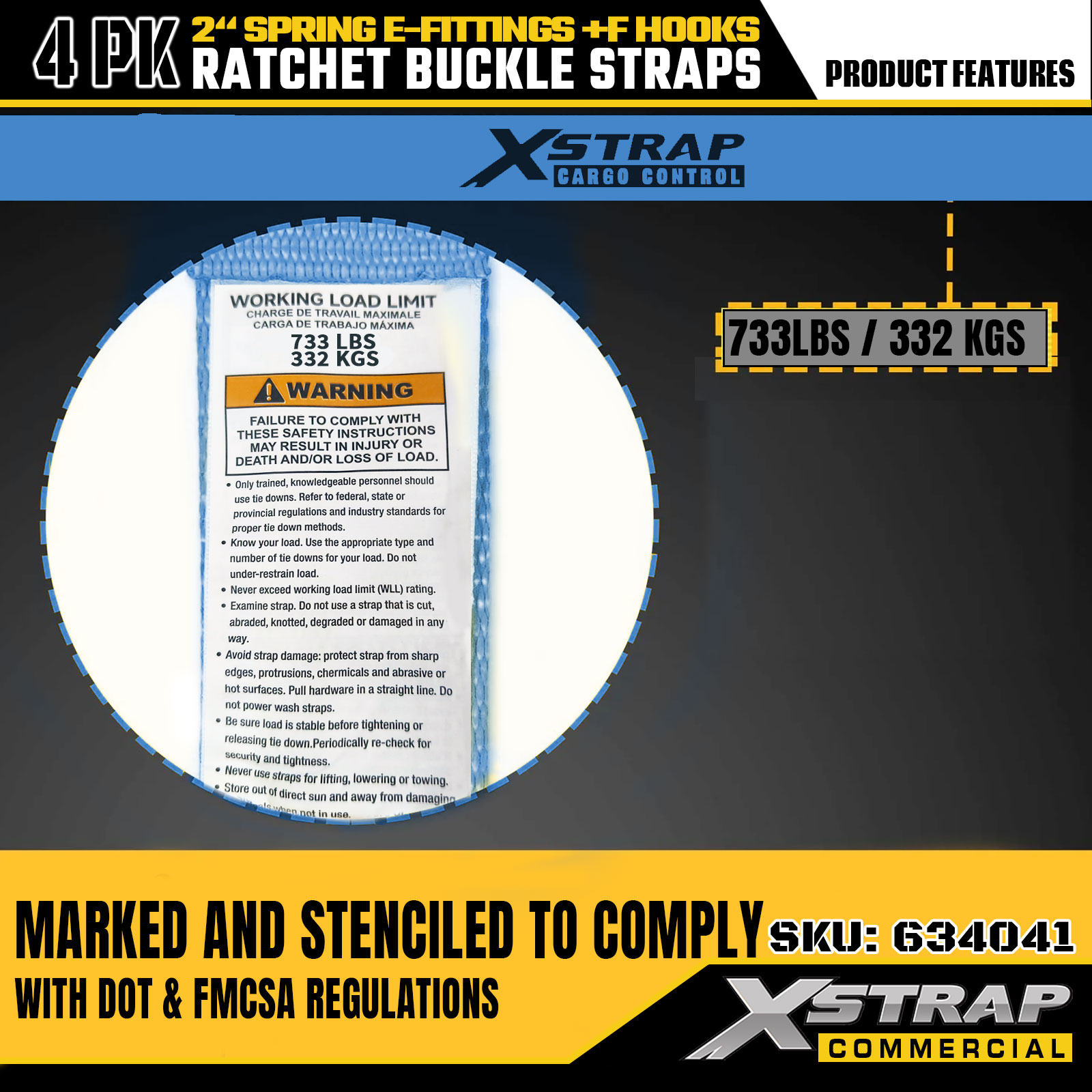 - Indicadores de segurança legíveis: cada tira é claramente etiquetada com a carga de trabalho segura (SWL) de 733 libras e capacidade de carga máxima de 332 libras, oferecendo instruções de segurança essenciais para uma aplicação correta e segura.