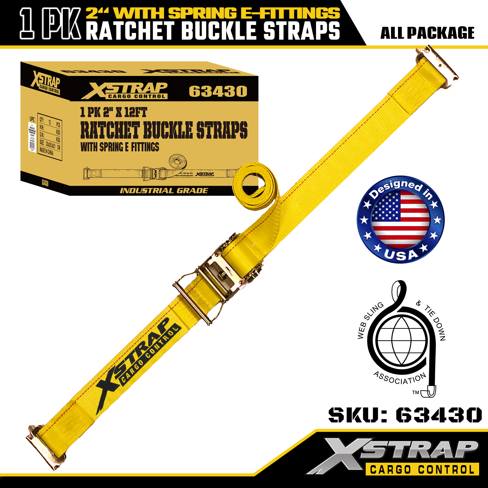 Xstrap 1 pacote de tiras de amarração de catraca de poliéster com acessórios de mola E, tiras de fixação de carga pesada de 2" x 12', capacidade de 4.401 libras (1.467 libras) para caminhão, cortador de grama, ATVs