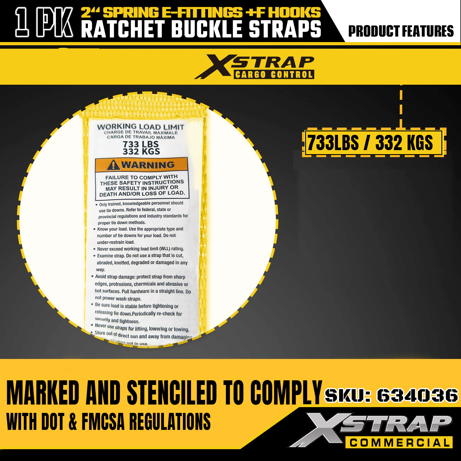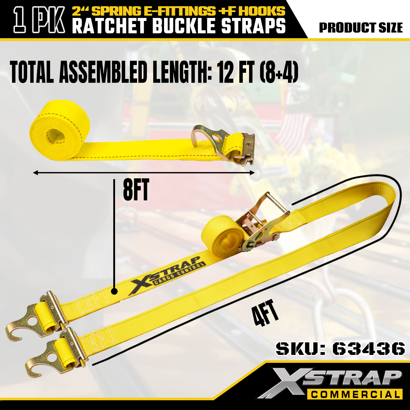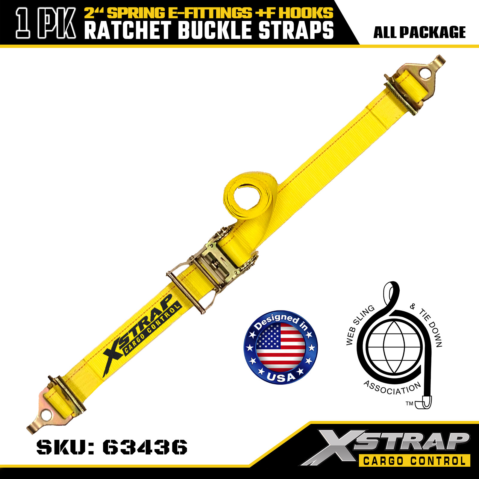 Correias de catraca de amarração de 1 pacote Xstrap, amarrações de carga pesada de 2" x 12' com acessórios de mola e ganchos F (amarelos), capacidade de 733 libras para fixação de reboques, caminhões, vans e motocicletas