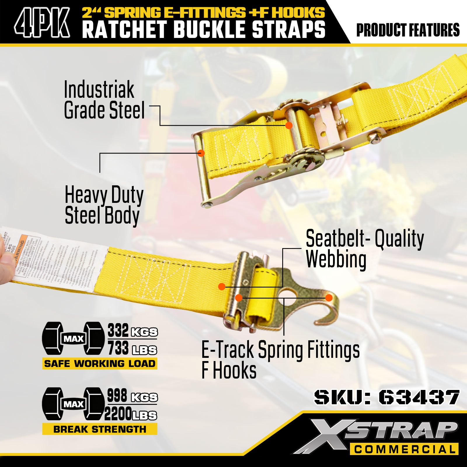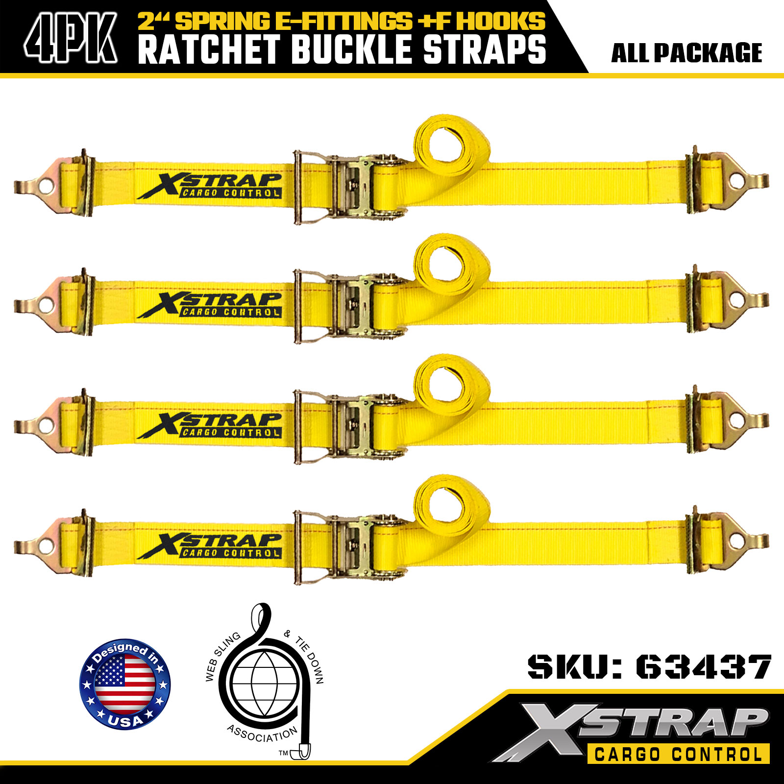 Xstrap 4 Pack Correias de amarração de catraca para serviços pesados, 2" x 12' Poliéster de alta resistência com acessórios de mola E e ganchos F, amarrações de carga pesada de 733 libras para reboques, caminhões, vans e motocicletas