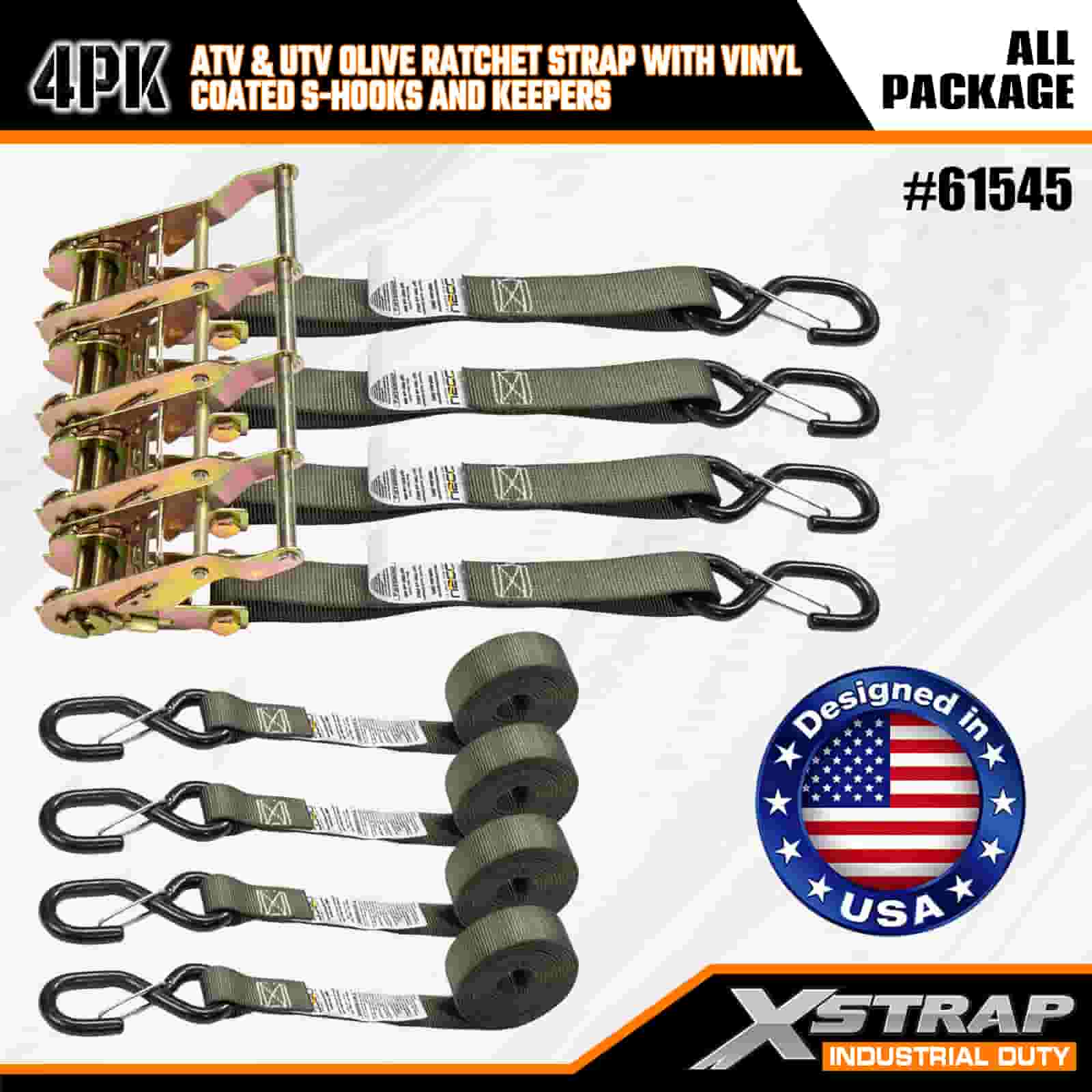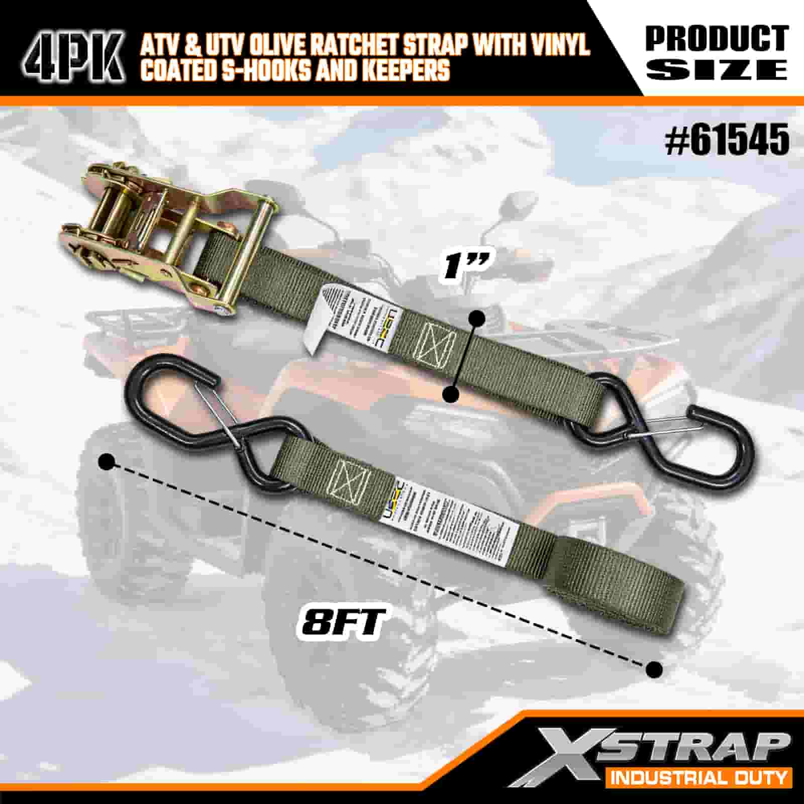 Correia de catraca de catraca Xstrap 4PK com ganchos de segurança S revestidos de vinil, cinta de amarração de poliéster de 1" x 8', cinta de catraca com capacidade de 833 libras, correias de fixação de amarração de carga com ganchos de segurança S para trailer de serviço pesado, barco de esqui de reboque de cama plana, carro pequeno, equipamento pesado.