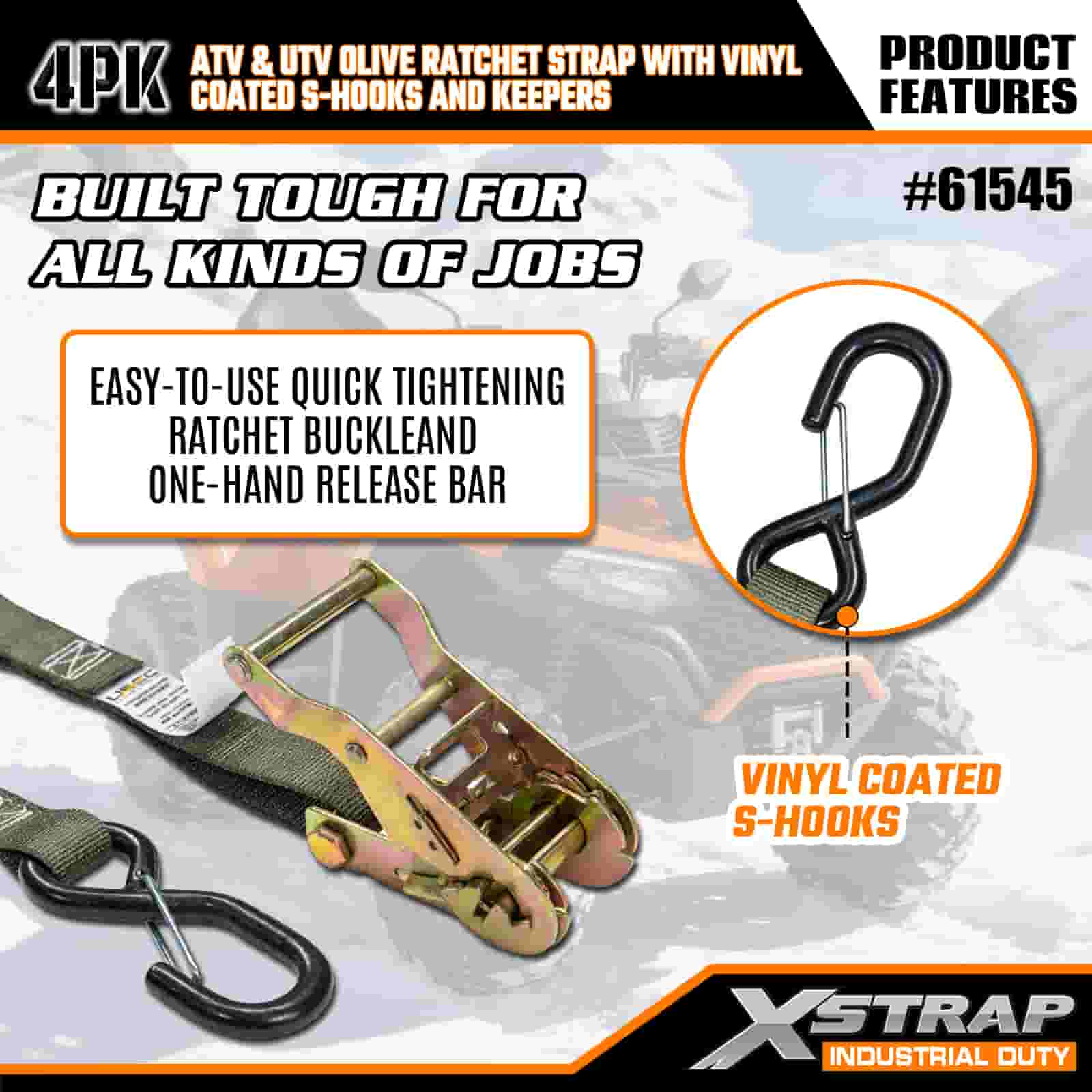 - Durabilidade de nível militar: a correia verde-oliva usa costura reforçada para resistir ao desgaste e ao estiramento, enquanto os ganchos S revestidos de vinil evitam arranhões em seu veículo. A catraca resistente à corrosão resiste à chuva, poeira e névoa salina para uso duradouro.