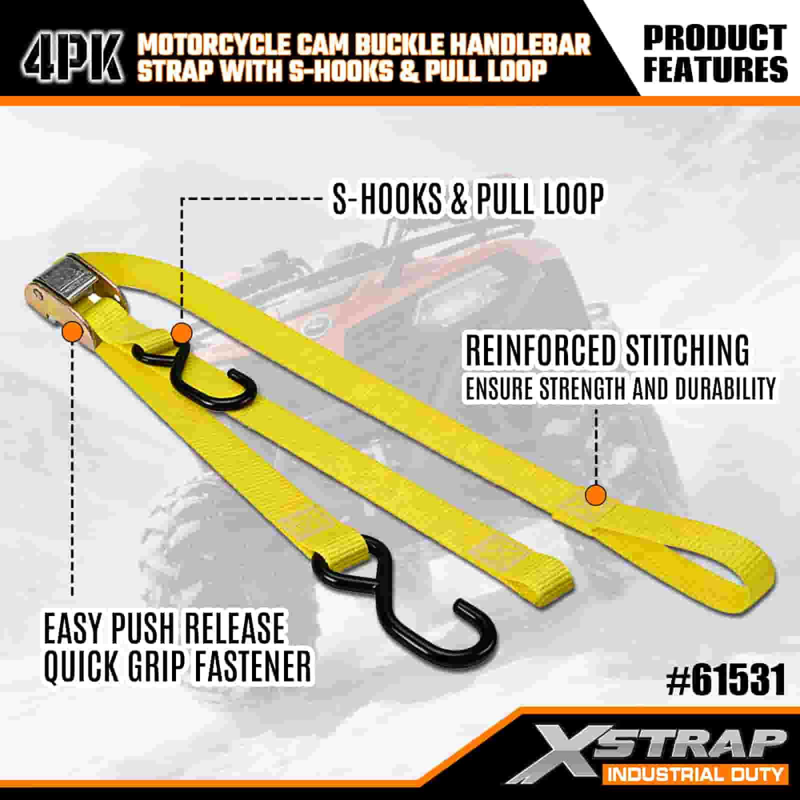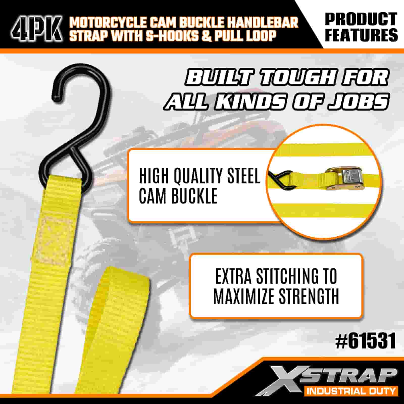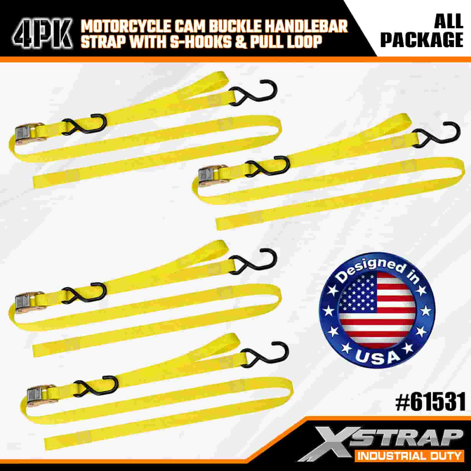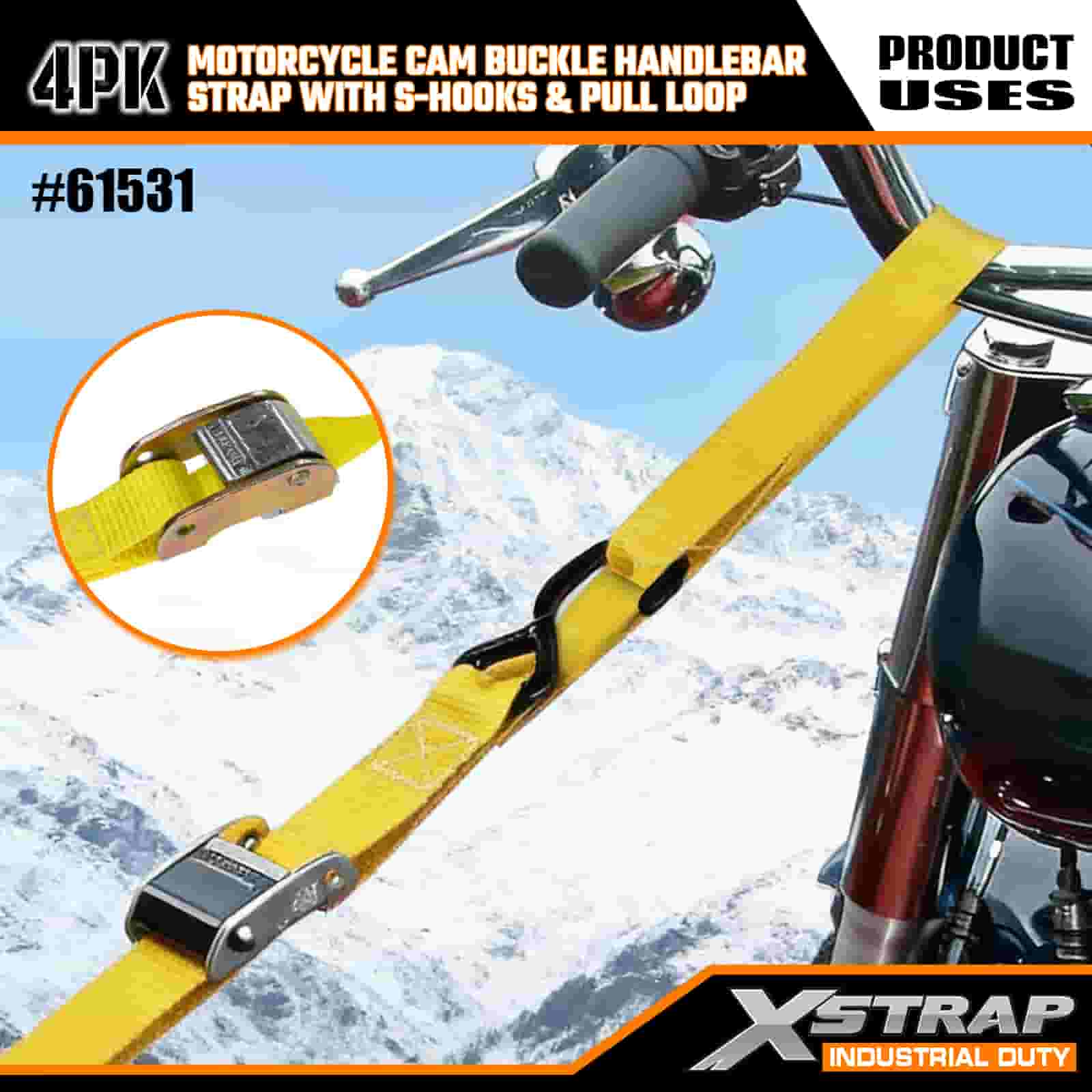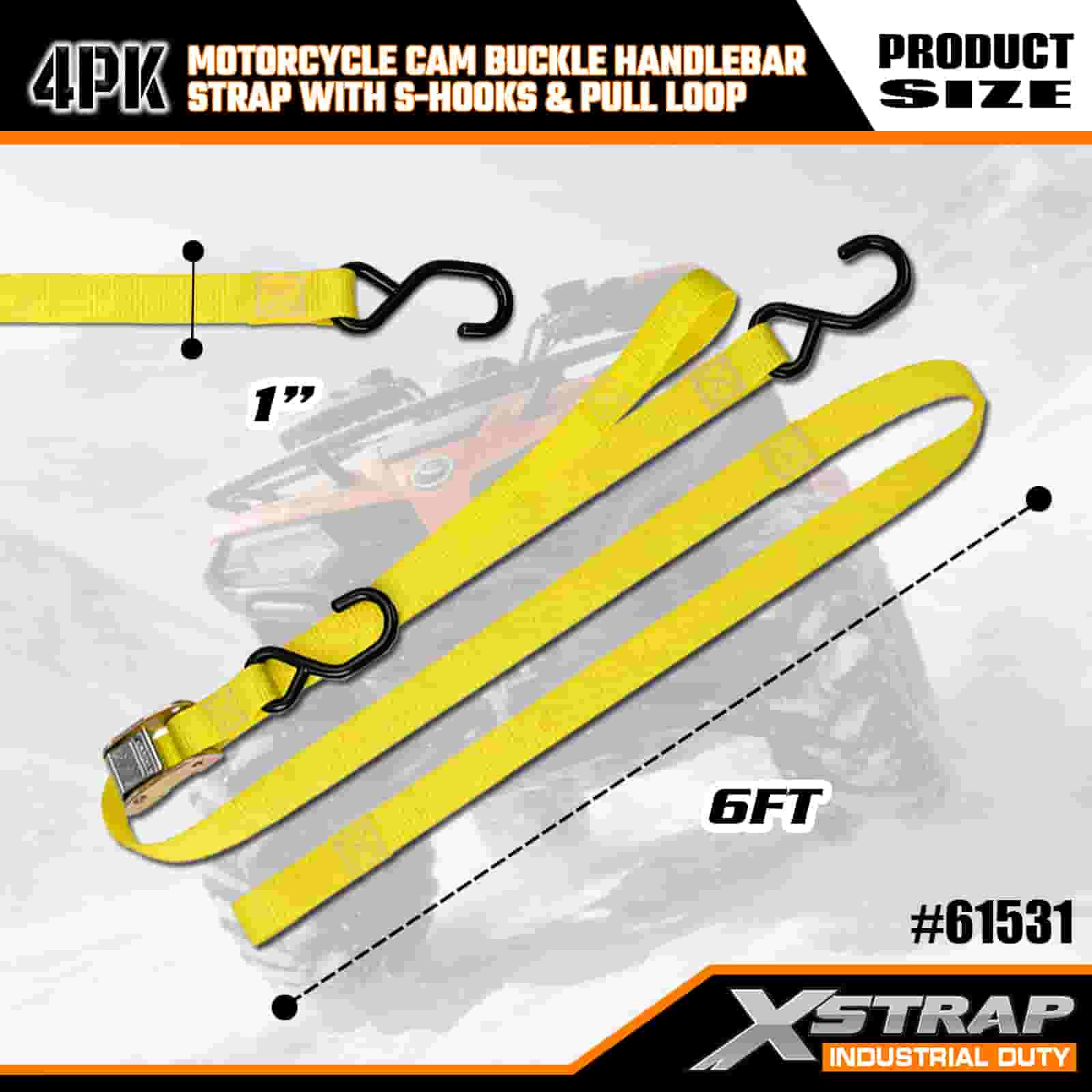 - Pacote com 4 tiras de 6 pés para uso em motocicleta: vendido como um conjunto de 4 tiras (1 polegada de largura x 6 pés de comprimento), ideal para prender motocicletas, guidões e pequenos equipamentos em caçambas de caminhões ou durante o transporte.