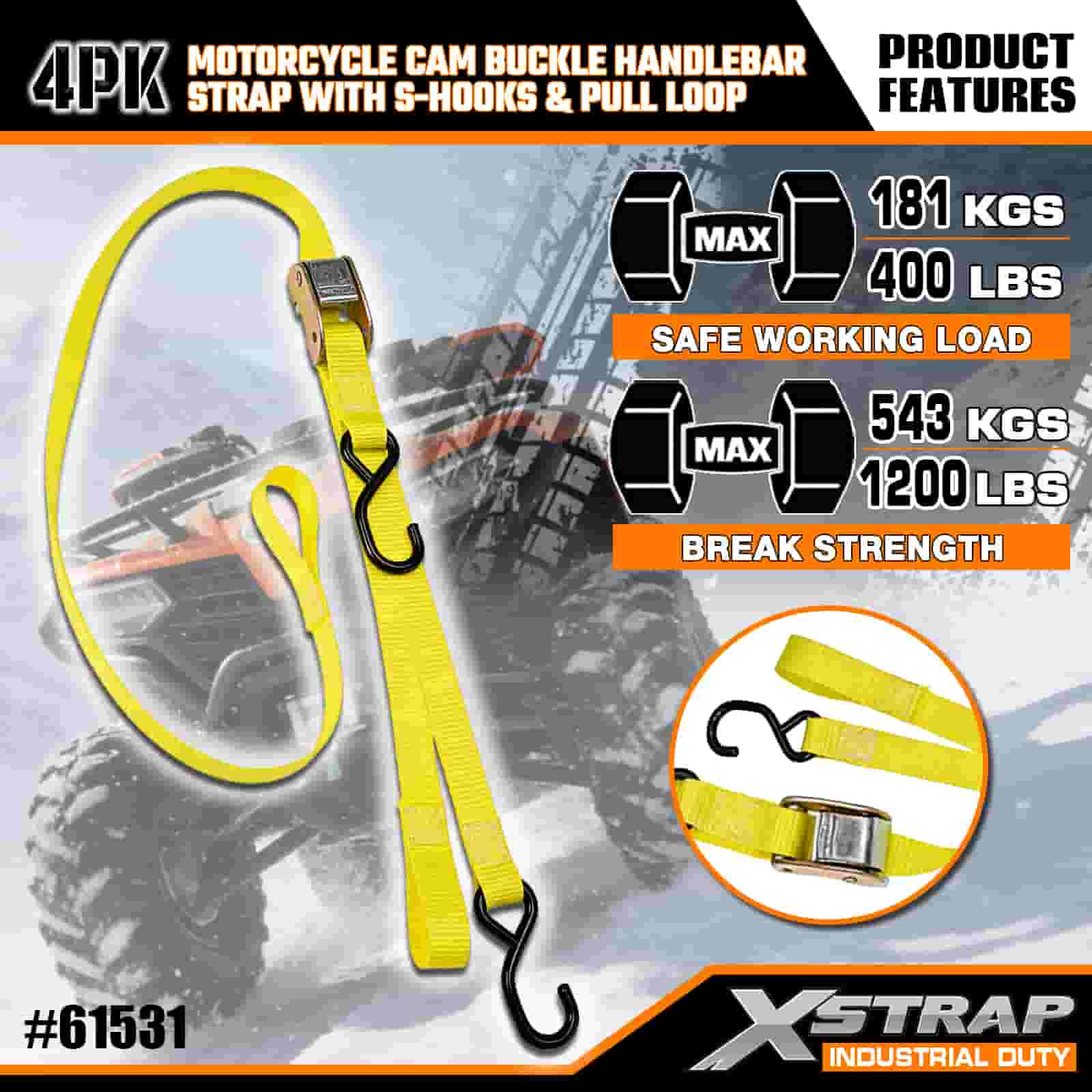 Correia de guiador com fivela de câmera de motocicleta Xstrap 4PK com ganchos S e alça de tração, alça de amarração de poliéster de 1 "x 6', alça de fivela de câmera de tração, tiras de fixação de amarração de carga com capacidade de 400 libras com ganchos S para profissionais sérios para proteger trailer de carga, trailer de cama plana, barco de esqui, carro pequeno.