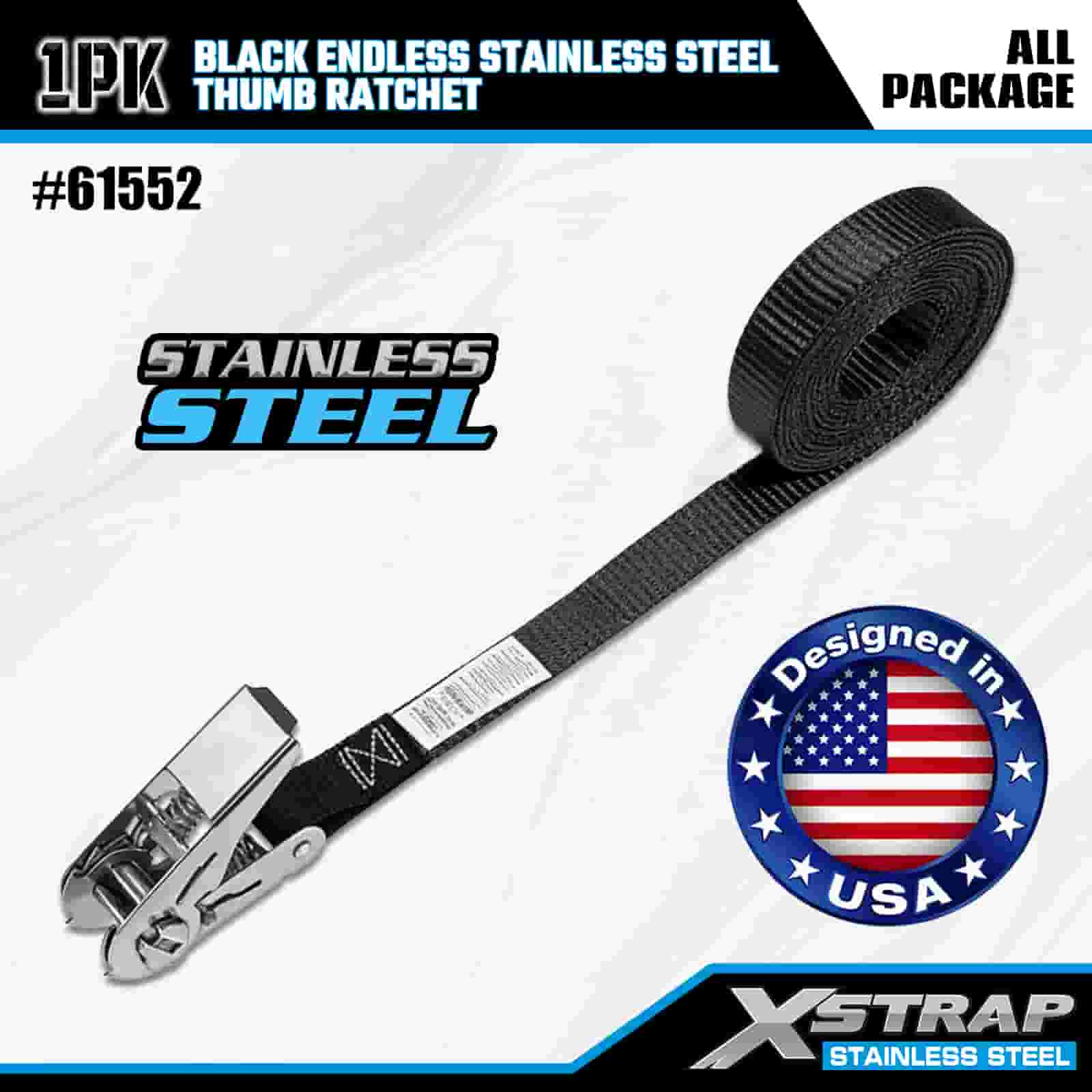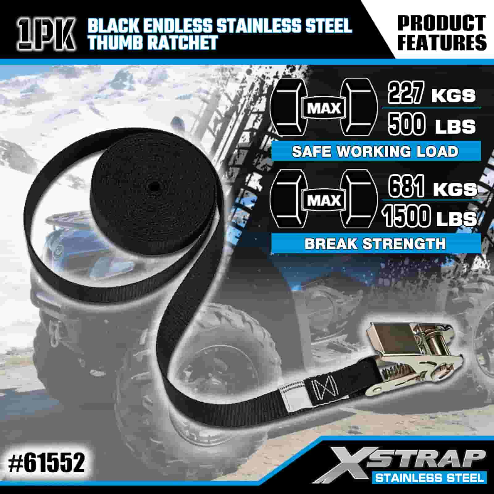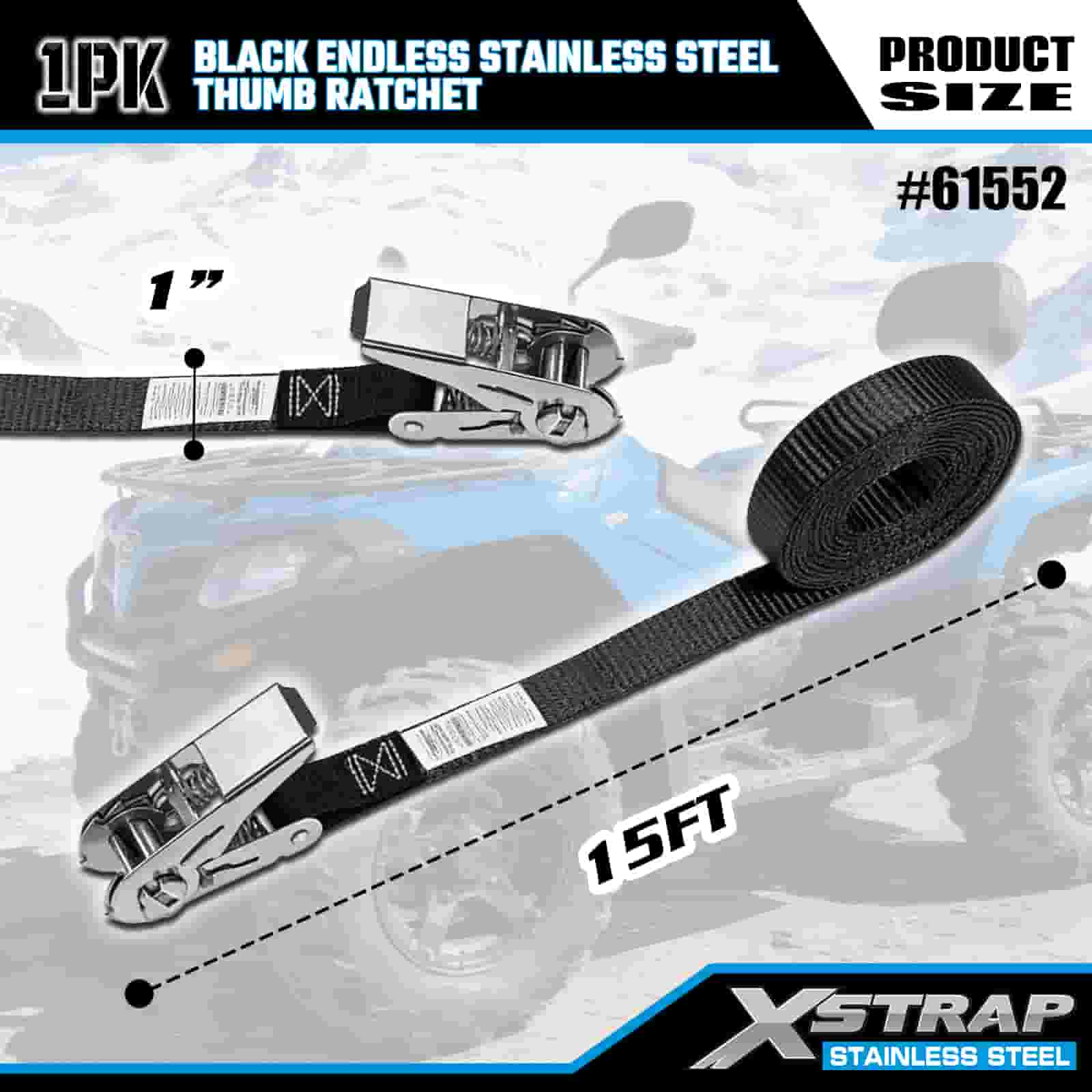 Xstrap Catraca de polegar preta sem fim de aço inoxidável, cinta de amarração de poliéster de 1" x 15', cinta de catraca com capacidade de 500 libras para amarração de carga para trailer, barco de esqui para trailer de cama plana, carro pequeno, equipamento pesado.