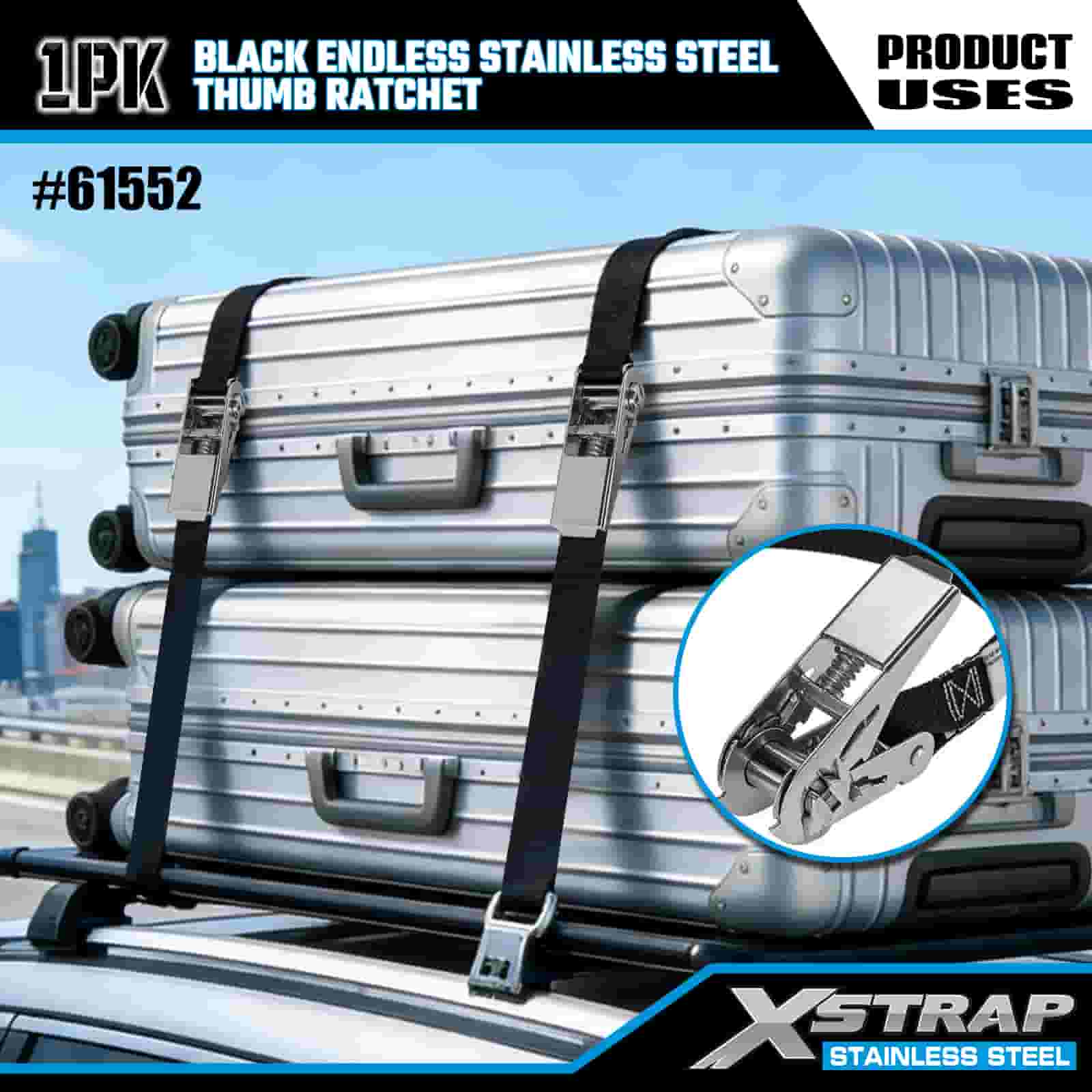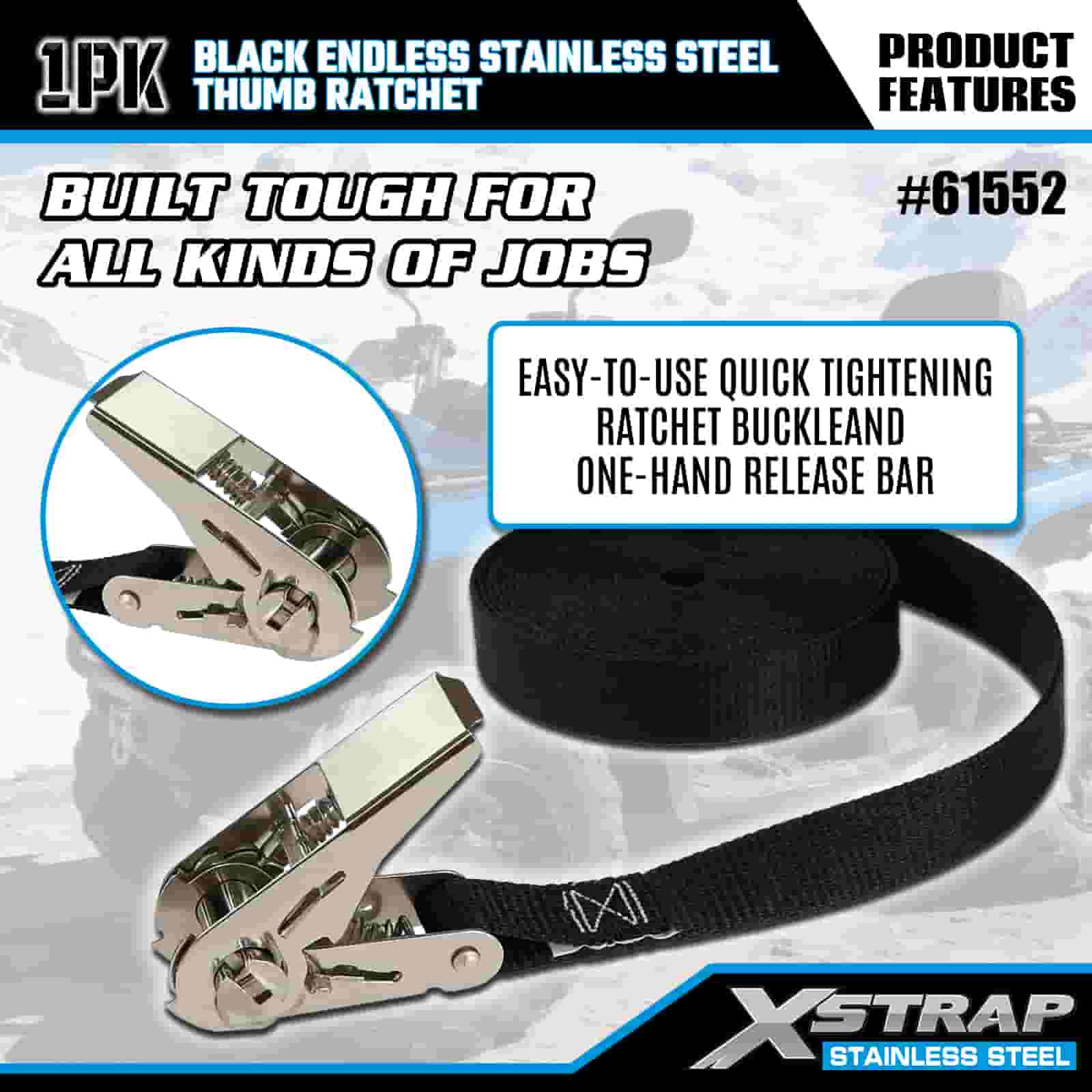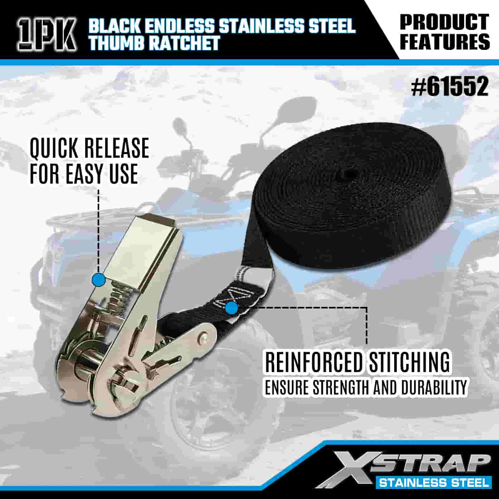 Xstrap Catraca de polegar preta sem fim de aço inoxidável, cinta de amarração de poliéster de 1" x 15', cinta de catraca com capacidade de 500 libras para amarração de carga para trailer, barco de esqui para trailer de cama plana, carro pequeno, equipamento pesado.