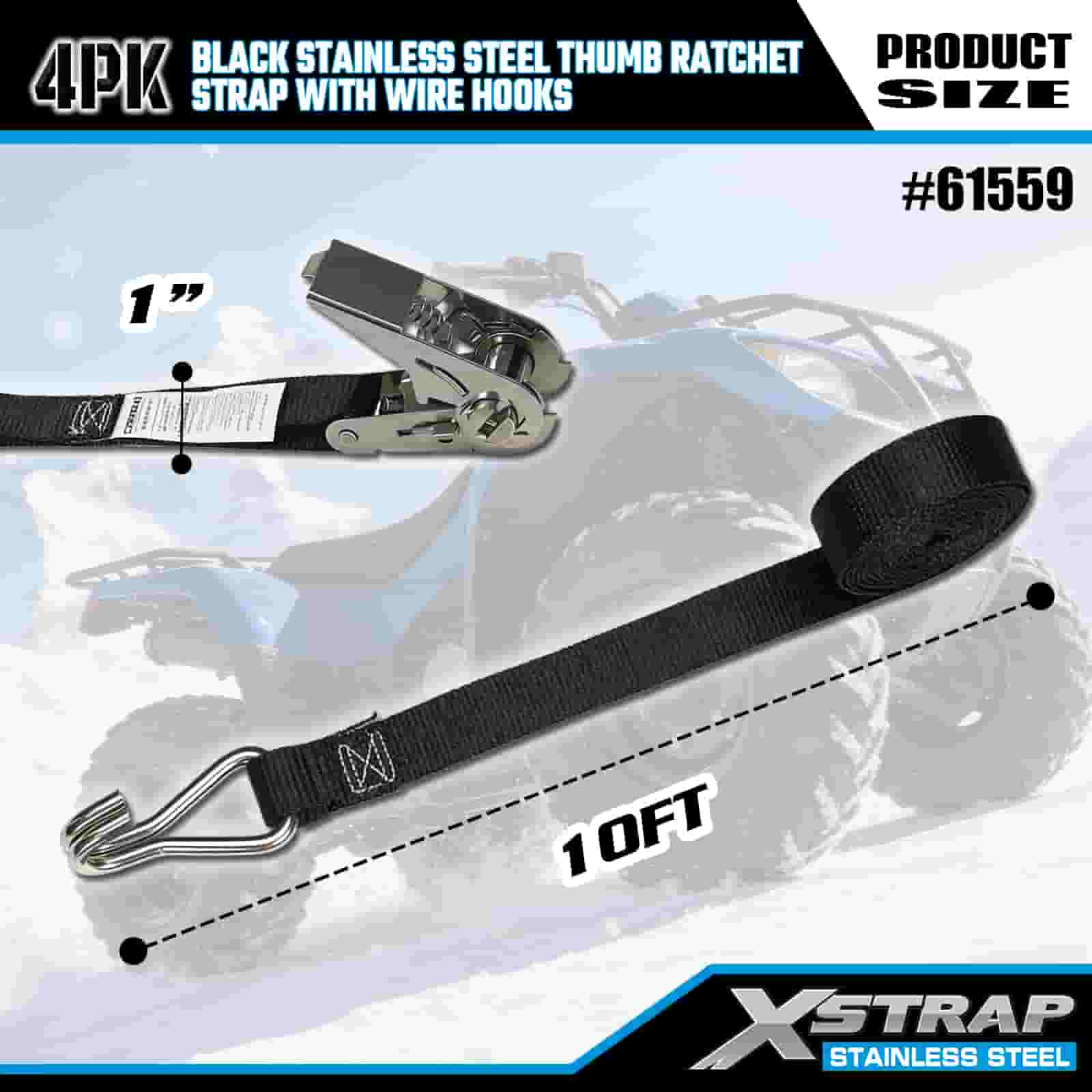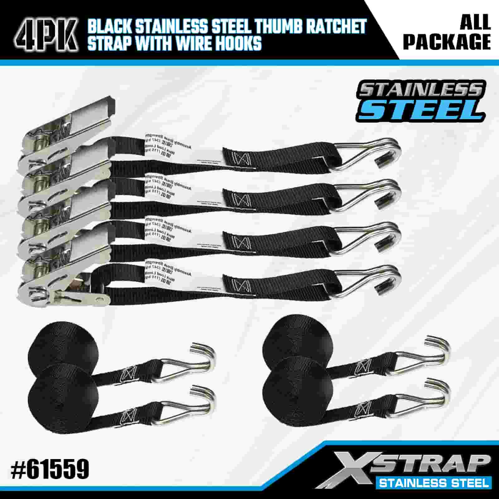 Catraca de polegar de aço inoxidável preto Xstrap 4PK com ganchos de arame, cinta de amarração de poliéster de 1 "x 10', cintas de fixação de amarração de carga com capacidade de 500 libras com ganchos de arame para trailer, barco de esqui de reboque de cama plana, carro pequeno, equipamento pesado.