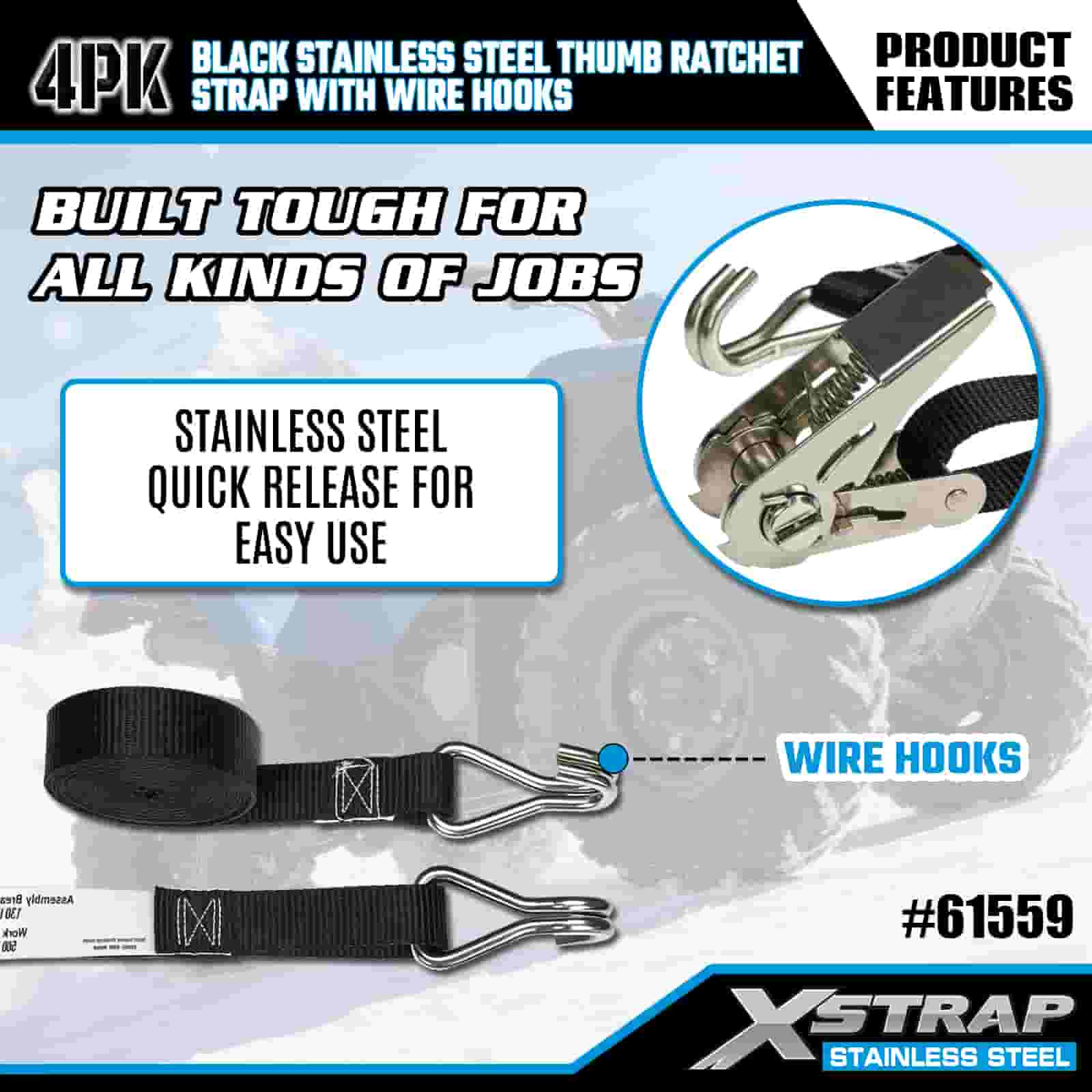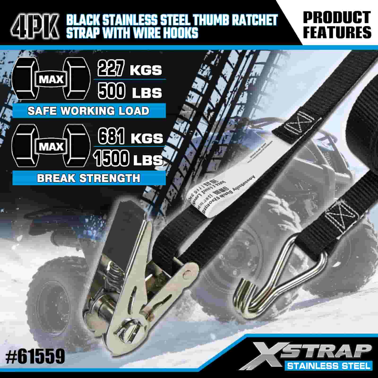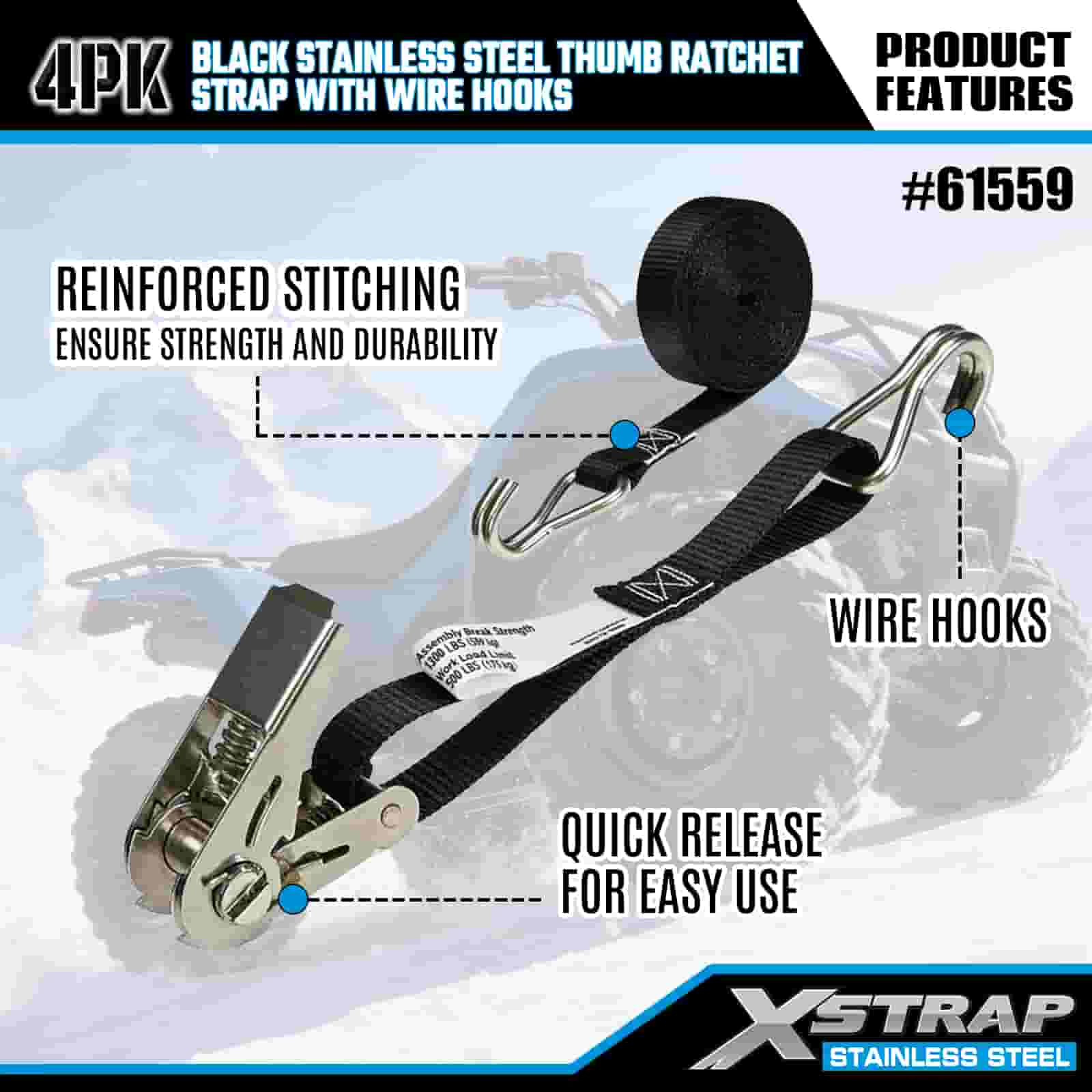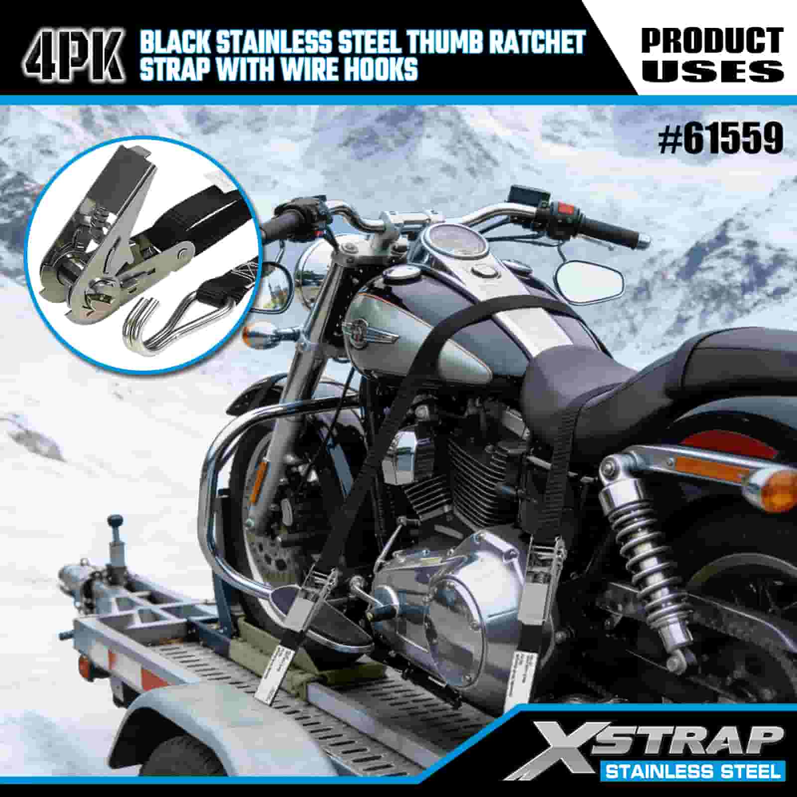 - Aventura e industrial resistente, construída para desempenho Projetada para transporte de motocicletas off-road e uso em locais de trabalho pesados, esta pulseira de catraca de aço inoxidável foi construída para lidar com lama, neve e desgaste diário. Confie nos 20 anos de experiência em controle de carga da XStrap para um porão em que você pode confiar, não importa o terreno.