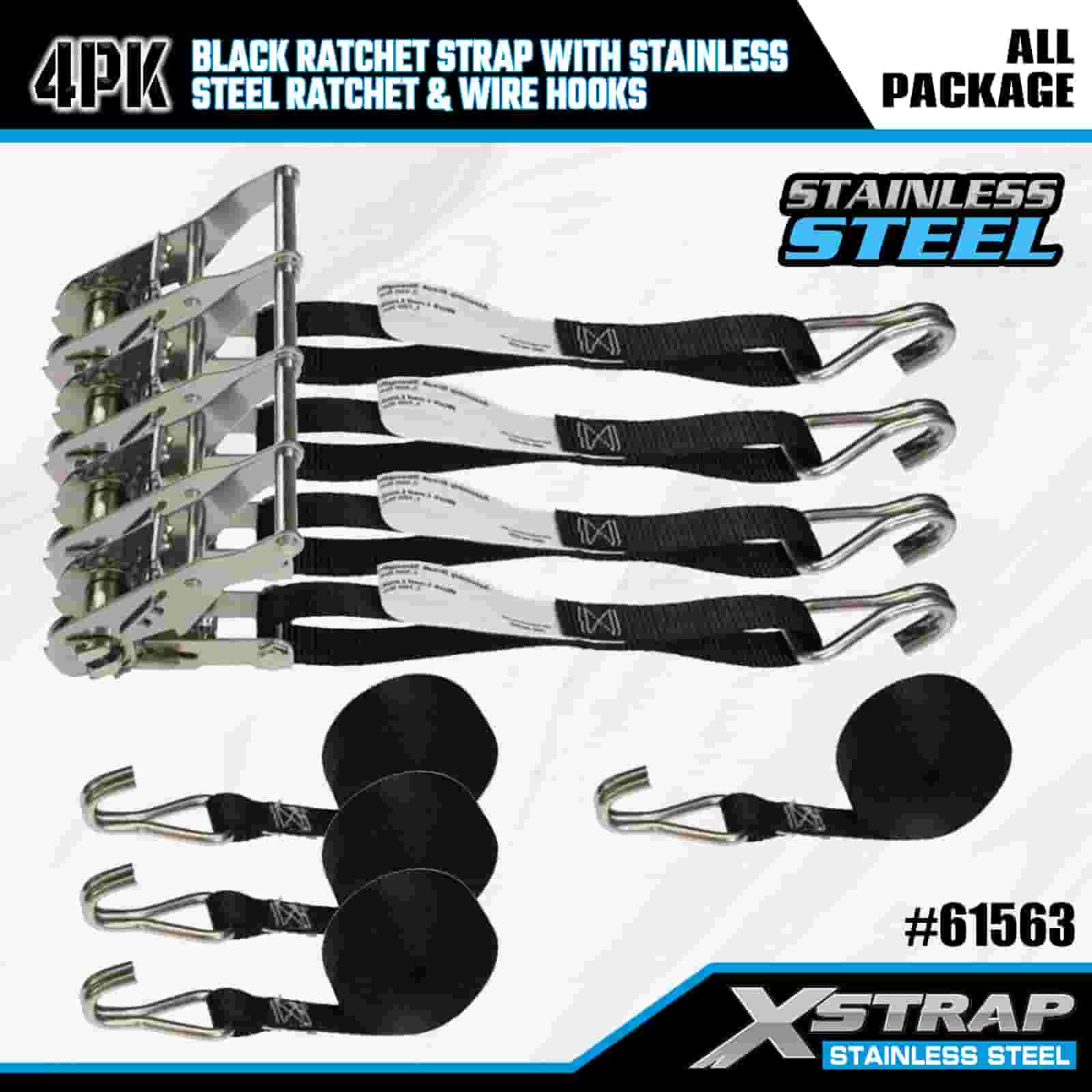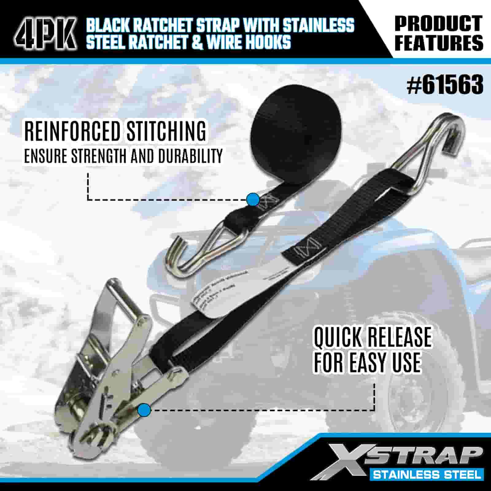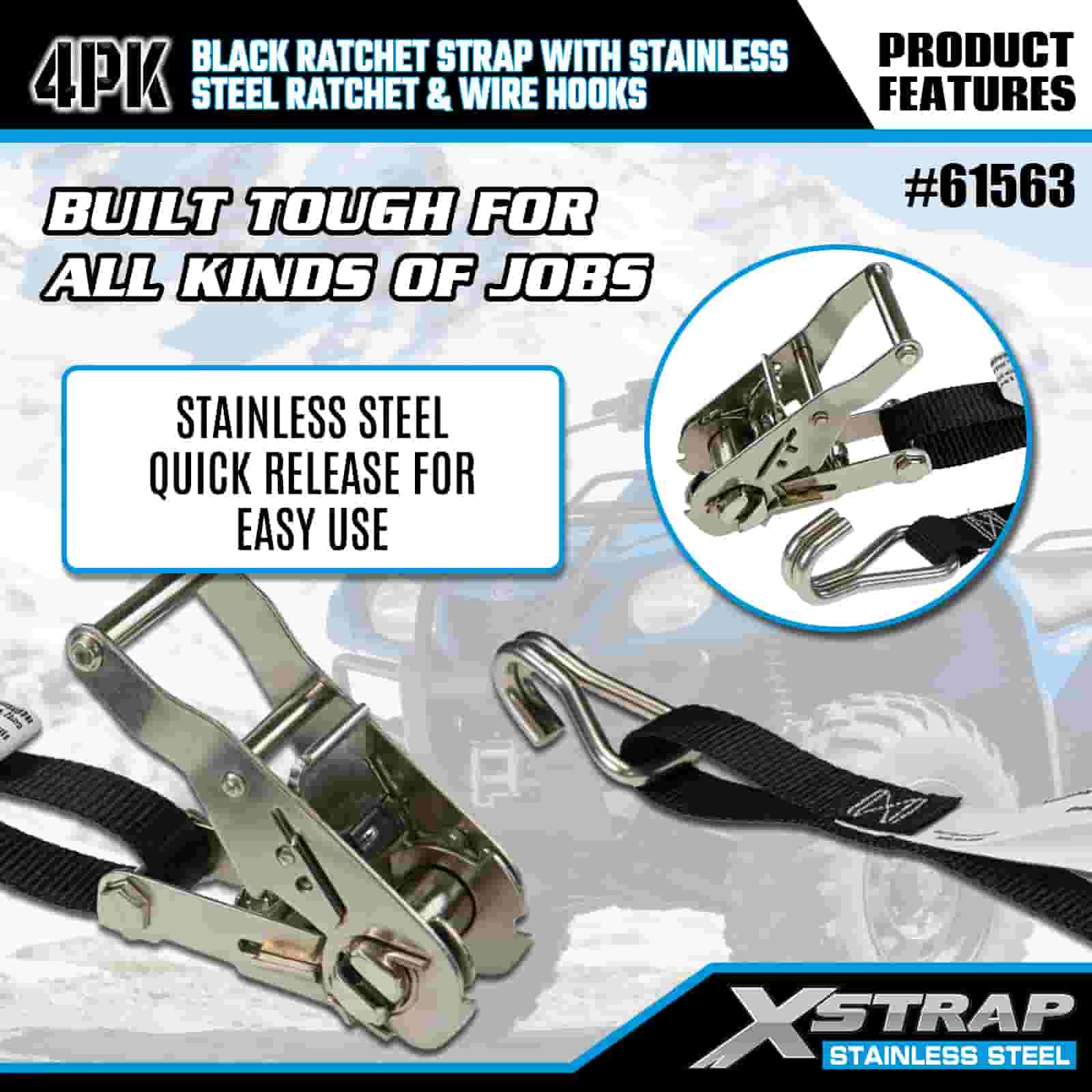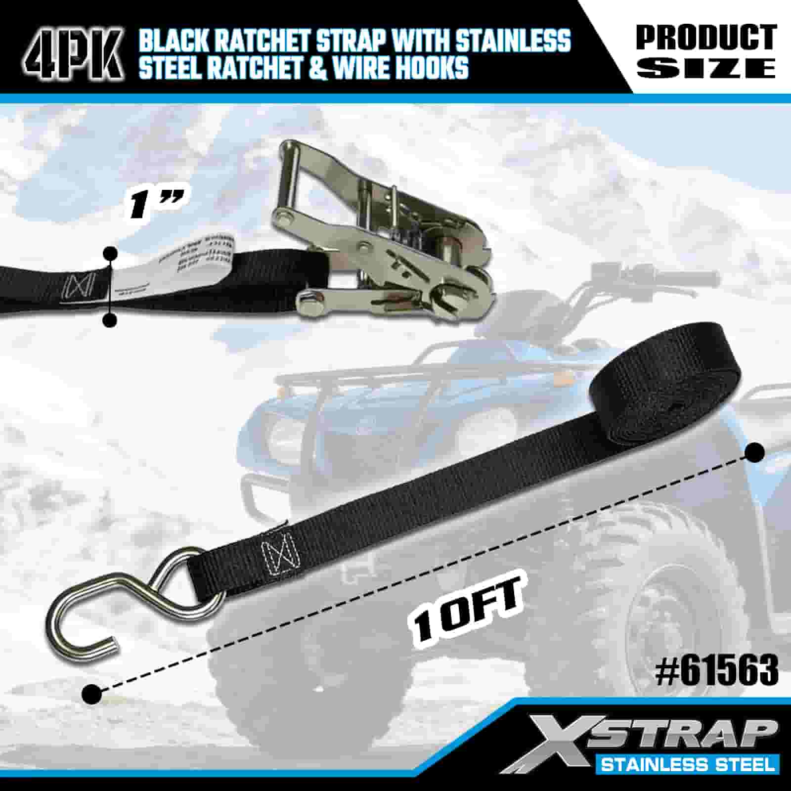 Correia de catraca preta Xstrap 4PK com catraca de aço inoxidável e ganchos de arame, cinta de amarração de poliéster de 1" x 10', cinta de catraca com capacidade de 1000 libras, cintas de fixação de amarração de carga com ganchos de arame para trailer, barco de esqui para trailer de cama plana, carro pequeno, equipamento pesado.