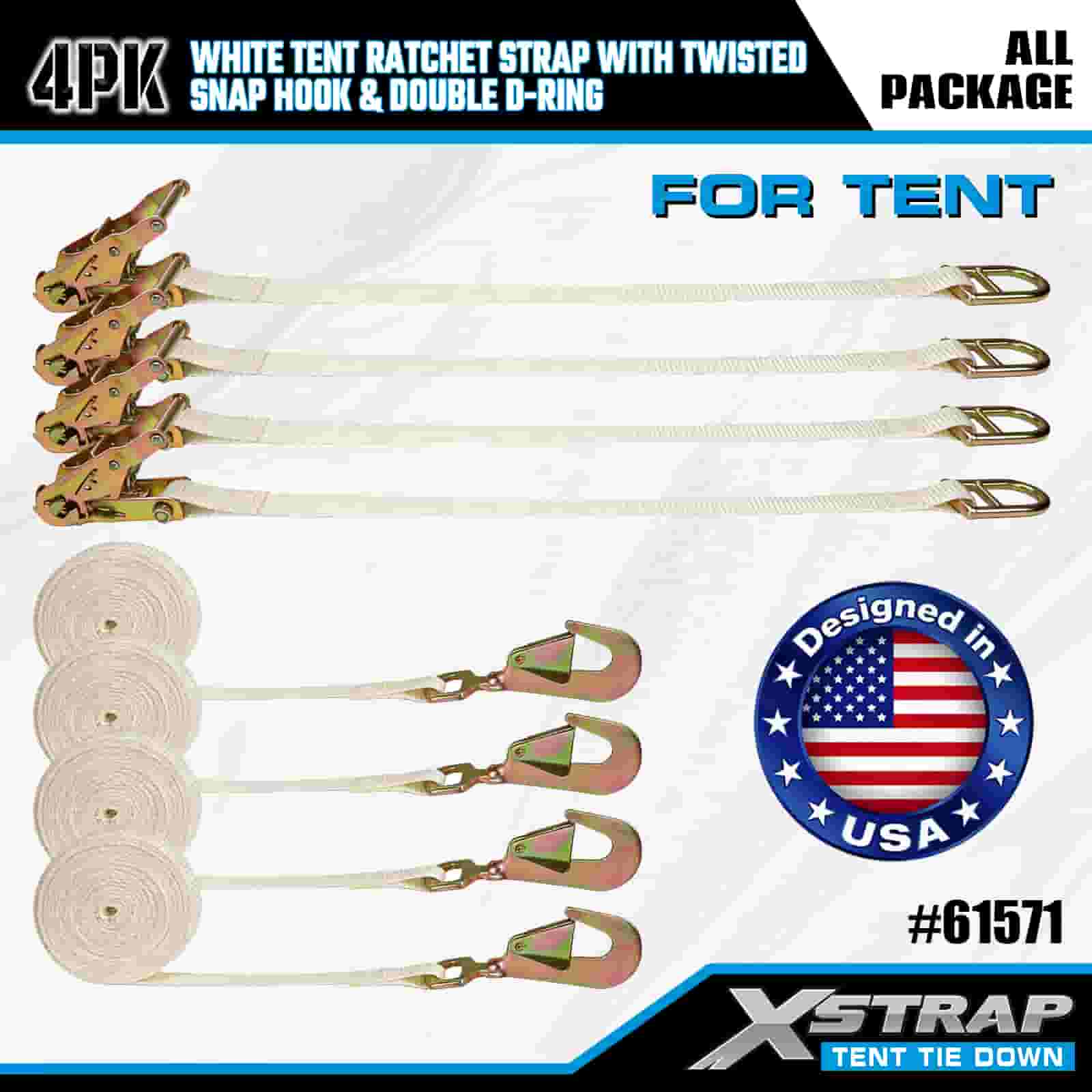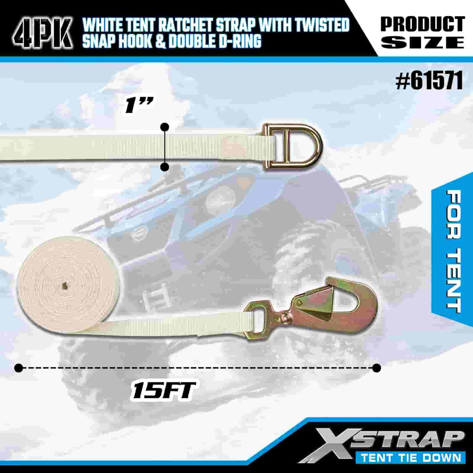 Correia de catraca de barraca branca Xstrap 4PK com mosquetão torcido e anel D duplo, cinta de amarração de poliéster de 1" x 15', cinta de catraca, capacidade de 1100 libras, tiras de fixação de amarração de carga com gancho de pressão torcido e anel D duplo para controle de carga, fixação de barraca.