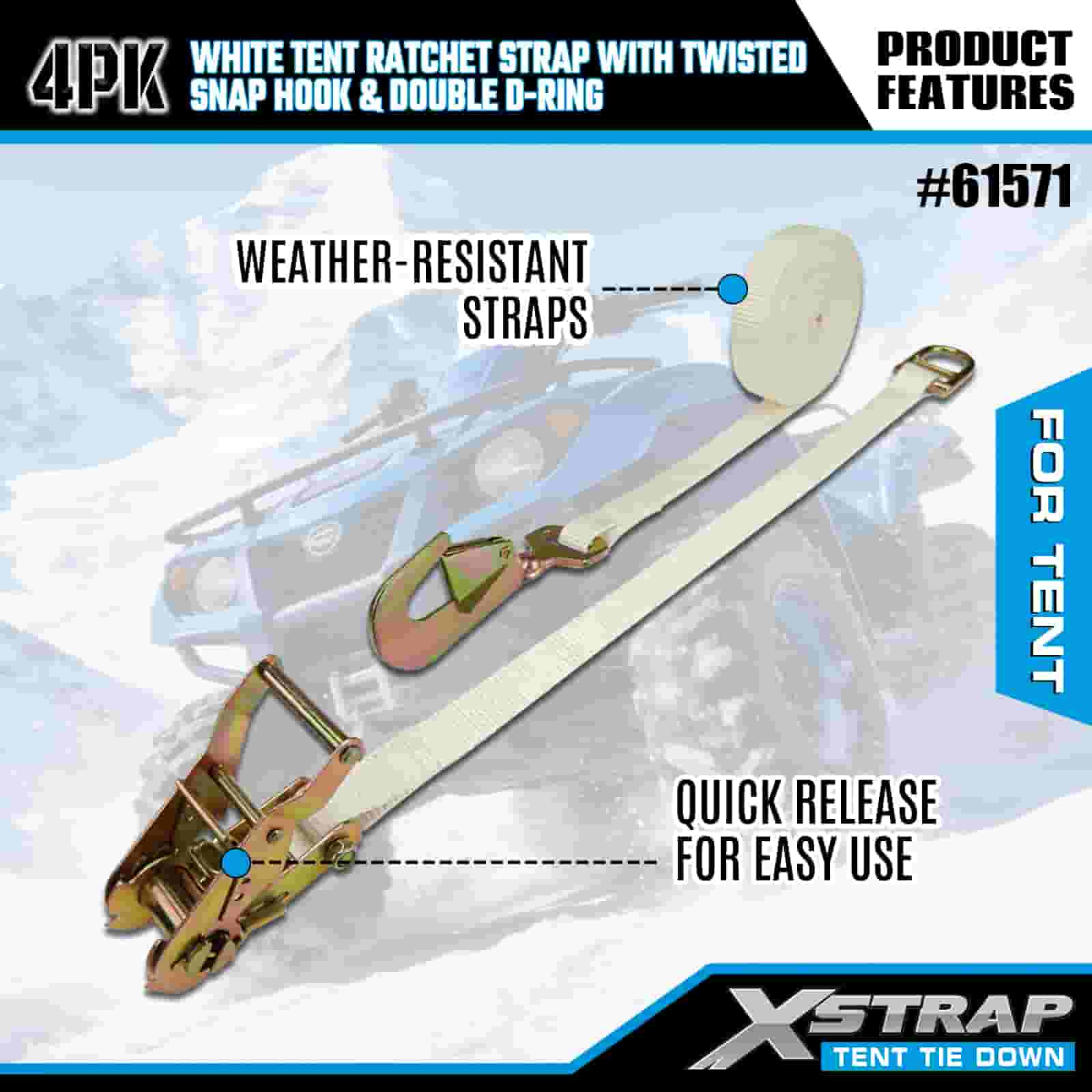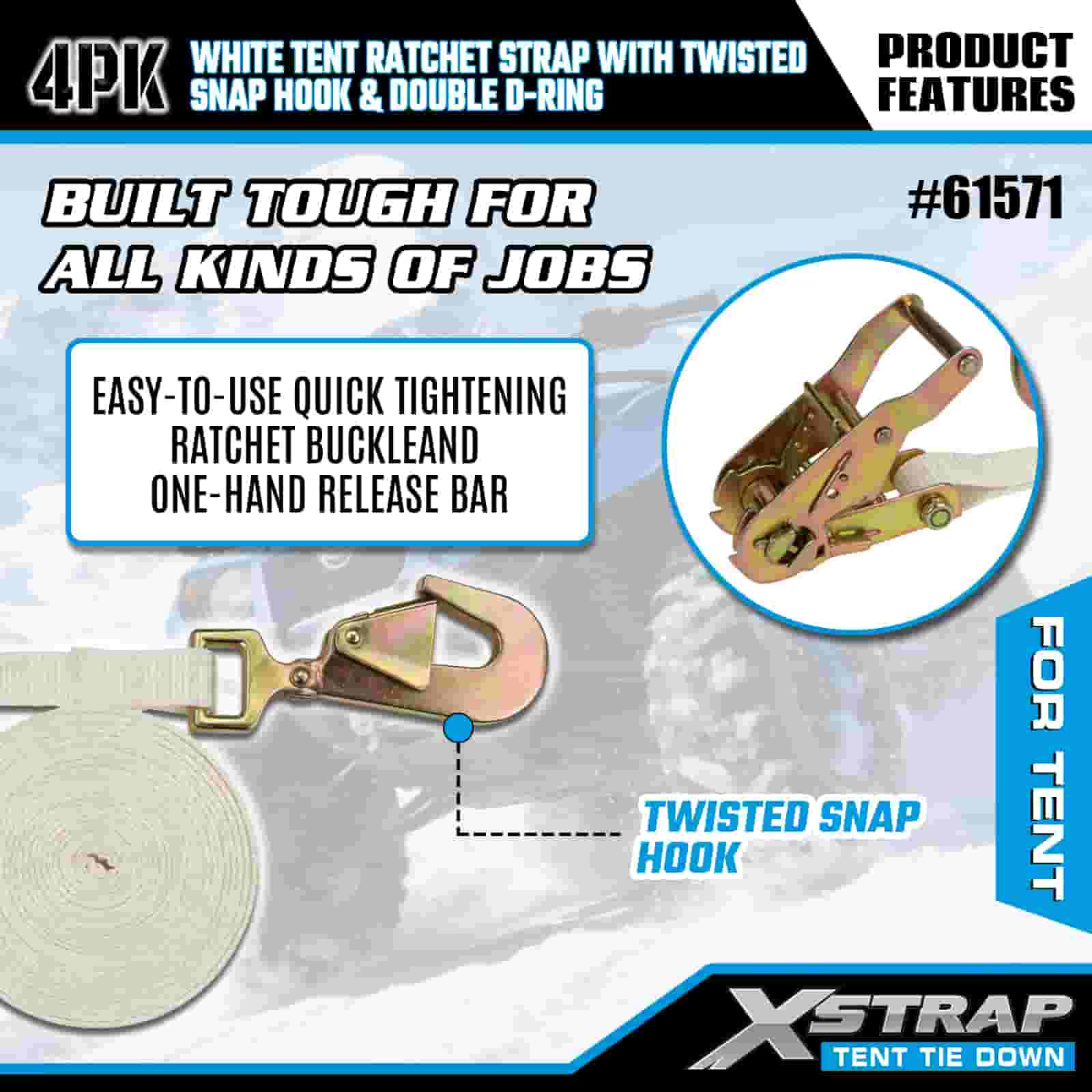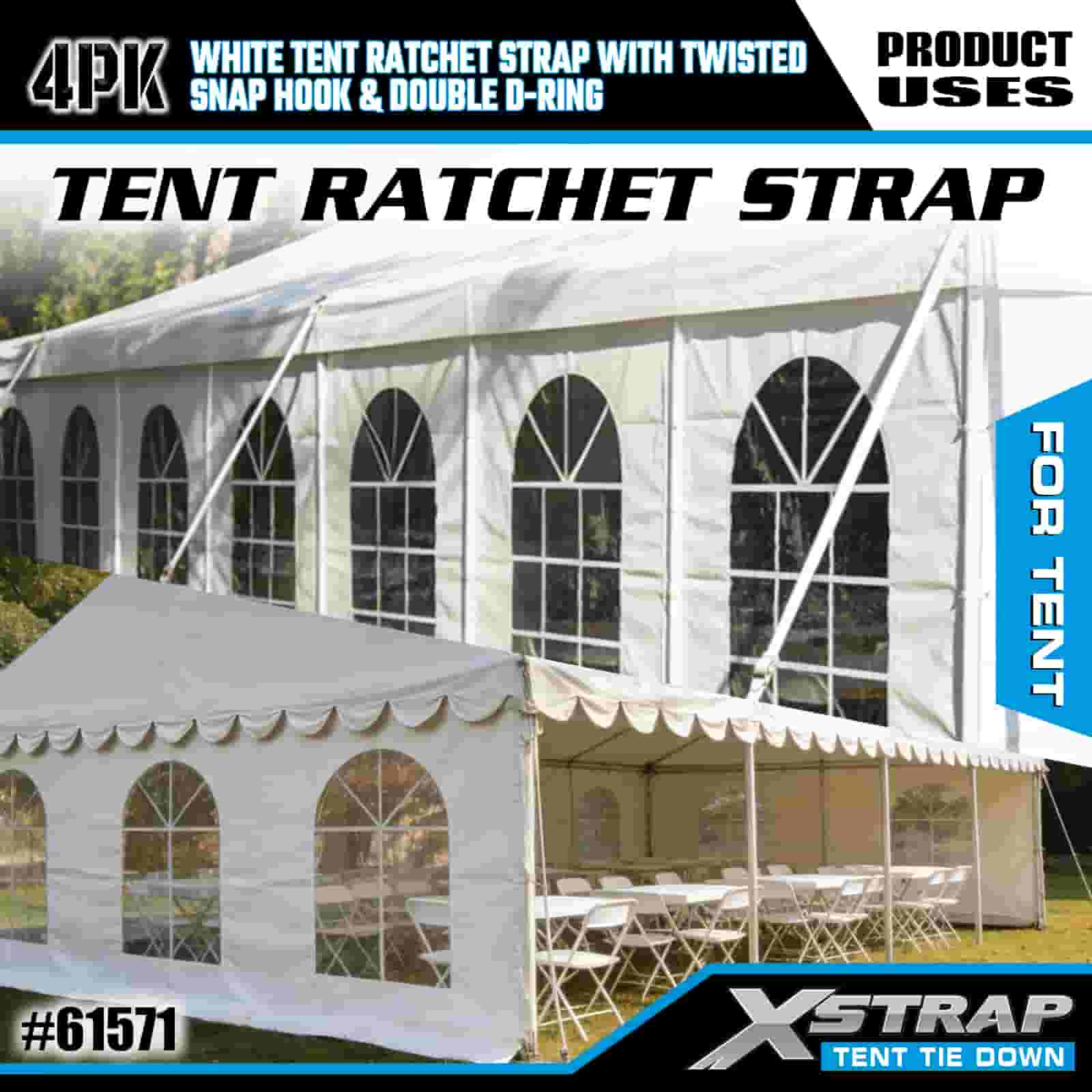 - Âncora de abrigo resistente, construída para eventos e tempestades: projetada para grandes tendas de eventos, coberturas de festas e abrigos de acampamento, este pacote de 4 tiras de catraca oferece uma fixação sólida que resiste a ventos tempestuosos e chuvas fortes. Com os 20 anos de experiência em controle de carga do XStrap, sua configuração permanece ancorada em todas as mudanças climáticas.