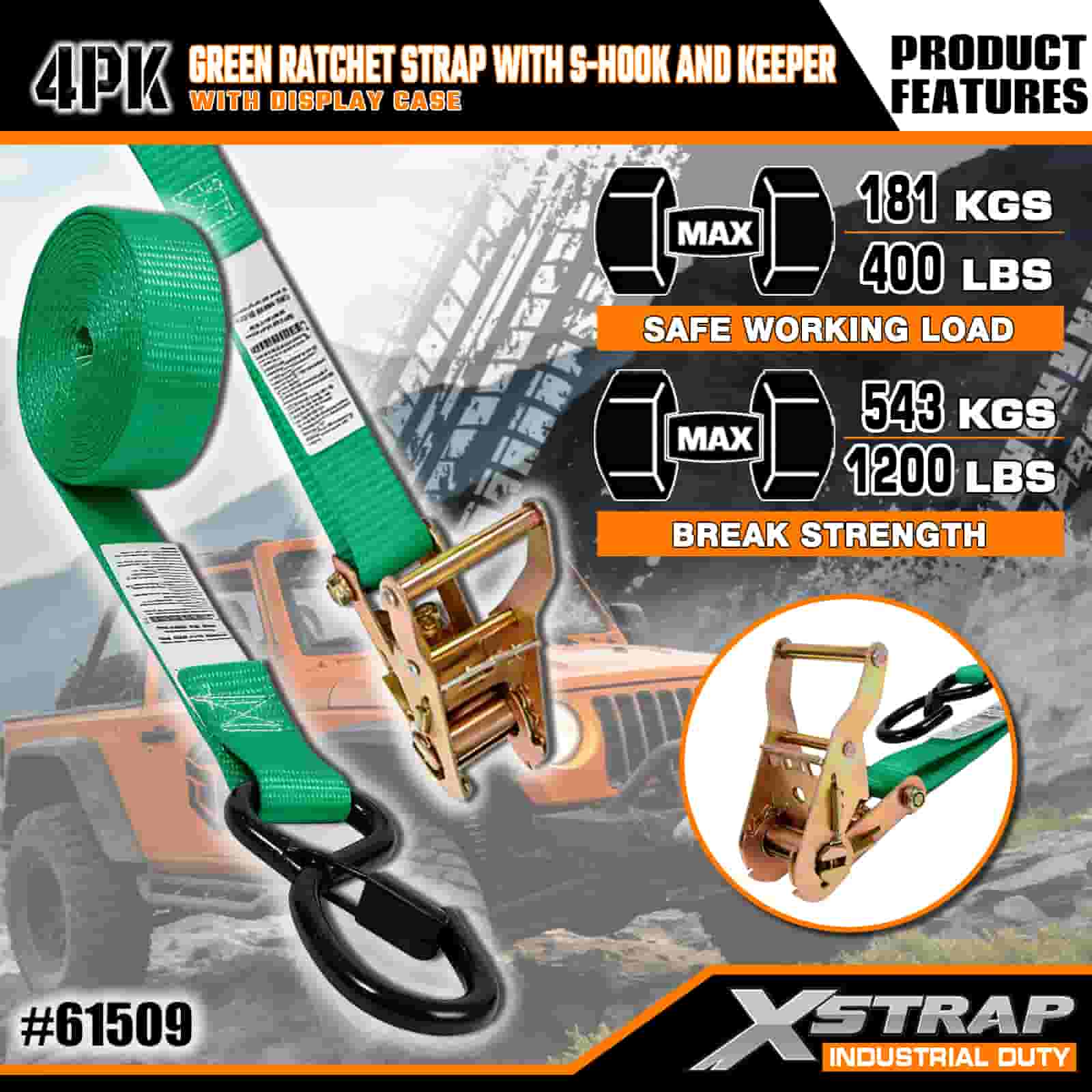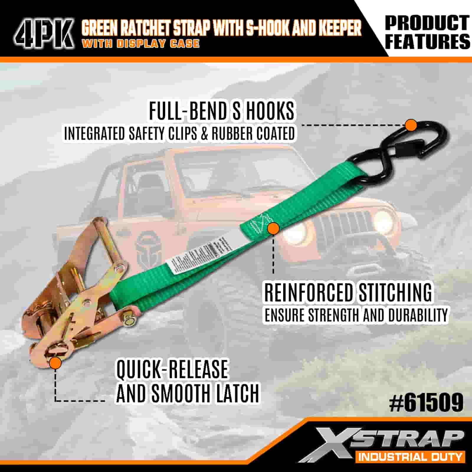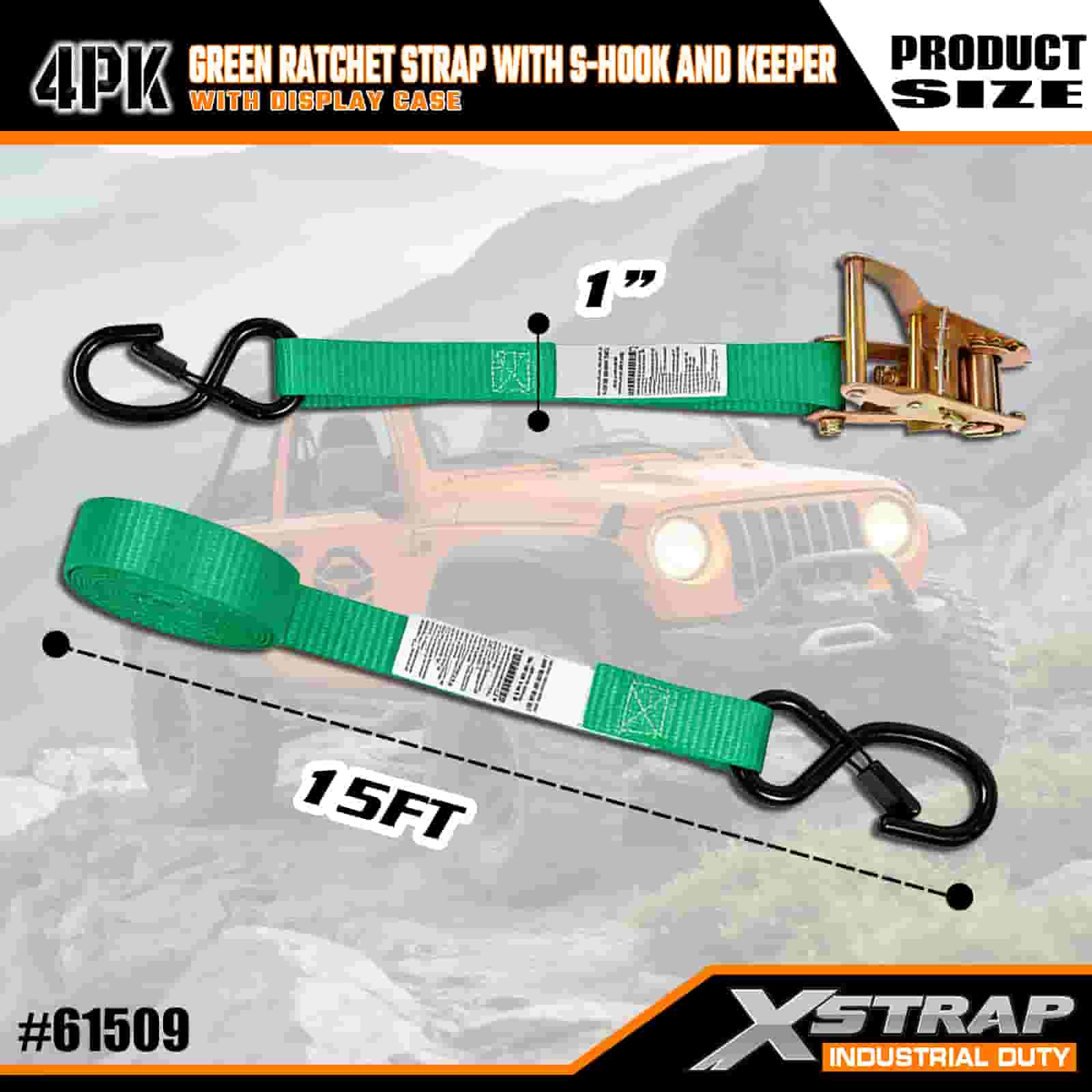 Correia de catraca Xstrap 4 Pack com ganchos de segurança S, alça de amarração de poliéster de 1" x 15', alça de catraca de tração, cintas de fixação de amarração de carga com capacidade de 400 libras com ganchos de segurança S para profissionais sérios para proteger trailer de carga, trailer de cama plana, barco de esqui, carro pequeno.