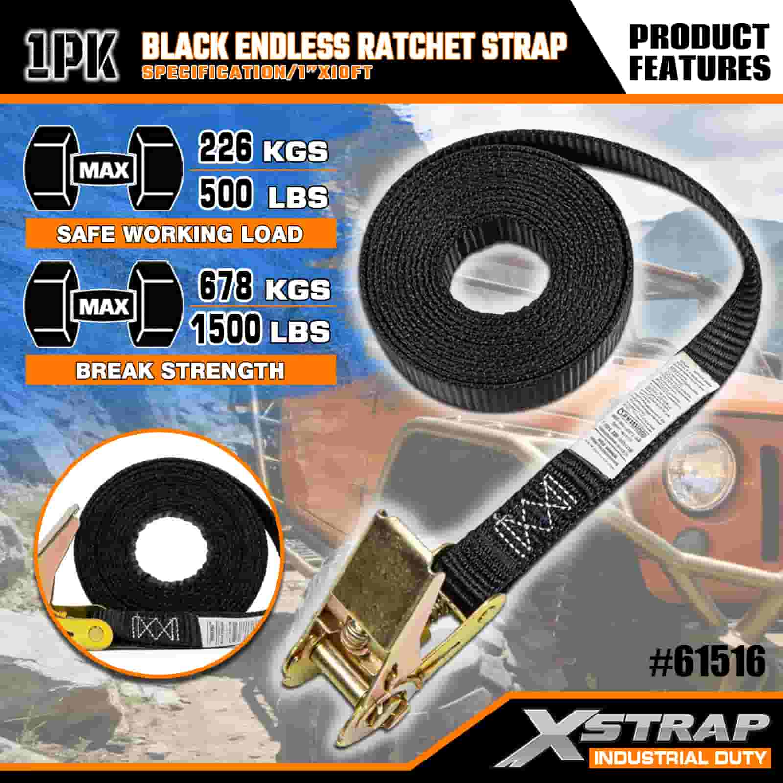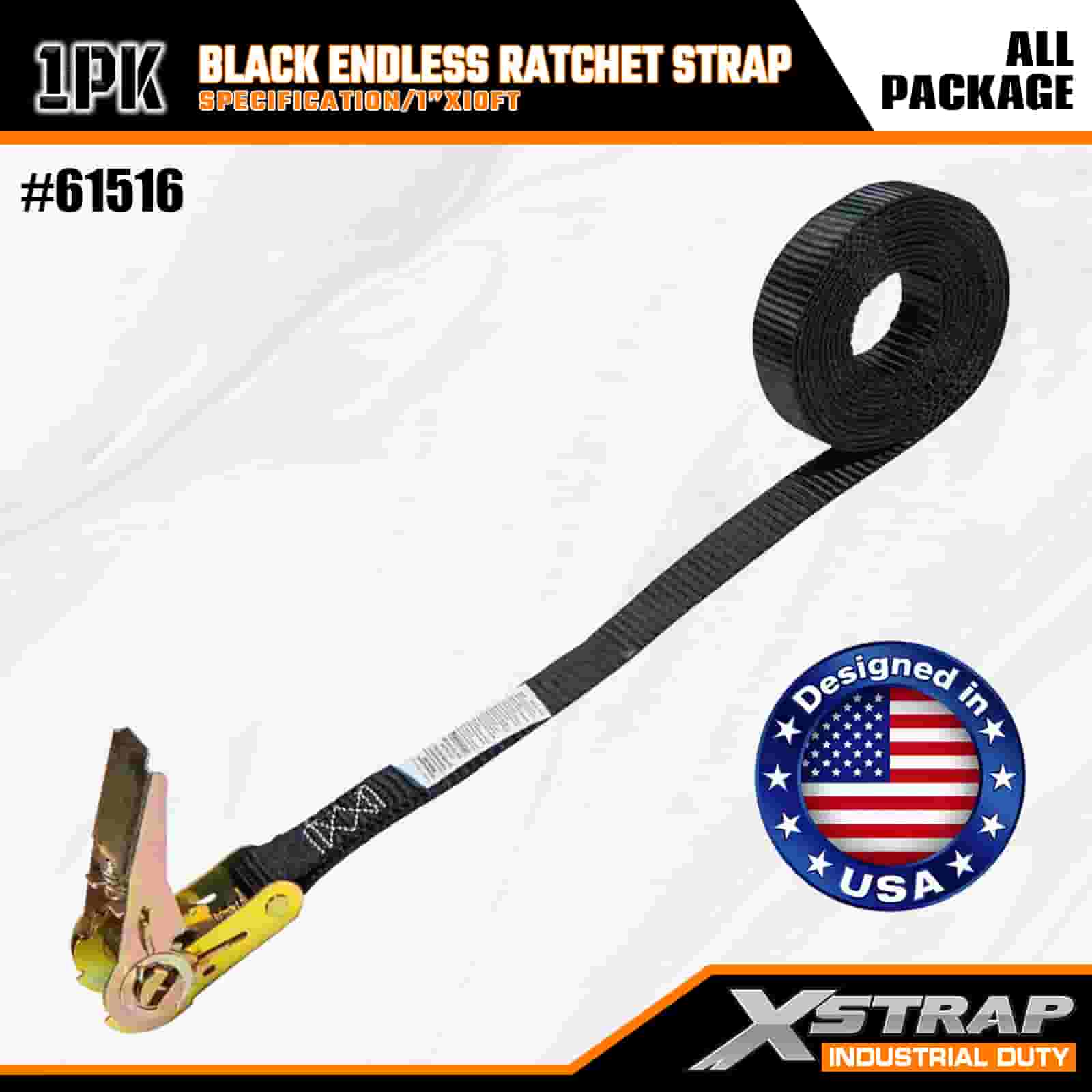 Correia de catraca sem fim preta Xstrap, alça de amarração de poliéster de 1" x 10', alça de catraca com capacidade de 500 libras, correias de fixação de amarração de carga para profissionais sérios para proteger trailer de carga, trailer de cama plana, barco de esqui, carro pequeno.