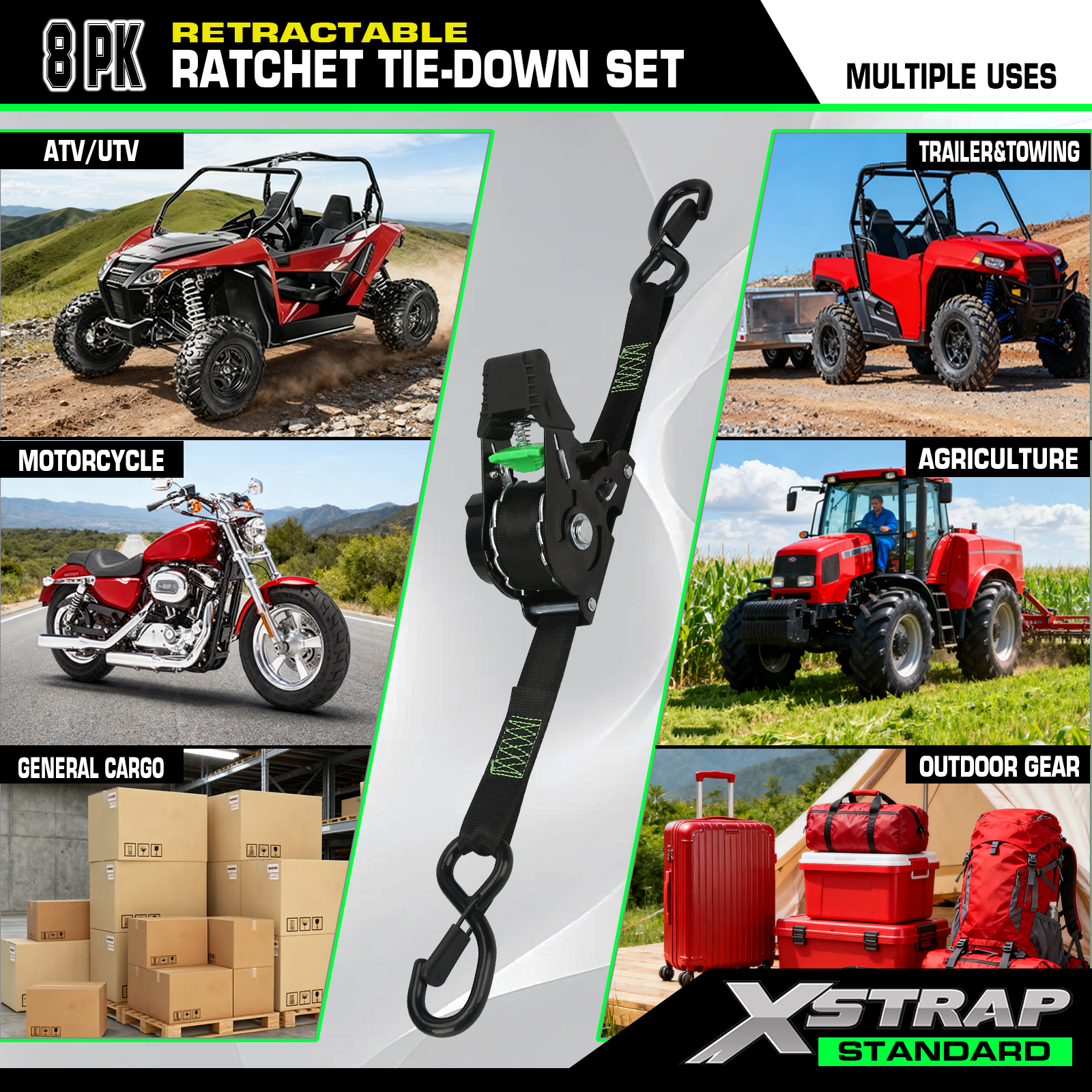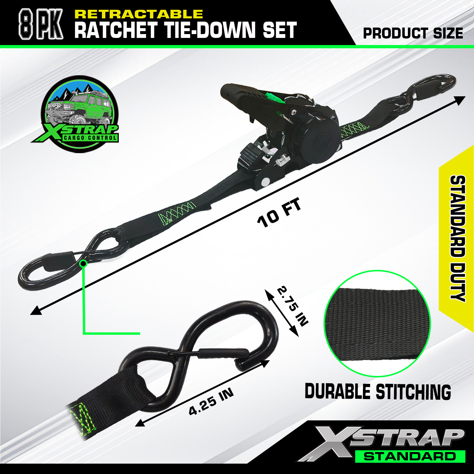 - Correias de amarração de catraca retráteis de alta qualidade - a carga de trabalho é de 500 libras e a carga limitada é de 1.500 libras. As tiras serão testadas antes de serem enviadas. Assim podemos garantir que sua carga esteja segura durante o transporte.