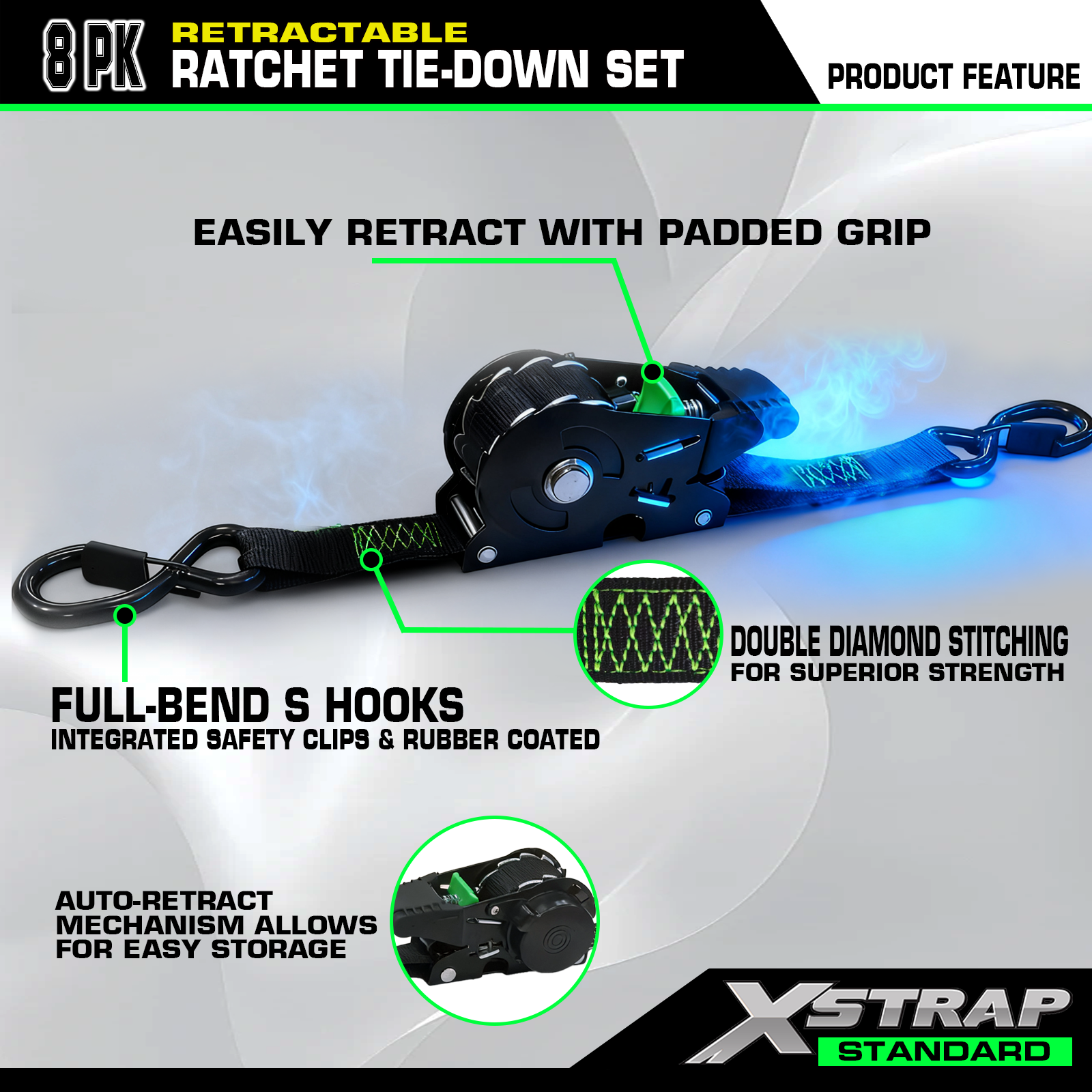 A cinta de catraca retrátil possui um mecanismo de retração automática integrado, permitindo que a cinta se retraia suavemente de volta ao seu alojamento após o uso. Isto não só mantém a pulseira limpa e protegida, mas também reduz significativamente o tempo de preparação e limpeza. A correia de poliéster de 10 pés fornece forte tensão e resistência confiável para motocicletas, ATVs, bicicletas, UTVs. A alça ergonômica da catraca é confortável de operar, oferecendo melhor aderência e menor esforço no aperto da carga.