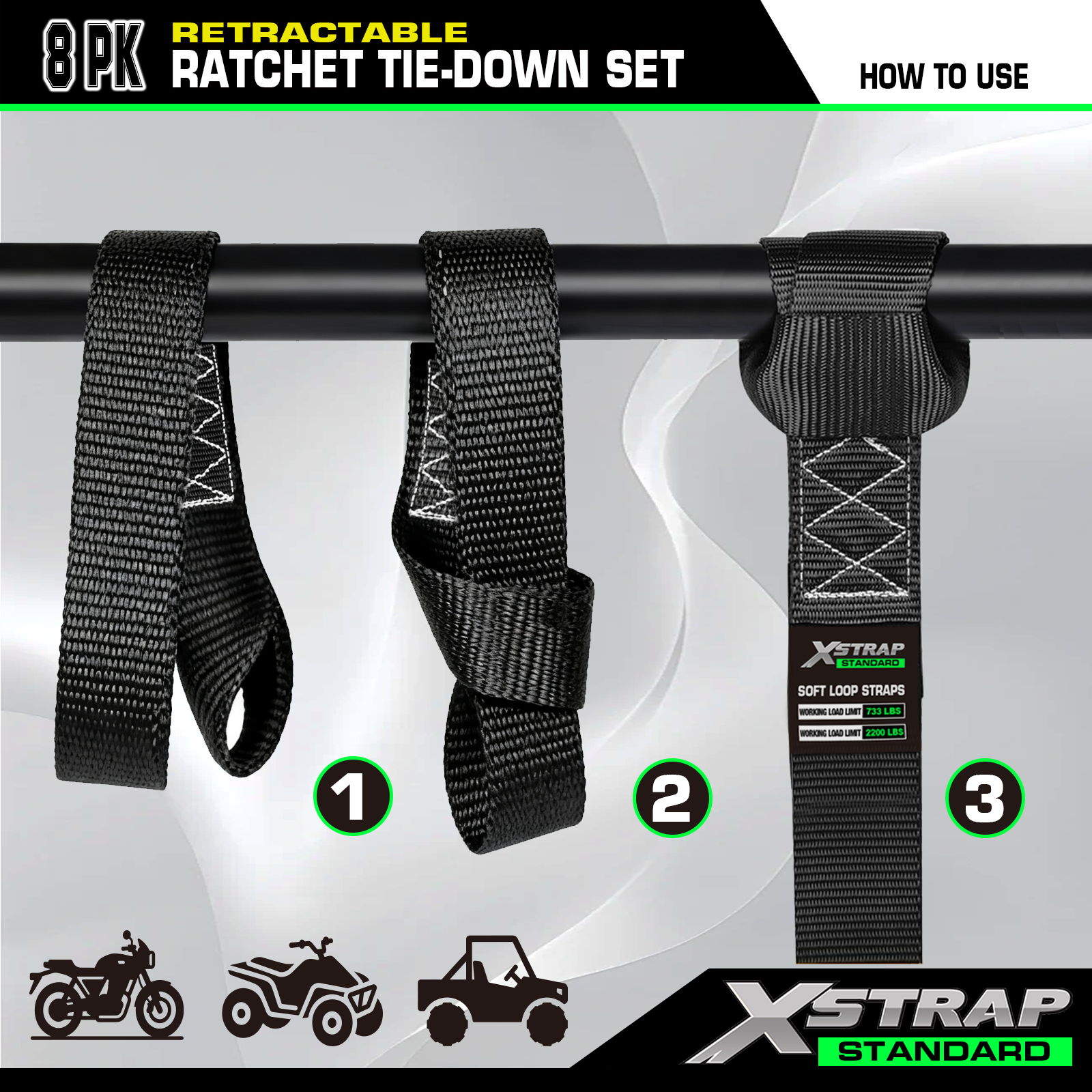 - Inclui 4 amarrações de laço macio - os laços macios podem ajudar a criar pontos de ancoragem em racks de teto, caçambas de caminhões e guidões. Assim, você pode usar nossas correias de catraca retráteis em muitos cenários.