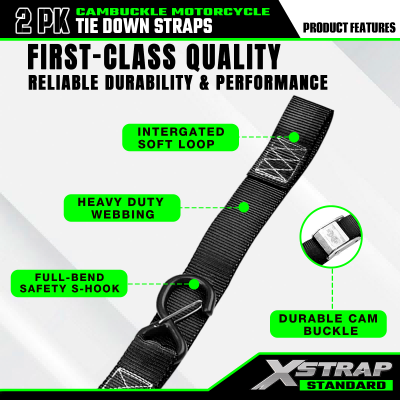 - Design padrão para serviços pesados: as tiras de amarração para motocicletas Xstrap são construídas com correias de alta resistência e têm uma resistência à ruptura de 2.200 libras, tornando-as a melhor escolha para proteger motocicletas, ATVs, UTVs e bicicletas sujas. Quando você usa nossas tiras com fivela de came para uma viagem rápida, as tiras de amarração Xstrap garantem durabilidade e segurança incomparáveis.
