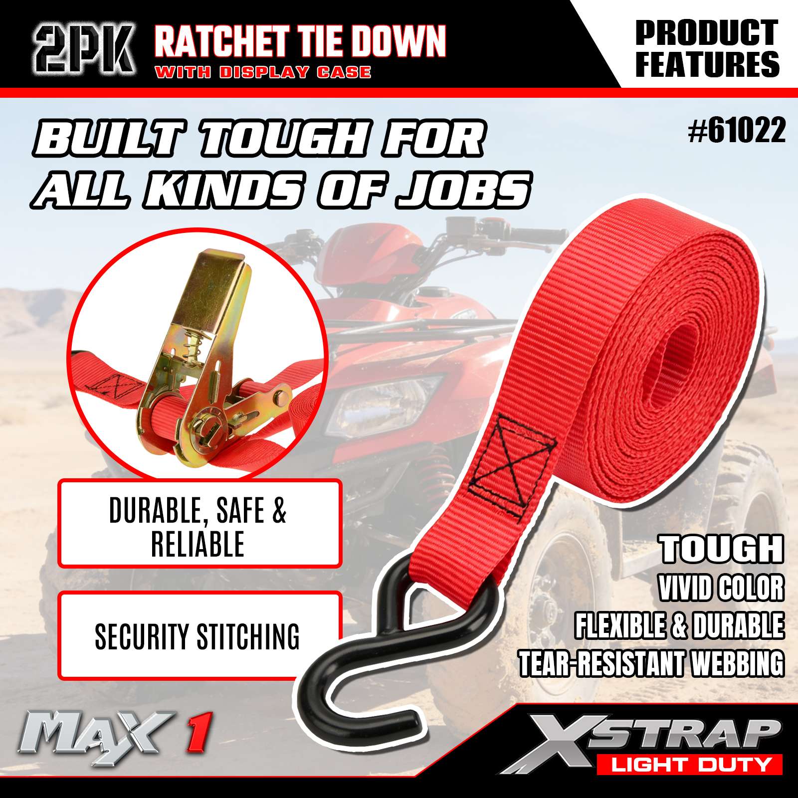 As correias de amarração de catraca são ferramentas de fixação leves projetadas para uma ampla variedade de aplicações de transporte e armazenamento. Eles são projetados para fixar cargas de forma segura e confiável, como motocicletas, quadriciclos, pequenos barcos, móveis, materiais de construção e outros itens grandes em picapes, reboques, caçambas e racks de teto. Construído tendo a durabilidade como princípio fundamental, este conjunto de 2 unidades é adequado para uso pessoal e comercial, oferecendo uma solução confiável para as necessidades diárias de transporte, movimentação, paisagismo e transporte recreativo. A embalagem expositora incluída garante que o produto esteja pronto para o varejo e apresentado visualmente para destacar suas principais características.