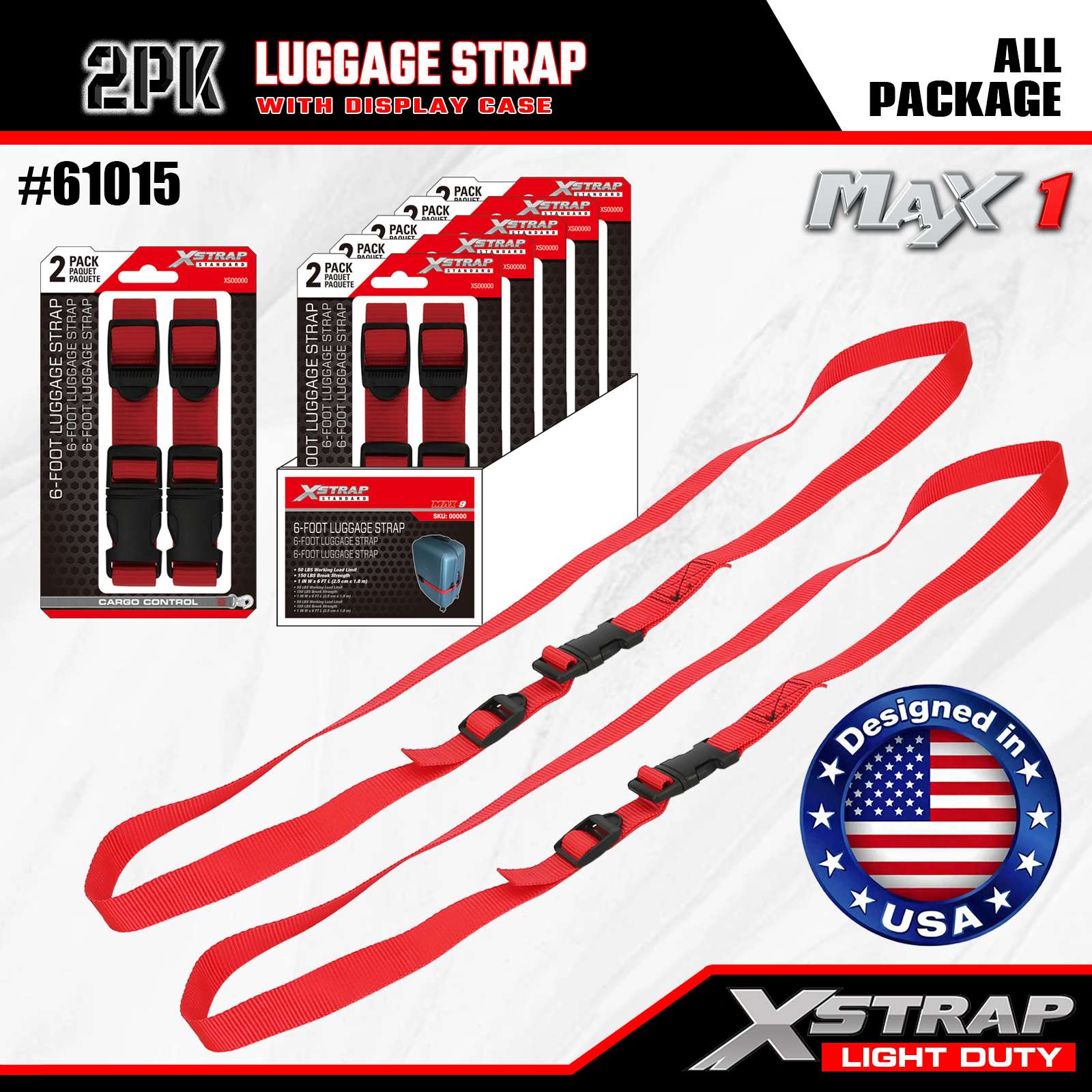 Pacote de 2 alças de bagagem ajustáveis Xstrap, 1" x 6' - tampa de carga de 50 lbs - 150 lbs de resistência à ruptura - alças de carga para malas, fácil de identificar O conector do cinto de viagem mantém a mala unida, prolonga a vida útil da bolsa, a alça conecta duas bolsas, vermelha