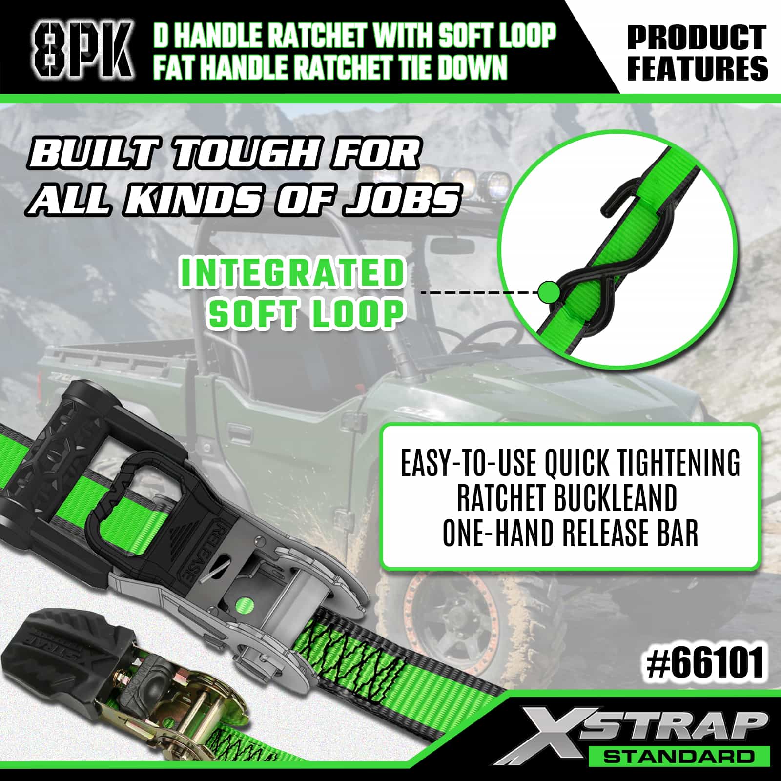 - Trava de liberação rápida com uma mão: projetada com uma barra de liberação responsiva com uma mão que permite o ajuste sem esforço da alça ou a remoção completa, simplificando o manuseio da carga para uma fixação e liberação mais rápida e segura.