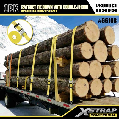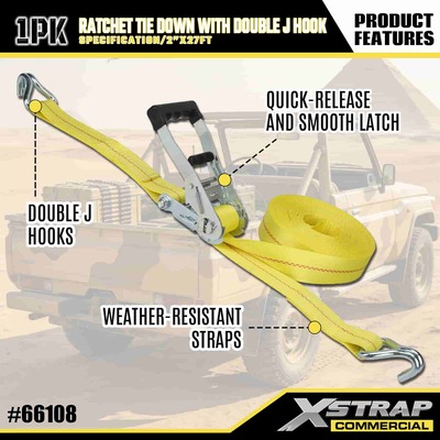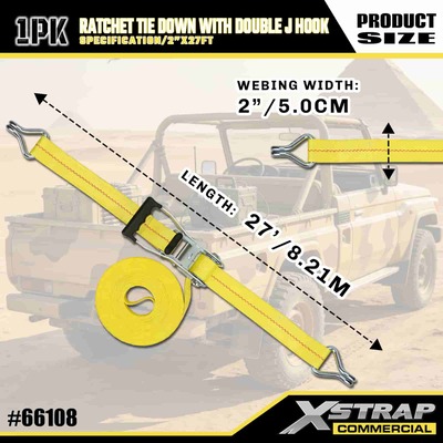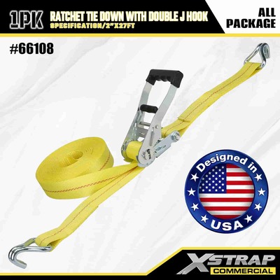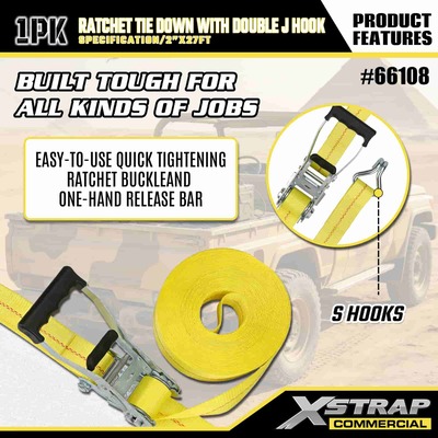 Xstrap Catraca Amarração com ganchos J duplos, alça de amarração de poliéster de 2" x 27' Alça de catraca de tração, 3.333 libras de capacidade de amarração de carga, tiras de fixação com ganchos J duplos para caminhonete de controle de carga, SUV, racks superiores de carro para motocicleta.