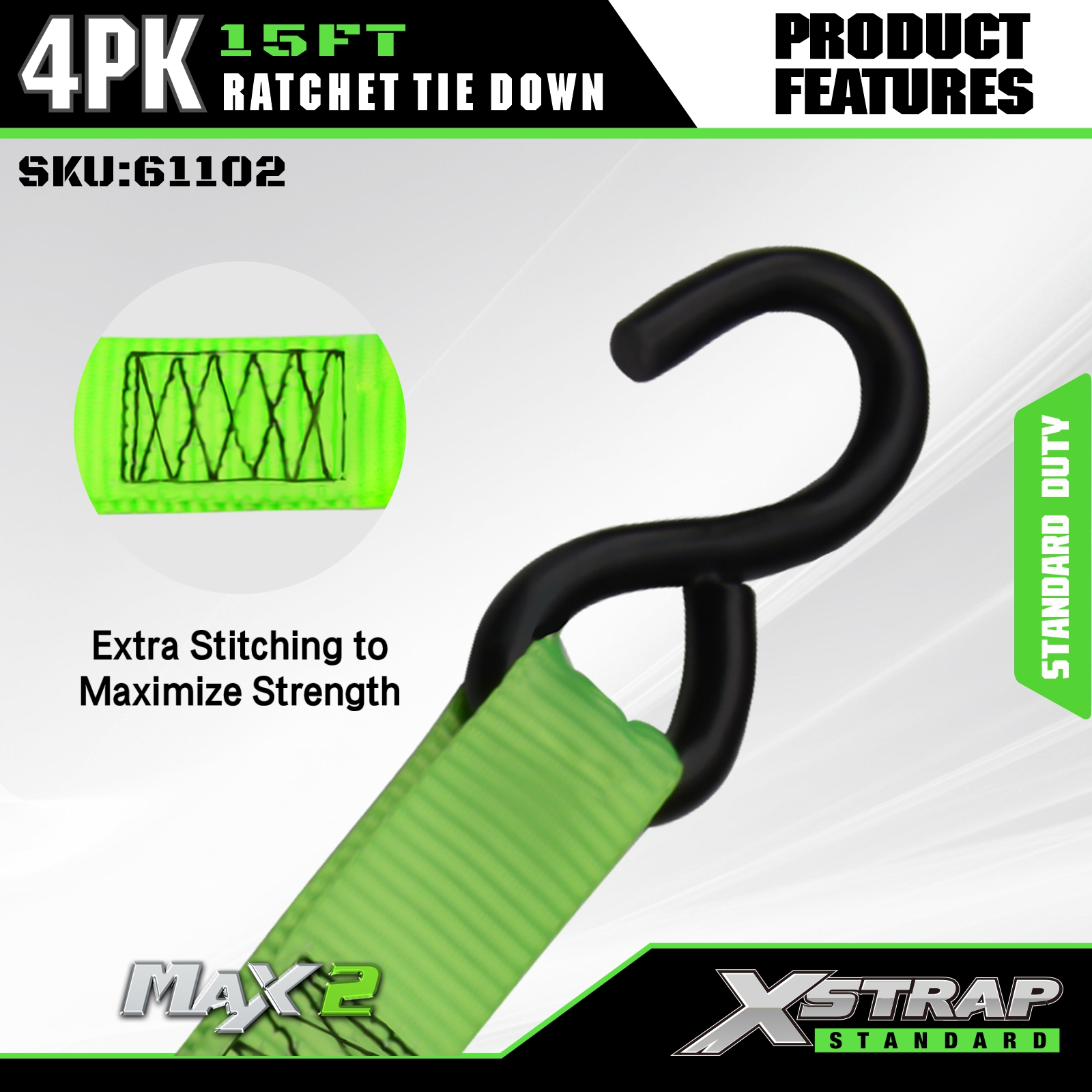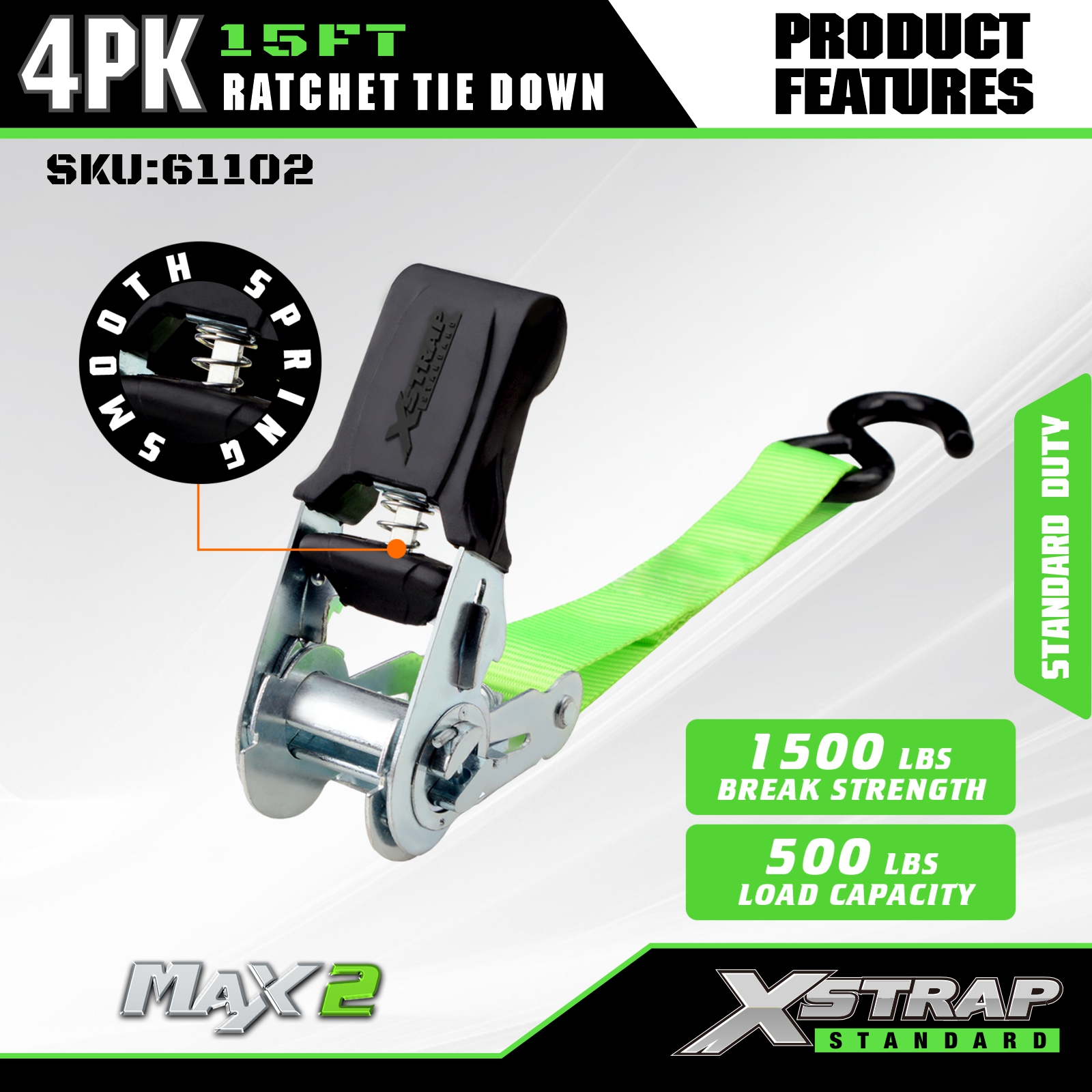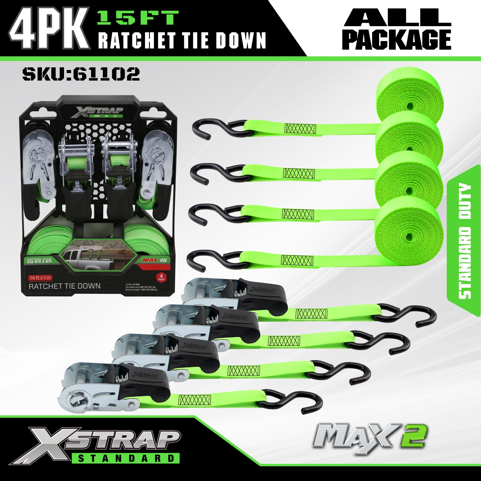 Correias de amarração de catraca Xstrap 4 PK 15 pés - 500 libras de capacidade de carga 1500 libras de resistência à ruptura - correias de carga para aparelhos móveis, equipamentos de gramado, motocicletas.